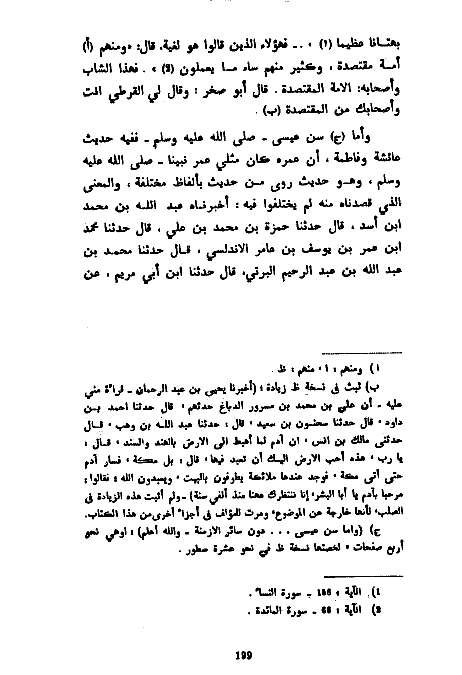 بُهْتَانًا عَظِيمًا فَهَؤُلَاءِ الَّذِينَ قَالُوا هُوَ لَغَيَّةٌ قال ومنهم أُمَّةٌ مُقْتَصِدَةٌ وَكَثِيرٌ مِنْهُمْ سَاءَ مَا يَعْمَلُونَ فهذا الشاب وأصحابه الأمةالمقتصدة قال أبو صخر وقال لي القرطي أَنْتَ وَأَصْحَابُكَ مِنَ الْمُقْتَصِدَةِ وَأَمَّا سِنُّ عِيسَى صَلَّى اللَّهُ عَلَيْهِ وَسَلَّمَ فَفِيهِ حَدِيثُ عَائِشَةَ وفاطمة أن عمره كان مثلي عُمْرِ نَبِيِّنَا صَلَّى اللَّهُ عَلَيْهِ وَسَلَّمَ وَهُوَ حديث روي من حديث بألفاظ وَالْمَعْنَى الَّذِي قَصَدْنَاهُ مِنْهُ لَمْ يَخْتَلِفُوا فِيهِ أَخْبَرَنَا عَبْدُ اللَّهِ بْنُ مُحَمَّدِ بْنِ أَسَدٍ قَالَ حَدَّثَنَا حَمْزَةُ بْنُ مُحَمَّدِ بْنِ عَلِيٍّ قَالَ حَدَّثَنَا مُحَمَّدُ بْنُ عُمَرَ بْنِ يُوسُفَ بْنِ عَامِرٍ الْأَنْدَلُسِيُّ قَالَ حَدَّثَنَا مُحَمَّدُ بْنُ عَبْدِ اللَّهِ بْنِ عَبْدِ الرَّحِيمِ الْبَرْتِيُّ قَالَ حَدَّثَنَا ابْنُ أَبِي مَرْيَمَ عَنْ
