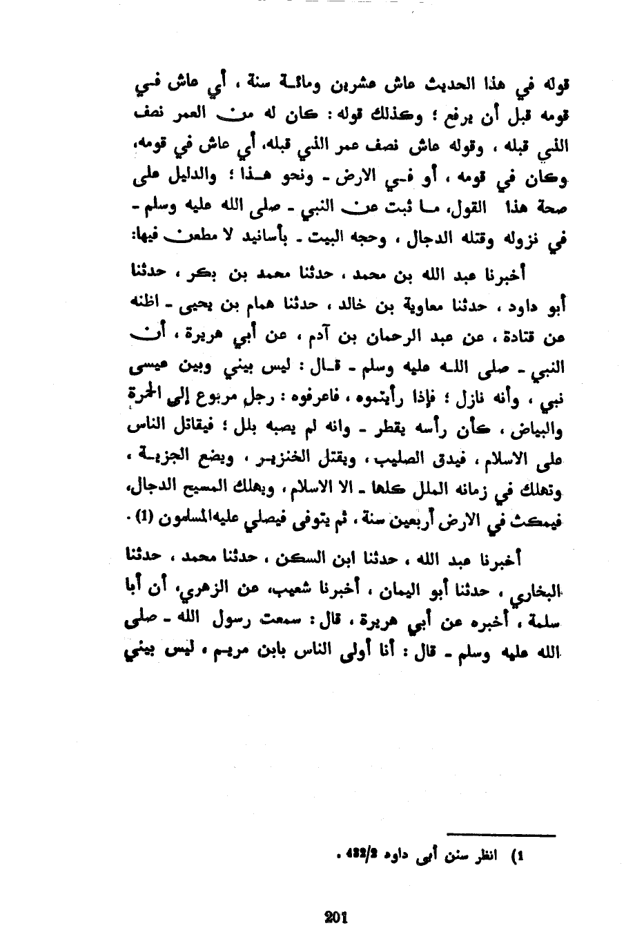 قَوْلُهُ فِي هَذَا الْحَدِيثِ عَاشَ عِشْرِينَ وَمِائَةَ سَنَةٍ أَيْ عَاشَ فِي قَوْمِهِ قَبْلَ أَنْ يُرْفَعَ وَكَذَلِكَ قَوْلُهُ كَانَ لَهُ مِنَ الْعُمُرِ نِصْفُ الَّذِي قَبْلَهُ وَقَوْلُهُ عَاشَ نِصْفَ عُمُرِ الَّذِي قَبْلَهُ أَيْ عَاشَ فِي قَوْمِهِ وَكَانَ فِي قَوْمِهِ أَوْ فِي الْأَرْضِ وَنَحْوَ هَذَا وَالدَّلِيلُ عَلَى صِحَّةِ هَذَا الْقَوْلِ مَا ثَبَتَ عَنِ النَّبِيِّ صَلَّى اللَّهُ عَلَيْهِ وَسَلَّمَ فِي نُزُولِهِ وَقَتْلِهِ الدَّجَّالَ وَحَجِّهِ الْبَيْتَ بِأَسَانِيدَ لَا مَطْعَنَ فِيهَا أَخْبَرَنَا عَبْدُ اللَّهِ بْنُ مُحَمَّدٍ حَدَّثَنَا مُحَمَّدُ بْنُ بَكْرٍ حَدَّثَنَا أَبُو دَاوُدَ حَدَّثَنَا مُعَاوِيَةُ بْنُ خَالِدٍ حَدَّثَنَا هَمَّامُ بْنُ يحيى أظنه عن قتادة عن عبد الرحمان بْنِ آدَمَ عَنْ أَبِي هُرَيْرَةَ أَنَّ النَّبِيَّ صَلَّى اللَّهُ عَلَيْهِ وَسَلَّمَ قَالَ لَيْسَ بَيْنِي وَبَيْنَ عِيسَى نَبِيٌّ وَأَنَّهُ نَازِلٌ فَإِذَا رَأَيْتُمُوهُ فَاعْرِفُوهُ رَجُلٌ مَرْبُوعٌ إِلَى الْحُمْرَةِ وَالْبَيَاضِ كَأَنَّ رَأْسَهُ يَقْطُرُ وَأَنَّهُ لَمْ يُصِبْهُ بَلَلٌ فَيُقَاتِلُ النَّاسَ عَلَى الْإِسْلَامِ فَيَدُقُّ الصَّلِيبَ وَيَقْتُلُ الْخِنْزِيرَ وَيَضَعُ الْجِزْيَةَ وَتَهْلِكُ فِي زَمَانِهِ الْمِلَلُ كُلُّهَا إِلَّا الْإِسْلَامَ وَيَهْلِكُ الْمَسِيحُ الدَّجَّالُ فَيَمْكُثُ فِي الْأَرْضِ أَرْبَعِينَ سَنَةً ثُمَّ يُتَوَفَّى فَيُصَلِّي عَلَيْهِ الْمُسْلِمُونَ أَخْبَرَنَا عَبْدُ اللَّهِ حَدَّثَنَا ابْنُ السَّكَنِ حَدَّثَنَا مُحَمَّدٌ حَدَّثَنَا الْبُخَارِيُّ حَدَّثَنَا أَبُو الْيَمَانِ أَخْبَرَنَا شُعَيْبٌ عَنِ الزُّهْرِيِّ أَنَّ أَبَا سَلَمَةَ أَخْبَرَهُ عَنْ أَبِي هُرَيْرَةَ قَالَ سَمِعْتُ رَسُولَ اللَّهِ صَلَّى اللَّهُ عَلَيْهِ وَسَلَّمَ قَالَ أَنَا أَوْلَى النَّاسِ بِابْنِ مَرْيَمَ لَيْسَ بَيْنِي