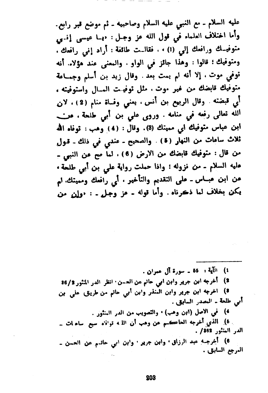 عَلَيْهِ السَّلَامُ مَعَ النَّبِيِّ عَلَيْهِ السَّلَامُ وَصَاحِبَيْهِ ثَمَّ مَوْضِعُ قَبْرٍ رَابِعٍ وَأَمَّا اخْتِلَافُ الْعُلَمَاءِ في قول الله عز وجل يا عيسى إِنِّي مُتَوَفِّيكَ وَرَافِعُكَ إِلَيَّ فَقَالَتْ طَائِفَةٌ أَرَادَ إِنِّي رَافِعُكَ وَمُتَوَفِّيكَ قَالُوا وَهَذَا جَائِزٌ فِي الواو والمعنى عند هؤلاء أنه توفي مَوْتٍ إِلَّا أَنَّهُ لَمْ يَمُتْ بَعْدُ وَقَالَ زَيْدُ بْنُ أَسْلَمَ وَجَمَاعَةٌ مُتَوَفِّيكَ قَابِضُكَ مِنْ غَيْرِ مَوْتٍ مِثْلُ تَوَفَّيْتُ الْمَالَ وَاسْتَوْفَيْتُهُ أَيْ قَبَضْتُهُ وَقَالَ الرَّبِيعُ بْنُ أَنَسٍ يَعْنِي وَفَاةَ مَنَامٍ لِأَنَّ اللَّهَ تَعَالَى رَفَعَهُ فِي مَنَامِهِ وَرَوَى عَلِيُّ بْنُ أَبِي طَلْحَةَ عَنِ ابْنِ عَبَّاسٍ مُتَوَفِّيكَ أَيْ مُمِيتُكَ وَقَالَ وَهْبٌ تَوَفَّاهُ اللَّهُ ثَلَاثَ سَاعَاتٍ مِنَ النَّهَارِ وَالصَّحِيحُ عِنْدِي فِي ذَلِكَ قَوْلُ مَنْ قَالَ مُتَوَفِّيكَ قَابِضُكَ مِنَ الْأَرْضِ لِمَا صَحَّ عَنِ النَّبِيِّ عَلَيْهِ السَّلَامُ مِنْ نُزُولِهِ وَإِذَا حُمِلَتْ رِوَايَةُ عَلِيِّ بْنِ أَبِي طَلْحَةَ عَنِ ابْنِ عَبَّاسٍ عَلَى التَّقْدِيمِ وَالتَّأْخِيرِ أَيْ رَافِعُكَ وَمُمِيتُكَ لَمْ يَكُنْ بِخِلَافٍ لِمَا ذَكَرْنَاهُ وَأَمَّا قَوْلُهُ عَزَّ وَجَلَّ وإن من