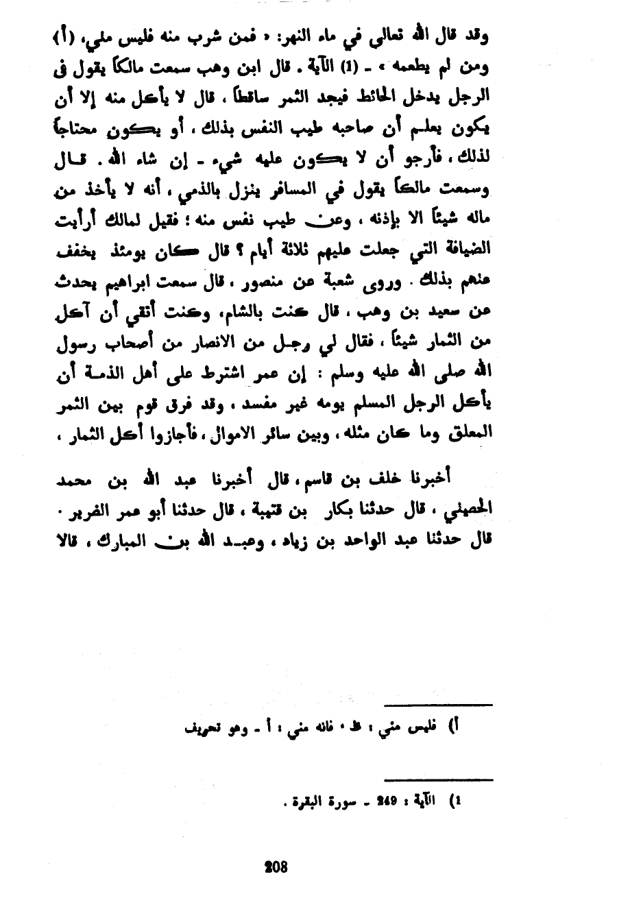 وَقَدْ قَالَ اللَّهُ تَعَالَى فِي مَاءِ النَّهْرِ فَمَنْ شَرِبَ مِنْهُ فَلَيْسَ مِنِّي وَمَنْ لَمْ يَطْعَمْهُ الْآيَةَ قَالَ ابْنُ وَهْبٍ سَمِعَ مَالِكًا يَقُولُ فِي الرَّجُلِ يَدْخُلُ الْحَائِطَ فَيَجِدُ الثَّمَرَ سَاقِطًا قَالَ لَا يَأْكُلُ مِنْهُ إِلَّا أَنْ يَكُونَ يَعْلَمُ أَنَّ صَاحِبَهُ طَيِّبُ النَّفْسِ بِذَلِكَ أَوْ يَكُونُ مُحْتَاجًا لِذَلِكَ فَأَرْجُو أَنْ لَا يَكُونُ عَلَيْهِ شَيْءٌ إِنْ شَاءَ اللَّهُ قَالَ وَسَمِعْتُ مَالِكًا يَقُولُ فِي الْمُسَافِرِ يَنْزِلُ بِالذِّمِّيِّ أَنَّهُ لَا يَأْخُذُ مِنْ مَالِهِ شَيْئًا إِلَّا بِإِذْنِهِ وَعَنْ طِيبِ نَفْسٍ مِنْهُ فَقِيلَ لِمَالِكٍ أَرَأَيْتَ الضِّيَافَةَ الَّتِي جُعِلَتْ عَلَيْهِمْ ثَلَاثَةَ أَيَّامٍ قَالَ كَانَ يَوْمَئِذٍ يُخَفِّفُ عَنْهُمْ بِذَلِكَ وَرَوَى شُعْبَةُ عَنْ مَنْصُورٍ قَالَ سَمِعْتُ إِبْرَاهِيمَ يُحَدِّثُ عَنْ سَعِيدِ بْنِ وَهْبٍ قَالَ كُنْتُ بِالشَّامِ وَكُنْتُ أَتَّقِي أَنْ آكُلَ مِنَ الثِّمَارِ شَيْئًا فَقَالَ لِي رَجُلٌ مِنَ الْأَنْصَارِ مِنْ أَصْحَابِ رَسُولِ اللَّهِ صَلَّى اللَّهُ عَلَيْهِ وسلم أن عُمَرَ اشْتَرَطَ عَلَى أَهْلِ الذِّمَّةِ أَنْ يَأْكُلَ الرَّجُلَ الْمُسْلِمَ يَوْمَهُ غَيْرَ مُفْسِدٍ وَقَدْ فَرَّقَ قَوْمٌ بَيْنَ الثَّمَرِ الْمُعَلِّقِ وَمَا كَانَ مِثْلَهُ وَبَيْنَ سَائِرِ الْأَمْوَالِ فَأَجَازُوا أَكْلَ الثِّمَارِ أَخْبَرَنَا خَلَفُ بْنُ قَاسِمٍ قَالَ أَخْبَرَنَا عَبْدُ اللَّهِ بْنُ مُحَمَّدٍ الْحَصَيْنِيُّ قَالَ حَدَّثَنَا بَكَّارُ بْنُ قُتَيْبَةَ قَالَ حَدَّثَنَا أَبُو عُمَرَ الضَّرِيرُ قَالَ حَدَّثَنَا عَبْدُ الْوَاحِدِ بْنُ زِيَادٍ وَعَبْدُ اللَّهِ بْنُ الْمُبَارَكِ قَالَا