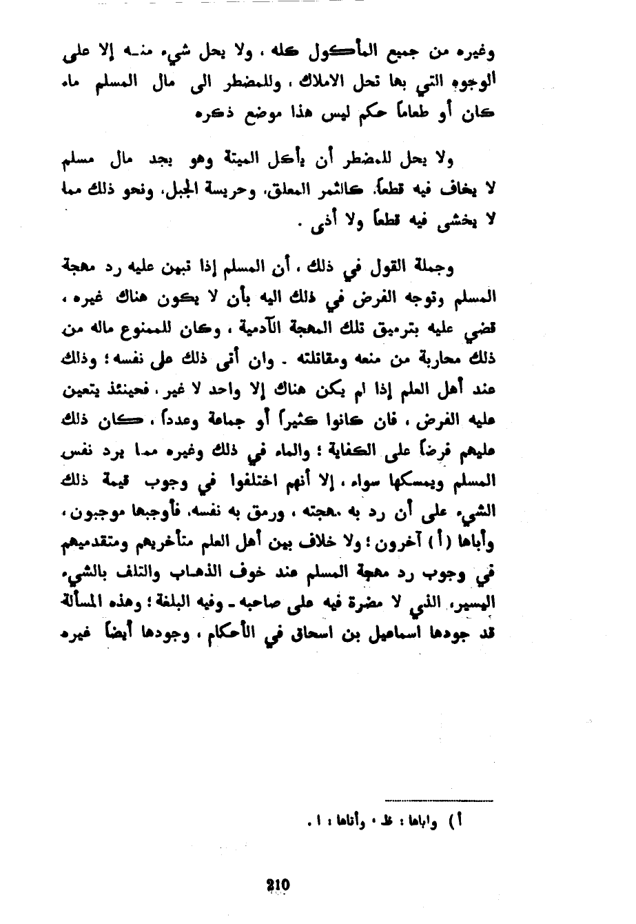 وَغَيْرِهِ مِنْ جَمِيعِ الْمَأْكُولِ كُلِّهِ وَلَا يَحِلُّ شَيْءٌ مِنْهُ إِلَّا عَلَى الْوُجُوهِ الَّتِي بِهَا تَحِلُّ الْأَمْلَاكُ وَلِلْمُضْطَرِّ إِلَى مَالِ الْمُسْلِمِ مَاءً كَانَ أَوْ طَعَامًا حُكْمٌ لَيْسَ هَذَا مَوْضِعَ ذِكْرِهِ وَلَا يَحِلُّ لِلْمُضْطَرِّ أَنْ يَأْكُلَ الْمَيْتَةَ وَهُوَ يَجِدُ مَالَ مُسْلِمٍ لَا يَخَافُ فِيهِ قَطْعًا كَالثَّمَرِ الْمُعَلَّقِ وَحَرِيسَةِ الْجَبَلِ وَنَحْوِ ذَلِكَ مِمَّا لَا يَخْشَى فِيهِ قَطْعًا وَلَا أَذًى وَجُمْلَةُ الْقَوْلِ فِي ذَلِكَ أَنَّ الْمُسْلِمَ إِذَا تبين عَلَيْهِ رَدُّ مُهْجَةِ الْمُسْلِمِ وَتَوَجَّهَ الْفَرْضُ فِي ذَلِكَ إِلَيْهِ بِأَنْ لَا يَكُونَ هُنَاكَ غَيْرُهُ قُضِيَ عَلَيْهِ بِتَرْمِيقِ تِلْكَ الْمُهْجَةِ الْآدَمِيَّةِ وَكَانَ لِلْمَمْنُوعِ مَالُهُ مِنْ ذَلِكَ مُحَارَبَةُ مَنْ مَنَعَهُ وَمُقَاتَلَتُهُ وَإِنْ أَتَى ذَلِكَ عَلَى نَفْسِهِ وَذَلِكَ عِنْدَ أَهْلِ الْعِلْمِ إِذَا لَمْ يَكُنْ هُنَاكَ إِلَّا وَاحِدٌ لَا غَيْرُ فَحِينَئِذٍ يَتَعَيَّنُ عَلَيْهِ الْفَرْضُ فَإِنْ كَانُوا كَثِيرًا أَوْ جَمَاعَةً وَعَدَدًا كان ذلك عليهم فرضا على الكفاية والماء فِي ذَلِكَ وَغَيْرِهِ مِمَّا يَرُدُّ نَفْسَ الْمُسْلِمِ وَيُمْسِكُهَا سَوَاءً إِلَّا أَنَّهُمُ اخْتَلَفُوا فِي وُجُوبِ قِيمَةِ ذَلِكَ الشَّيْءِ عَلَى أَنْ رَدَّ بِهِ مُهْجَتَهُ وَرَمَقَ بِهِ نَفْسَهُ فَأَوْجَبَهَا مُوجِبُونَ وَأَبَاهَا آخَرُونَ وَلَا خِلَافَ بَيْنِ أَهْلِ الْعِلْمِ مُتَأَخَّرِيهِمْ وَمُتَقَدِّمِيهِمْ فِي وُجُوبِ رَدِّ مُهْجَةِ الْمُسْلِمِ عِنْدَ خَوْفِ الذَّهَابِ وَالتَّلَفِ بِالشَّيْءِ الْيَسِيرِ الَّذِي لَا مَضَرَّةَ فِيهِ عَلَى صَاحِبِهِ وَفِيهِ الْبُلْغَةُ وَهَذِهِ الْمَسْأَلَةُ قَدْ جَوَّدَهَا إِسْمَاعِيلُ بْنُ إِسْحَاقَ فِي الْأَحْكَامِ وَجَوَّدَهَا أَيْضًا غَيْرُهُ
