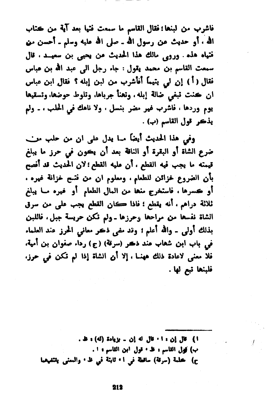 فَاشْرَبْ مِنْ لَبَنِهَا فَقَالَ الْقَاسِمُ مَا سَمِعْتُ فُتْيَا بَعْدَ آيَةٍ مِنْ كِتَابِ اللَّهِ أَوْ حَدِيثٍ عَنْ رَسُولِ اللَّهِ صَلَّى اللَّهُ عَلَيْهِ وَسَلَّمَ أَحْسَنَ مِنْ فُتْيَاهُ هَذِهِ وَرَوَى مَالِكٌ هَذَا الْحَدِيثَ عَنْ يَحْيَى بْنِ سَعِيدٍ قَالَ سَمِعْتُ الْقَاسِمَ بْنَ مُحَمَّدٍ يَقُولُ جَاءَ رَجُلٌ إِلَى عَبْدِ اللَّهِ بْنِ عَبَّاسٍ فَقَالَ إِنَّ لِي يَتِيمًا أَفَأَشْرَبُ مِنْ لَبَنِ إِبِلِهِ فَقَالَ ابْنُ عَبَّاسٍ إِنْ كُنْتَ تَبْغِي ضَالَّةَ إِبِلِهِ وَتَهْنَأُ جَرْبَاهَا وَتَلُوطُ حَوْضَهَا وَتَسْقِيهَا يَوْمَ وِرْدِهَا فَاشْرَبْ غَيْرَ مُضِرٍّ بِنَسْلٍ وَلَا نَاهِكٍ فِي الْحَلْبِ وَلَمْ يَذْكُرْ قَوْلَ الْقَاسِمِ وَفِي هَذَا الْحَدِيثِ أَيْضًا مَا يَدُلُّ عَلَى أَنَّ مَنْ حَلَبَ مِنْ ضَرْعِ الشَّاةِ أَوِ الْبَقَرَةِ أَوِ النَّاقَةِ بَعْدَ أَنْ يَكُونَ فِي حِرْزٍ مَا يَبْلُغُ قِيمَتُهُ مَا يَجِبُ فِيهِ الْقَطْعُ أَنَّ عَلَيْهِ الْقَطْعَ لِأَنَّ الْحَدِيثَ قَدْ أَفْصَحَ بِأَنَّ الضُّرُوعَ خَزَائِنُ لِلطَّعَامِ وَمَعْلُومٌ أَنَّ مَنْ فَتَحَ خِزَانَةَ غَيْرِهِ أَوْ كَسَرَهَا فَاسْتَخْرَجَ مِنْهَا مِنَ الْمَالِ الطَّعَامَ أَوْ غَيْرَهُ مَا يَبْلُغُ ثَلَاثَةَ دَرَاهِمَ أَنَّهُ يُقْطَعُ فَإِذَا كَانَ الْقَطْعُ يَجِبُ عَلَى مَنْ سَرَقَ الشَّاةَ نَفْسَهَا مِنْ مُرَاحِهَا وَحِرْزِهَا وَلَمْ تَكُنْ حَرِيسَةَ جَبَلٍ فَاللَّبَنُ بِذَلِكَ أَوْلَى وَاللَّهُ أَعْلَمُ وَقَدْ مَضَى ذِكْرُ مَعَانِي الْحِرْزِ عِنْدَ الْعُلَمَاءِ فِي بَابِ ابْنِ شِهَابٍ عند ذكر (سرقة) (ج) رِدَاءِ صَفْوَانَ بْنِ أُمَيَّةَ فَلَا مَعْنَى لِإِعَادَةِ ذلك ههنا إِلَّا أَنَّ الشَّاةَ إِذَا لَمْ تَكُنْ فِي حِرْزٍ فَلَبَنُهَا تَبَعٌ لَهَا