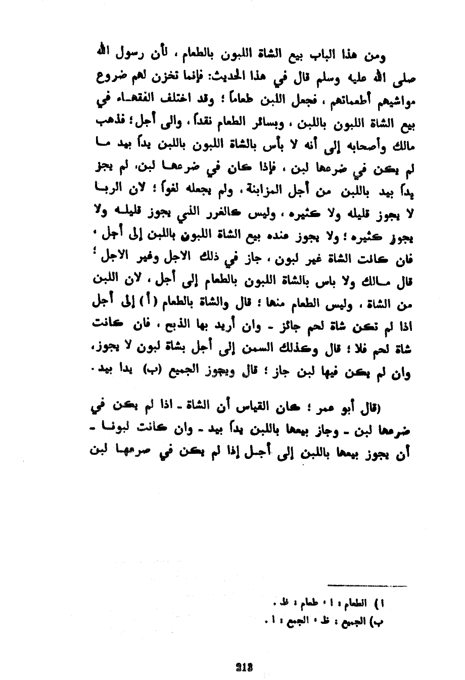 وَمِنْ هَذَا الْبَابِ بَيْعُ الشَّاةِ اللَّبُونِ بِالطَّعَامِ لِأَنَّ رَسُولَ اللَّهِ صَلَّى اللَّهُ عَلَيْهِ وَسَلَّمَ قَالَ فِي هَذَا الْحَدِيثِ فَإِنَّمَا تُخَزِّنُ لَهُمْ ضُرُوعُ مَوَاشِيهِمْ أَطَعِمَاتِهِمْ فَجَعَلَ اللَّبَنَ طَعَامًا وَقَدِ اخْتَلَفَ الْفُقَهَاءُ فِي بَيْعِ الشَّاةِ اللَّبُونِ بِاللَّبَنِ وَبِسَائِرِ الطَّعَامِ نَقْدًا وَإِلَى أَجَلٍ فَذَهَبَ مَالِكٌ وَأَصْحَابُهُ إِلَى أَنَّهُ لَا بَأْسَ بِالشَّاةِ اللَّبُونِ بِاللَّبَنِ يَدًا بِيَدٍ مَا لَمْ يَكُنْ فِي ضَرْعِهَا لَبَنٌ فَإِذَا كَانَ فِي ضَرْعِهَا لَبَنٌ لَمْ يَجُزْ يَدًا بِيَدٍ بِاللَّبَنِ مِنْ أَجْلِ الْمُزَابَنَةِ وَلَمْ يَجْعَلْهُ لَغْوًا لِأَنَّ الرِّبَا لَا يَجُوزُ قَلِيلُهُ وَلَا كَثِيرُهُ وَلَيْسَ كَالْغَرَرِ الَّذِي يَجُوزُ قَلِيلُهُ وَلَا يَجُوزُ كَثِيرُهُ وَلَا يَجُوزُ عنده بيع الشاة اللبون باللبن إِلَى أَجَلٍ فَإِنْ كَانَتِ الشَّاةُ غَيْرَ لِبَوْنٍ جَازَ فِي ذَلِكَ الْأَجَلُ وَغَيْرُ الْأَجَلِ قَالَ مَالِكٌ وَلَا بَأْسَ بِالشَّاةِ اللَّبُونِ بِالطَّعَامِ إِلَى أَجَلٍ لِأَنَّ اللَّبَنَ مِنَ الشَّاةِ وَلَيْسَ الطَّعَامُ مِنْهَا قَالَ وَالشَّاةُ بِالطَّعَامِ إِلَى أَجَلٍ إِذَا لَمْ تَكُنْ شَاةَ لَحْمٍ جَائِزٌ وَإِنْ أُرِيدَ بِهَا الذَّبْحُ فَإِنْ كَانَتْ شَاةَ لَحْمٍ فَلَا قَالَ وَكَذَلِكَ السَّمْنُ إِلَى أَجَلٍ بِشَاةٍ لِبَوْنٍ لَا يَجُوزُ وَإِنْ لَمْ يَكُنْ فِيهَا لَبَنٌ جَازَ قَالَ وَيَجُوزُ الْجَمِيعُ يَدًا بِيَدٍ (قَالَ أَبُو عُمَرَ كَانَ الْقِيَاسُ أَنَّ الشَّاةَ إِذَا لَمْ يَكُنْ فِي ضَرْعِهَا لَبَنٌ وَجَازَ بَيْعُهَا بِاللَّبَنِ يَدًا بِيَدٍ وَإِنْ كَانَتْ لَبَوْنًا أَنْ يَجُوزَ بَيْعُهَا بِاللَّبَنِ إِلَى أَجَلٍ إِذَا لَمْ يَكُنْ فِي ضَرْعِهَا لَبَنٌ