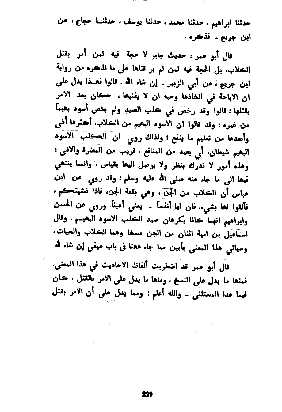حَدَّثَنَا إِبْرَاهِيمُ حَدَّثَنَا مُحَمَّدٌ حَدَّثَنَا يُوسُفُ حَدَّثَنَا حَجَّاجٌ عَنِ ابْنِ جُرَيْجٍ فَذَكَرَهُ قَالَ أَبُو عُمَرَ حَدِيثُ جَابِرٍ لَا حُجَّةَ فِيهِ لِمَنْ أَمَرَ بِقَتْلِ الْكِلَابِ بَلِ الْحُجَّةُ فِيهِ لِمَنْ لَمْ يَرَ قَتْلَهَا عَلَى مَا نَذْكُرُهُ مِنْ رِوَايَةِ ابْنِ جُرَيْجٍ عَنْ أَبِي الزُّبَيْرِ إِنْ شَاءَ اللَّهُ قَالُوا فَهَذَا يَدُلُّ عَلَى أَنَّ الْإِبَاحَةَ فِي اتِّخَاذِهَا وَحُبَّهُ أَنْ لَا يُفْنِيَهَا كَانَ بَعْدَ الْأَمْرِ بِقَتْلِهَا قَالُوا وَقَدْ رَخَّصَ فِي كَلْبِ الصَّيْدِ وَلَمْ يَخُصَّ أَسْوَدَ بَهِيمًا مِنْ غَيْرِهِ وَقَدْ قَالُوا إِنَّ الْأَسْوَدَ الْبَهِيمَ مِنِ الْكِلَابِ أَكْثَرُهَا أَذًى وَأَبْعَدُهَا مِنْ تَعْلِيمِ مَا يَنْفَعُ وَلِذَلِكَ رُوِيَ أَنَّ الْكَلْبَ الْأَسْوَدَ الْبَهِيمَ شَيْطَانٌ أَيْ بَعِيدٌ مِنَ الْمَنَافِعِ قَرِيبٌ مِنَ الْمَضَرَّةِ وَالْأَذَى وَهَذِهِ أُمُورٌ لَا تُدْرَكُ بِنَظَرٍ وَلَا يُوصَلُ إِلَيْهَا بِقِيَاسٍ وَإِنَّمَا يَنْتَهِي فِيهَا إِلَى مَا جَاءَ عَنْهُ صَلَّى اللَّهُ عَلَيْهِ وَسَلَّمَ وَقَدْ رُوِيَ عَنْ ابْنِ عَبَّاسٍ أَنَّ الْكِلَابَ مِنِ الْجِنِّ وَهِيَ بُقْعَةُ الْجِنِّ فَإِذَا غَشِيَتْكُمْ فَأَلْقُوا لَهَا بِشَيْءٍ فَإِنَّ لَهَا أَنْفُسًا يَعْنِي أَعْيُنًا وَرُوِيَ عَنِ الْحَسَنِ وَإِبْرَاهِيمَ أَنَّهُمَا كَانَا يَكْرَهَانِ صَيْدَ الْكَلْبِ الْأَسْوَدِ الْبَهِيمِ وَقَالَ إِسْمَاعِيلُ بْنُ أُمَيَّةَ اثْنَانِ مِنَ الْجِنِّ مُسِخَا وَهُمَا الْكِلَابُ وَالْحَيَّاتُ وَسَيَأْتِي هَذَا الْمَعْنَى بأبين مما جاء ههنا فِي بَابِ صَيْفِيٍّ إِنْ شَاءَ اللَّهُ قَالَ أَبُو عُمَرَ قَدْ اضْطَرَبَتْ أَلْفَاظُ الْأَحَادِيثِ فِي هَذَا الْمَعْنَى فَمِنْهَا مَا يَدُلُّ عَلَى النَّسْخِ وَمِنْهَا مَا يَدُلُّ عَلَى الْأَمْرِ بِالْقَتْلِ كَانَ فِيمَا عَدَا الْمُسْتَثْنَى وَاللَّهُ أَعْلَمُ وَمِمَّا يَدُلُّ عَلَى أَنَّ الْأَمْرَ بِقَتْلِ