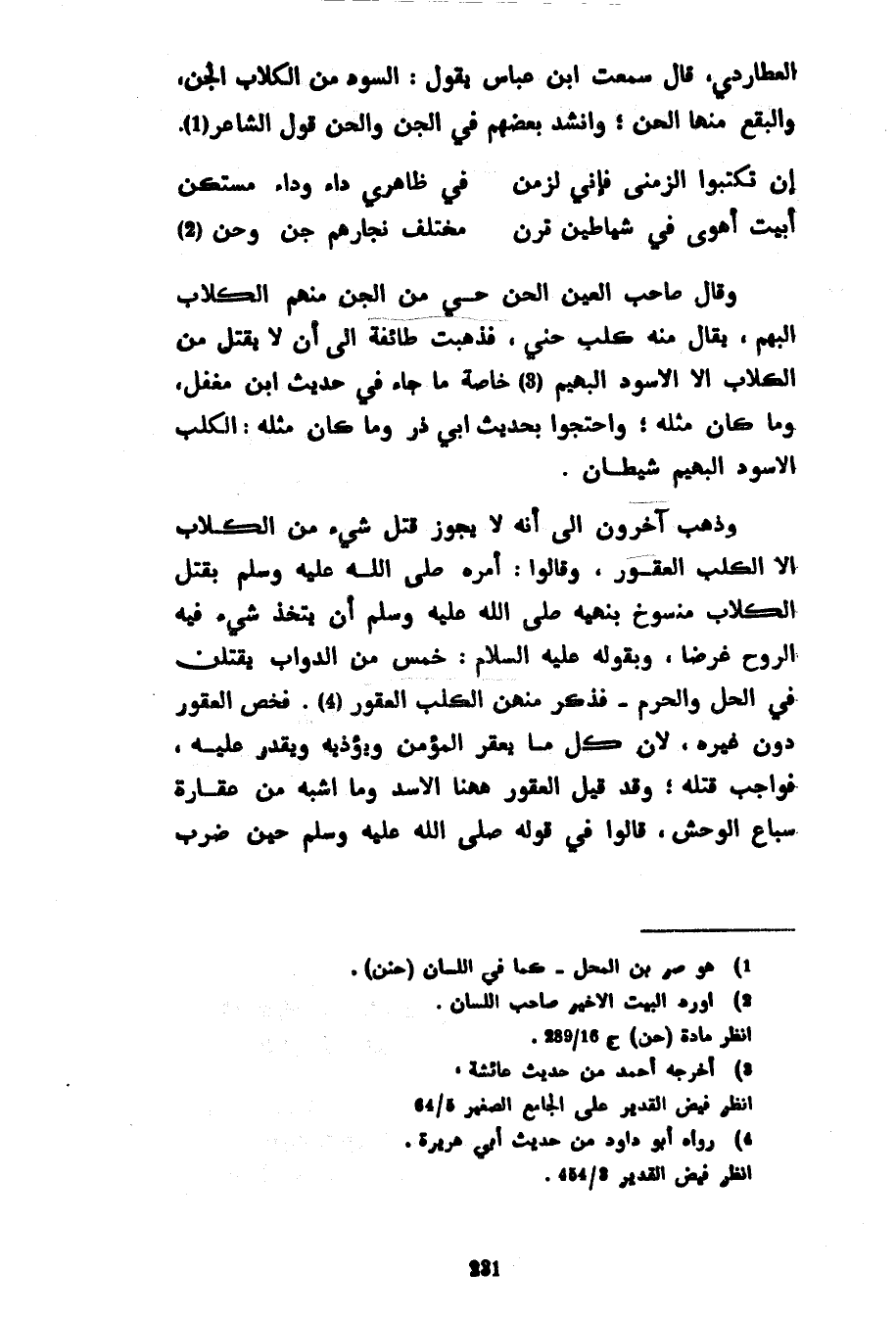 العطاردي قال سمعت ابن عباس يقول السوء مِنِ الْكِلَابِ الْجِنُّ وَالْبُقَعُ مِنْهَا الْحِنُّ وَأَنْشَدَ بَعْضُهُمْ فِي الْجِنِّ وَالْحِنِّ قَوْلَ الشَّاعِرِ ... إِنْ تَكْتُبُوا الزَّمْنَى فَإِنِّي لَزَمِنٌ ... فِي ظَاهِرِي دَاءٌ وداء مستكن ... ... أبيت أهوى في شياطين قرن ... ... مختلف نجاره جِنٌّ وَحِنُّ ... وَقَالَ صَاحِبُ الْعَيْنِ الْحِنُّ حَيٌّ مِنَ الْجِنِّ مِنْهُمُ الْكِلَابُ الْبَهْمُ يُقَالُ مِنْهُ كَلْبٌ حِنِيٌّ فَذَهَبَتْ طَائِفَةٌ إِلَى أَنْ لَا يُقْتَلَ مِنِ الْكِلَابِ إِلَّا الْأَسْوَدُ الْبَهِيمُ خَاصَّةً مَا جَاءَ فِي حَدِيثِ ابْنِ مُغَفَّلٍ وَمَا كَانَ مِثْلَهُ وَاحْتَجُّوا بِحَدِيثِ أَبِي ذَرٍّ وَمَا كَانَ مِثْلَهُ الْكَلْبُ الْأَسْوَدُ الْبَهِيمُ شَيْطَانٌ وَذَهَبَ آخَرُونَ إِلَى أَنَّهُ لَا يَجُوزُ قَتْلُ شَيْءٍ مِنِ الْكِلَابِ إِلَّا الْكَلْبَ الْعَقُورَ وَقَالُوا أَمْرُهُ صَلَّى اللَّهُ عَلَيْهِ وَسَلَّمَ بِقَتْلِ الْكِلَابِ مَنْسُوخٌ بِنَهْيِهِ صَلَّى اللَّهُ عَلَيْهِ وَسَلَّمَ أَنْ يُتَّخَذَ شَيْءٌ فِيهِ الرُّوحُ غَرَضًا وَبِقَوْلِهِ عَلَيْهِ السَّلَامُ خَمْسٌ مِنَ الدَّوَابِّ يُقْتَلْنَ فِي الْحِلِّ وَالْحَرَمِ فَذَكَرَ مِنْهُنَّ الْكَلْبَ الْعَقُورَ فَخَصَّ الْعَقُورَ دُونَ غَيْرِهِ لِأَنَّ كُلَّ مَا يَعْقِرُ الْمُؤْمِنَ وَيُؤْذِيهِ وَيَقْدِرُ عَلَيْهِ فَوَاجِبٌ قَتْلُهُ وَقَدْ قِيلَ الْعَقُورُ ههنا الأسد وما أشبه مِنْ عَقَّارَةِ سِبَاعِ الْوَحْشِ قَالُوا فِي قَوْلِهِ صَلَّى اللَّهُ عَلَيْهِ وَسَلَّمَ حِينَ ضَرَبَ