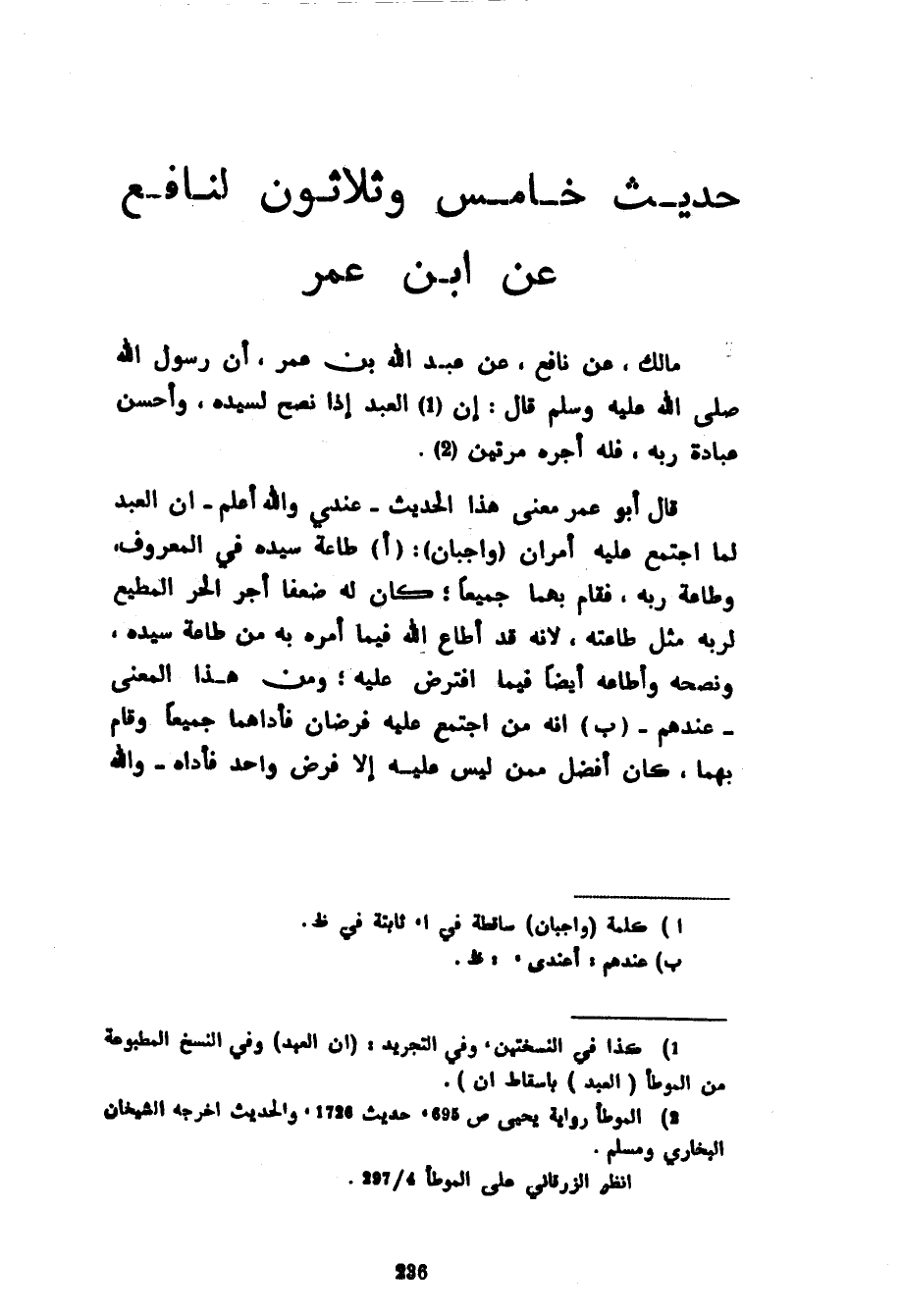 حَدِيثٌ خَامِسٌ وَثَلَاثُونَ لِنَافِعٍ عَنِ ابْنِ عُمَرَ مَالِكٌ عَنْ نَافِعٍ عَنْ عَبْدِ اللَّهِ بْنِ عُمَرَ أَنَّ رَسُولَ اللَّهِ صَلَّى اللَّهُ عَلَيْهِ وَسَلَّمَ قَالَ إِنَّ الْعَبْدَ إِذَا نَصَحَ لِسَيِّدِهِ وَأَحْسَنَ عِبَادَةَ رَبِّهِ فَلَهُ أَجْرُهُ مَرَّتَيْنِ قَالَ أَبُو عُمَرَ مَعْنَى هَذَا الْحَدِيثِ عِنْدِي وَاللَّهُ أَعْلَمُ أَنَّ الْعَبْدَ لَمَّا اجْتَمَعَ عَلَيْهِ أَمْرَانِ (واجبان) (أ) طَاعَةُ سَيِّدِهِ فِي الْمَعْرُوفِ وَطَاعَةُ رَبِّهِ فَقَامَ بِهِمَا جَمِيعًا كَانَ لَهُ ضِعْفَا أَجْرِ الْحُرِّ الْمُطِيعِ لِرَبِّهِ مِثْلَ طَاعَتِهِ لِأَنَّهُ قَدْ أَطَاعَ اللَّهَ فِيمَا أَمَرَهُ بِهِ مِنْ طَاعَةِ سَيِّدِهِ وَنُصْحِهِ وَأَطَاعَهُ أَيْضًا فِيمَا افْتَرَضَ عَلَيْهِ وَمِنْ هَذَا الْمَعْنَى عِنْدَهُمْ أَنَّهُ مَنِ اجْتَمَعَ عَلَيْهِ فَرْضَانِ فَأَدَّاهُمَا جَمِيعًا وَقَامَ بِهِمَا كَانَ أَفْضَلَ مِمَّنْ لَيْسَ عَلَيْهِ إِلَّا فَرْضٌ وَاحِدٌ فَأَدَّاهُ والله