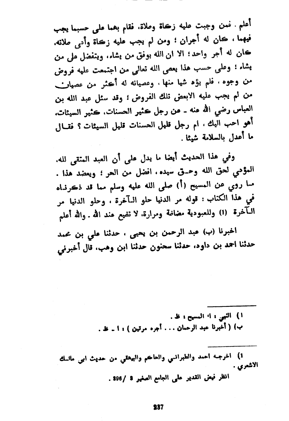 أَعْلَمُ فَمَنْ وَجَبَتْ عَلَيْهِ زَكَاةٌ وَصَلَاةٌ فَقَامَ بِهِمَا عَلَى حَسْبَمَا يَجِبُ فِيهِمَا كَانَ لَهُ أَجْرَانِ وَمَنْ لَمْ يَجِبْ عَلَيْهِ زَكَاةٌ وَأَدَّى صَلَاتَهُ كَانَ لَهُ أَجْرٌ وَاحِدٌ إِلَّا أَنَّ اللَّهَ يُوَفِّقُ مَنْ يَشَاءُ وَيَتَفَضَّلُ عَلَى مَنْ يَشَاءُ وَعَلَى حَسَبِ هَذَا يَعْصِي اللَّهَ تَعَالَى مَنِ اجْتَمَعَتْ عَلَيْهِ فُرُوضٌ مِنْ وُجُوهٍ فَلَمْ يُؤَدِّ شَيًّا مِنْهَا وَعِصْيَانُهُ لَهُ أَكْثَرُ مِنْ عِصْيَانِ مَنْ لَمْ يَجِبْ عَلَيْهِ إِلَّا بَعْضُ تِلْكَ الْفُرُوضِ وَقَدْ سُئِلَ عَبْدُ اللَّهِ بْنُ الْعَبَّاسِ رَضِيَ اللَّهُ عَنْهُ عَنْ رَجُلٍ كَثِيرِ الْحَسَنَاتِ كَثِيرِ السَّيِّئَاتِ أَهُوَ أَحَبُّ إِلَيْكَ أَمْ رَجُلٌ قَلِيلُ الْحَسَنَاتِ قَلِيلُ السَّيِّئَاتِ فَقَالَ مَا أَعْدِلُ بِالسَّلَامَةِ شَيْئًا وَفِي هَذَا الْحَدِيثِ أَيْضًا مَا يَدُلُّ عَلَى أَنَّ الْعَبْدَ الْمُتَّقِيَ لِلَّهِ الْمُؤَدِّيَ لِحَقِّ اللَّهِ وَحَقِّ سَيِّدِهِ أَفْضَلُ مِنَ الْحُرِّ وَيُعَضِّدُ هَذَا مَا رُوِيَ عَنِ الْمَسِيحِ صَلَّى اللَّهُ عَلَيْهِ وَسَلَّمَ مِمَّا قَدْ ذَكَرْنَاهُ فِي هَذَا الْكِتَابِ قَوْلُهُ مُرُّ الدُّنْيَا حُلْوُ الْآخِرَةِ وَحُلْوُ الدُّنْيَا مُرُّ الْآخِرَةِ وَلِلْعُبُودِيَّةِ مَضَاضَةٌ وَمَرَارَةٌ لَا تَضِيعُ عِنْدَ اللَّهِ وَاللَّهُ أَعْلَمُ أَخْبَرَنَا عَبْدُ الرَّحْمَنِ بْنُ يَحْيَى حَدَّثَنَا عَلِيُّ بْنُ مُحَمَّدٌ حَدَّثَنَا أَحْمَدُ بْنُ دَاوُدَ حَدَّثَنَا سَحْنُونُ حَدَّثَنَا ابْنُ وَهْبٍ قَالَ أَخْبَرَنِي