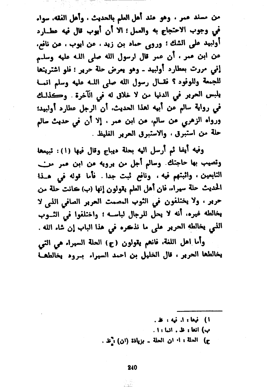 مِنْ مُسْنَدِ عُمَرَ وَهُوَ عِنْدَ أَهْلِ الْعِلْمِ بِالْحَدِيثِ وَأَهْلِ الْفِقْهِ سَوَاءٌ فِي وُجُوبِ الِاحْتِجَاجِ بِهِ وَالْعَمَلِ إِلَّا أَنَّ أَيُّوبَ قَالَ فِيهِ عُطَارِدُ أَوْ لَبِيدٌ عَلَى الشَّكِّ وَرَوَى حَمَّادُ بْنُ زَيْدٍ عَنْ أَيُّوبَ عَنْ نَافِعٍ عَنِ ابْنِ عُمَرَ أَنَّ عُمَرَ قَالَ لِرَسُولِ اللَّهِ صَلَّى اللَّهُ عَلَيْهِ وَسَلَّمَ إِنِّي مَرَرْتُ بِعُطَارِدَ أَوْ لَبِيدٍ وَهُوَ يَعْرِضُ حُلَّةَ حَرِيرٍ فَلَوِ اشْتَرَيْتَهَا لِلْجُمُعَةِ وَلِلْوُفُودِ فَقَالَ رَسُولُ اللَّهِ صَلَّى اللَّهُ عَلَيْهِ وَسَلَّمَ إِنَّمَا يَلْبَسُ الْحَرِيرَ فِي الدُّنْيَا مَنْ لَا خَلَاقَ لَهُ فِي الْآخِرَةِ وَكَذَلِكَ فِي رِوَايَةِ سَالِمٍ عَنْ أَبِيهِ لِهَذَا الْحَدِيثِ أَنَّ الرَّجُلَ عُطَارِدُ أَوْ لَبِيدٌ وَرَوَاهُ الزُّهْرِيُّ عَنْ سَالِمٍ عَنِ ابْنِ عُمَرَ إِلَّا أَنَّ فِي حَدِيثِ سَالِمٍ حُلَّةً مِنْ إِسْتَبْرَقٍ وَالْإِسْتَبْرَقُ الْحَرِيرُ الْغَلِيظُ وَفِيهِ أَيْضًا ثُمَّ أَرْسَلَ إِلَيْهِ بِحُلَّةِ دِيبَاجٍ وَقَالَ فِيهَا تَبِيعُهَا وَتُصِيبُ بِهَا حَاجَتَكَ وَسَالِمٌ أَجَلُّ مَنْ يَرْوِيهِ عَنِ ابْنِ عُمَرَ مِنَ التَّابِعِينَ وَأَثْبَتُهُمْ فِيهِ وَنَافِعٌ ثَبَتٌ جِدًّا فَأَمَّا قَوْلُهُ فِي هَذَا الْحَدِيثِ حُلَّةَ سِيَرَاءَ فَإِنَّ أَهْلَ الْعِلْمِ يَقُولُونَ إِنَّهَا كَانْتَ حُلَّةً مِنْ حَرِيرٍ وَلَا يَخْتَلِفُونَ فِي الثَّوْبِ الْمُصْمَتِ الْحَرِيرِ الصَّافِي الَّذِي لَا يُخَالِطُهُ غَيْرُهُ أَنَّهُ لَا يَحِلُّ لِلرِّجَالِ لِبَاسُهُ وَاخْتَلَفُوا فِي الثَّوْبِ الَّذِي يُخَالِطُهُ الْحَرِيرُ عَلَى مَا نَذْكُرُهُ فِي هَذَا الْبَابِ إِنْ شَاءَ اللَّهُ وَأَمَّا أَهْلُ اللُّغَةِ فَإِنَّهُمْ يَقُولُونَ الْحُلَّةُ السِّيَرَاءُ هِيَ الَّتِي يُخَالِطُهَا الْحَرِيرُ قَالَ الْخَلِيلُ بْنُ أَحْمَدَ السِّيَرَاءُ بُرُودٌ يُخَالِطُهَا