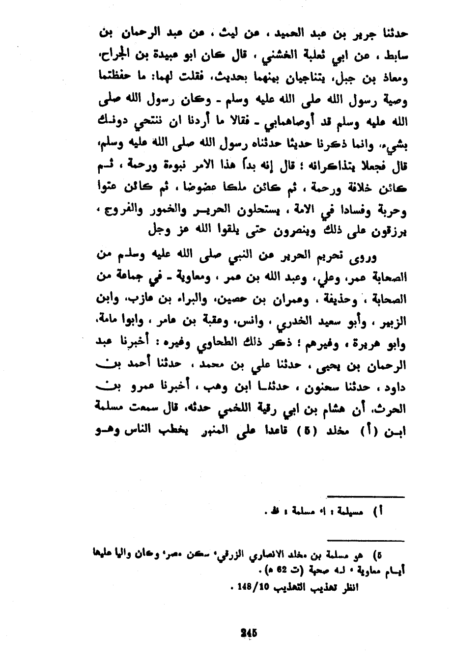 حَدَّثَنَا جَرِيرُ بْنُ عَبْدِ الْحَمِيدِ عَنْ ليث عن عبد الرحمان بْنِ سَابِطٍ عَنْ أَبِي ثَعْلَبَةَ الْخُشَنِيِّ قَالَ كَانَ أَبُو عُبَيْدَةَ بْنُ الْجَرَّاحِ وَمُعَاذُ بْنُ جَبَلٍ يَتَنَاجَيَانِ بَيْنَهُمَا بِحَدِيثٍ فَقُلْتُ لَهُمَا مَا حَفِظْتُمَا وَصِيَّةَ رَسُولِ اللَّهِ صَلَّى اللَّهُ عَلَيْهِ وَسَلَّمَ وَكَانَ رَسُولُ اللَّهِ صَلَّى اللَّهُ عَلَيْهِ وَسَلَّمَ قَدْ أَوْصَاهُمَا بِي فَقَالَا مَا أَرَدْنَا أَنْ نَنْتَحِيَ دُونَكَ بِشَيْءٍ وَإِنَّمَا ذَكَرْنَا حَدِيثًا حَدَّثَنَاهُ رَسُولُ اللَّهِ صَلَّى اللَّهُ عَلَيْهِ وَسَلَّمَ قَالَ فَجَعَلَا يَتَذَاكَرَانِهِ قَالَ إِنَّهُ بَدَا هَذَا الْأَمْرُ نُبُوءَةً وَرَحْمَةً ثُمَّ كَائِنٌ خِلَافَةً وَرَحْمَةً ثُمَّ كَائِنٌ مُلْكًا عَضُوضًا ثُمَّ كَائِنٌ عُتُوًّا وَحَرْبَةً وَفَسَادًا فِي الْأُمَّةِ يَسْتَحِلُّونَ الْحَرِيرَ وَالْخُمُورَ وَالْفُرُوجَ يُرْزَقُونَ عَلَى ذَلِكَ وَيُنْصَرُونَ حَتَّى يَلْقَوُا اللَّهَ عَزَّ وَجَلَّ وَرَوَى تَحْرِيمَ الْحَرِيرِ عَنِ النَّبِيِّ صَلَّى اللَّهُ عَلَيْهِ وَسَلَّمَ مِنَ الصَّحَابَةِ عُمَرُ وَعَلِيٌّ وَعَبْدُ اللَّهِ بْنُ عُمَرَ وَمُعَاوِيَةُ فِي جَمَاعَةٍ مِنَ الصَّحَابَةِ وَحُذَيْفَةُ وَعِمْرَانُ بْنُ حُصَيْنٍ وَالْبَرَاءُ بْنُ عَازِبٍ وَابْنُ الزُّبَيْرِ وَأَبُو سَعِيدٍ الْخُدْرِيُّ وَأَنَسٌ وَعُقْبَةُ بْنُ عَامِرٍ وَأَبُو أُمَامَةَ وَأَبُو هُرَيْرَةَ وَغَيْرُهُمْ ذَكَرَ ذَلِكَ الطَّحَاوِيُّ وغيره أخبرنا عبد الرحمان بْنُ يَحْيَى حَدَّثَنَا عَلِيُّ بْنُ مُحَمَّدٌ حَدَّثَنَا أَحْمَدُ بْنُ دَاوُدَ حَدَّثَنَا سَحْنُونُ حَدَّثَنَا ابْنُ وهب أخبرنا عمرو بن الحرث أَنَّ هِشَامَ بْنَ أَبِي رُقَيَّةَ اللَّخْمِيَّ حَدَّثَهُ قَالَ سَمِعْتُ مَسْلَمَةَ بْنَ مَخْلَدٍ قَاعِدًا عَلَى الْمِنْبَرِ يَخْطُبُ النَّاسَ وَهُوَ
