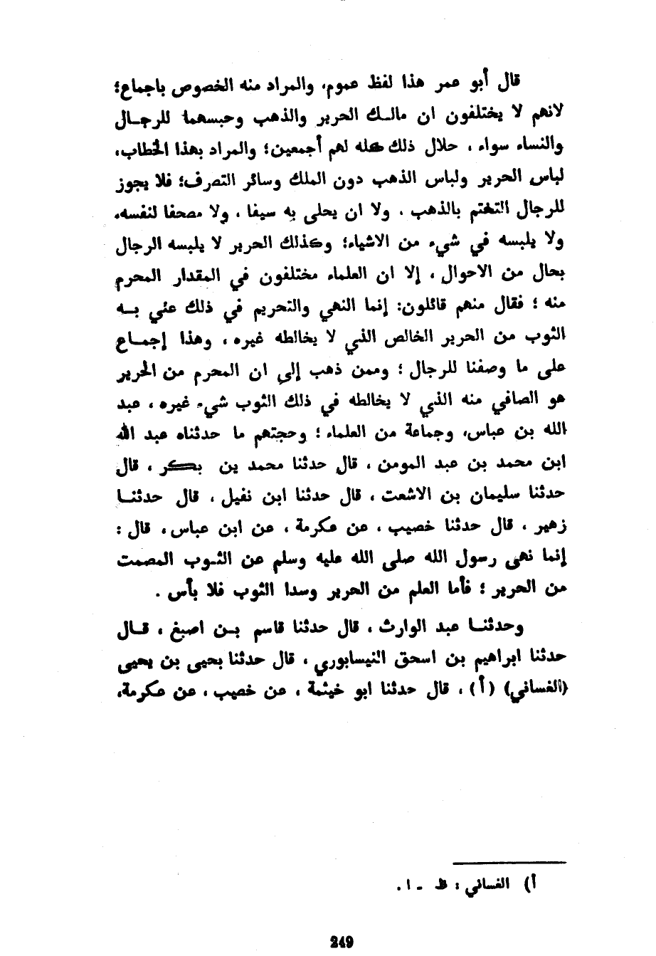 قَالَ أَبُو عُمَرَ هَذَا لَفْظُ عُمُومٍ وَالْمُرَادُ مِنْهُ الْخُصُوصُ بِإِجْمَاعٍ لِأَنَّهُمْ لَا يَخْتَلِفُونَ أَنَّ مَالِكَ الْحَرِيرِ وَالذَّهَبِ وَحَبْسَهُمَا لِلرِّجَالِ وَالنِّسَاءِ سَوَاءٌ حَلَالُ ذَلِكَ كُلِّهِ لَهُمْ أَجْمَعِينَ وَالْمُرَادُ بِهَذَا الْخِطَابِ لِبَاسُ الْحَرِيرِ وَلِبَاسُ الذَّهَبِ دُونَ الْمِلْكِ وَسَائِرُ التَّصَرُّفِ فَلَا يَجُوزُ لِلرِّجَالِ التَّخَتُّمُ بِالذَّهَبِ وَلَا أَنْ يُحَلِّيَ بِهِ سَيْفًا وَلَا مُصْحَفًا لِنَفْسِهِ وَلَا يَلْبَسُهُ فِي شَيْءٍ مِنَ الْأَشْيَاءِ وَكَذَلِكَ الْحَرِيرُ لَا يَلْبَسُهُ الرِّجَالُ بِحَالٍ مِنَ الْأَحْوَالِ إِلَّا أَنَّ الْعُلَمَاءَ مُخْتَلِفُونَ فِي الْمِقْدَارِ الْمُحَرَّمِ مِنْهُ فَقَالَ مِنْهُمْ قَائِلُونَ إِنَّمَا النَّهْيُ وَالتَّحْرِيمُ فِي ذَلِكَ عُنِيَ بِهِ الثَّوْبَ مِنَ الْحَرِيرِ الْخَالِصِ الَّذِي لَا يُخَالِطُهُ غَيْرُهُ وَهَذَا إِجْمَاعٌ عَلَى مَا وَصَفْنَا لِلرِّجَالِ وَمِمَّنْ ذَهَبَ إِلَى أَنَّ الْمُحَرَّمَ مِنَ الْحَرِيرِ هُوَ الصَّافِي مِنْهُ الَّذِي لَا يُخَالِطُهُ فِي ذَلِكَ الثَّوْبِ شَيْءٌ غَيْرُهُ عَبْدُ اللَّهِ بْنُ عَبَّاسٍ وَجَمَاعَةٌ مِنَ الْعُلَمَاءِ وَحُجَّتُهُمْ مَا حَدَّثَنَاهُ عَبْدُ اللَّهِ بْنُ مُحَمَّدِ بْنِ عبد المؤمن قَالَ حَدَّثَنَا مُحَمَّدُ بْنُ بَكْرٍ قَالَ حَدَّثَنَا سُلَيْمَانُ بْنُ الْأَشْعَثِ قَالَ حَدَّثَنَا ابْنُ نُفَيْلٍ قَالَ حَدَّثَنَا زُهَيْرٌ قَالَ حَدَّثَنَا خُصَيْبٌ عَنْ عِكْرِمَةَ عَنِ ابْنِ عَبَّاسٍ قَالَ إِنَّمَا نَهَى رَسُولُ اللَّهِ صَلَّى اللَّهُ عَلَيْهِ وَسَلَّمَ عَنِ الثَّوْبِ الْمُصْمَتِ مِنَ الْحَرِيرِ فَأَمَّا الْعَلَمُ مِنَ الْحَرِيرِ وَسَدَا الثَّوْبِ فَلَا بَأْسَ وَحَدَّثَنَا عَبْدُ الْوَارِثِ قَالَ حَدَّثَنَا قَاسِمُ بْنُ أَصْبَغَ قَالَ حَدَّثَنَا إِبْرَاهِيمُ بن إسحق النَّيْسَابُورِيُّ قَالَ حَدَّثَنَا يَحْيَى بْنُ يَحْيَى (الْغَسَّانِيُّ) (أ) قَالَ حَدَّثَنَا أَبُو خَيْثَمَةَ عَنْ خُصَيْبٍ عَنْ عكرمة