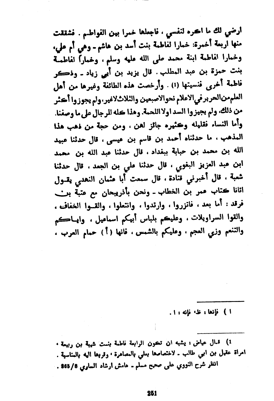 أَرْضَى لَكَ مَا أَكْرَهُ لِنَفْسِي فَاجْعَلْهَا خُمُرًا بَيْنَ الْفَوَاطِمِ فَشَقَقْتُ مِنْهَا أَرْبَعَةَ أَخْمِرَةٍ خِمَارًا لِفَاطِمَةَ بِنْتِ أَسَدِ بْنِ هَاشِمٍ وَهِيَ أُمُّ عَلِيٍّ وَخِمَارًا لِفَاطِمَةَ ابْنَةِ مُحَمَّدٍ صَلَّى اللَّهُ عَلَيْهِ وَسَلَّمَ وَخِمَارًا لِفَاطِمَةَ بِنْتِ حَمْزَةَ بْنِ عَبْدِ الْمُطَّلِبِ قَالَ يَزِيدُ بْنُ أَبِي زِيَادٍ وَذَكَرَ فَاطِمَةً أُخْرَى فَنَسِيتُهَا وَأَرْخَصَتْ هَذِهِ الطَّائِفَةُ وَغَيْرُهَا مِنْ أَهْلِ الْعِلْمِ مِنَ الْحَرِيرِ فِي الْأَعْلَامِ نَحْوِ الْأُصْبُعَيْنِ وَالثَّلَاثِ لَا غَيْرَ وَلَمْ يُجَوِّزُوا أَكْثَرَ مِنْ ذَلِكَ وَلَمْ يُجِيزُوا السَّدَا وَلَا اللُّحْمَةَ وَهَذَا كُلُّهُ لِلرِّجَالِ عَلَى مَا وَصَفْنَا وَأَمَّا النِّسَاءُ فَقَلِيلُهُ وَكَثِيرُهُ جَائِزٌ لَهُنَّ وَمِنْ حُجَّةِ مَنْ ذَهَبَ هَذَا الْمَذْهَبَ مَا حَدَّثَنَاهُ أَحْمَدُ بْنُ قَاسِمِ بْنِ عِيسَى قَالَ حَدَّثَنَا عُبَيْدُ اللَّهِ بْنُ مُحَمَّدِ بْنِ حُبَابَةَ بِبَغْدَادَ قَالَ حَدَّثَنَا عَبْدُ اللَّهِ بْنُ مُحَمَّدِ بْنِ عَبْدِ الْعَزِيزِ الْبَغَوِيُّ قَالَ حَدَّثَنَا عَلِيُّ بْنُ الْجَعْدِ قَالَ حَدَّثَنَا شُعْبَةُ قَالَ أَخْبَرَنِي قَتَادَةُ قَالَ سَمِعْتُ أَبَا عُثْمَانَ النَّهْدِيَّ يَقُولُ أَتَانَا كِتَابُ عُمَرَ بْنِ الْخَطَّابِ وَنَحْنُ بِأَذْرَبِيجَانَ مَعَ عُتْبَةَ بْنِ فَرْقَدٍ أَمَّا بَعْدُ فَاتَّزِرُوا وَارْتَدُوا وَانْتَعِلُوا وَأَلْقُوا الْخِفَافَ وَأَلْقُوا السَّرَاوِيلَاتِ وَعَلَيْكُمْ بِلِبَاسِ أَبِيكُمْ إِسْمَاعِيلَ وَإِيَّاكُمْ وَالتَّنَعُّمَ وَزِيَّ الْعَجَمِ وَعَلَيْكُمْ بِالشَّمْسِ فَإِنَّهَا حَمَّامُ الْعَرَبِ