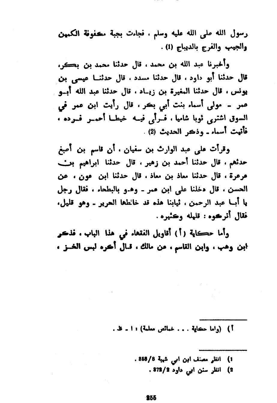 رَسُولِ اللَّهِ صَلَّى اللَّهُ عَلَيْهِ وَسَلَّمَ فَجَاءَتِ بِجُبَّةٍ مَكْفُوفَةِ الْكُمَّيْنِ وَالْجَيْبِ وَالْفُرَجِ بِالدِّيبَاجِ وَأَخْبَرَنَا عَبْدُ اللَّهِ بْنُ مُحَمَّدٍ قَالَ حَدَّثَنَا مُحَمَّدُ بْنُ بَكْرٍ قَالَ حَدَّثَنَا أَبُو دَاوُدَ قَالَ حَدَّثَنَا مُسَدَّدٌ قَالَ حَدَّثَنَا عِيسَى بْنُ يُونُسَ قَالَ حَدَّثَنَا الْمُغِيرَةُ بْنُ زِيَادٍ قَالَ حَدَّثَنَا عَبْدُ اللَّهِ أَبُو عُمَرَ مَوْلَى أَسْمَاءَ بِنْتِ أَبِي بَكْرٍ قَالَ رَأَيْتُ ابْنَ عُمَرَ فِي السُّوقِ اشْتَرَى ثَوْبًا شَامِيًّا فَرَأَى فِيهِ خَيْطًا أَحْمَرَ فَرَدَّهُ فَأَتَيْتُ أَسْمَاءَ وَذَكَرَ الْحَدِيثَ وَقَرَأْتُ عَلَى عَبْدِ الْوَارِثِ بْنِ سُفْيَانَ أَنَّ قَاسِمَ بْنَ أَصْبَغَ حَدَّثَهُمْ قَالَ حَدَّثَنَا أَحْمَدُ بْنُ زُهَيْرٍ قَالَ حَدَّثَنَا إِبْرَاهِيمُ بْنُ عَرْعَرَةَ قَالَ حَدَّثَنَا مُعَاذُ بْنُ مُعَاذٍ قَالَ حَدَّثَنَا ابْنُ عَوْنٍ عَنِ الْحَسَنِ قَالَ دَخَلْنَا عَلَى ابْنِ عُمَرَ وَهُوَ بِالْبَطْحَاءِ فَقَالَ رَجُلٌ يَا أَبَا عَبْدِ الرَّحْمَنِ ثِيَابُنَا هَذِهِ قَدْ خَالَطَهَا الْحَرِيرُ وَهُوَ قَلِيلٌ فَقَالَ اتْرُكُوهُ قَلِيلُهُ وَكَثِيرُهُ وَأَمَّا حِكَايَةُ أَقَاوِيلِ الْفُقَهَاءِ فِي هَذَا الْبَابِ فَذَكَرَ ابْنُ وَهْبٍ وَابْنُ الْقَاسِمِ عَنْ مَالِكٍ قَالَ أَكْرَهُ لُبْسَ الْخَزِّ