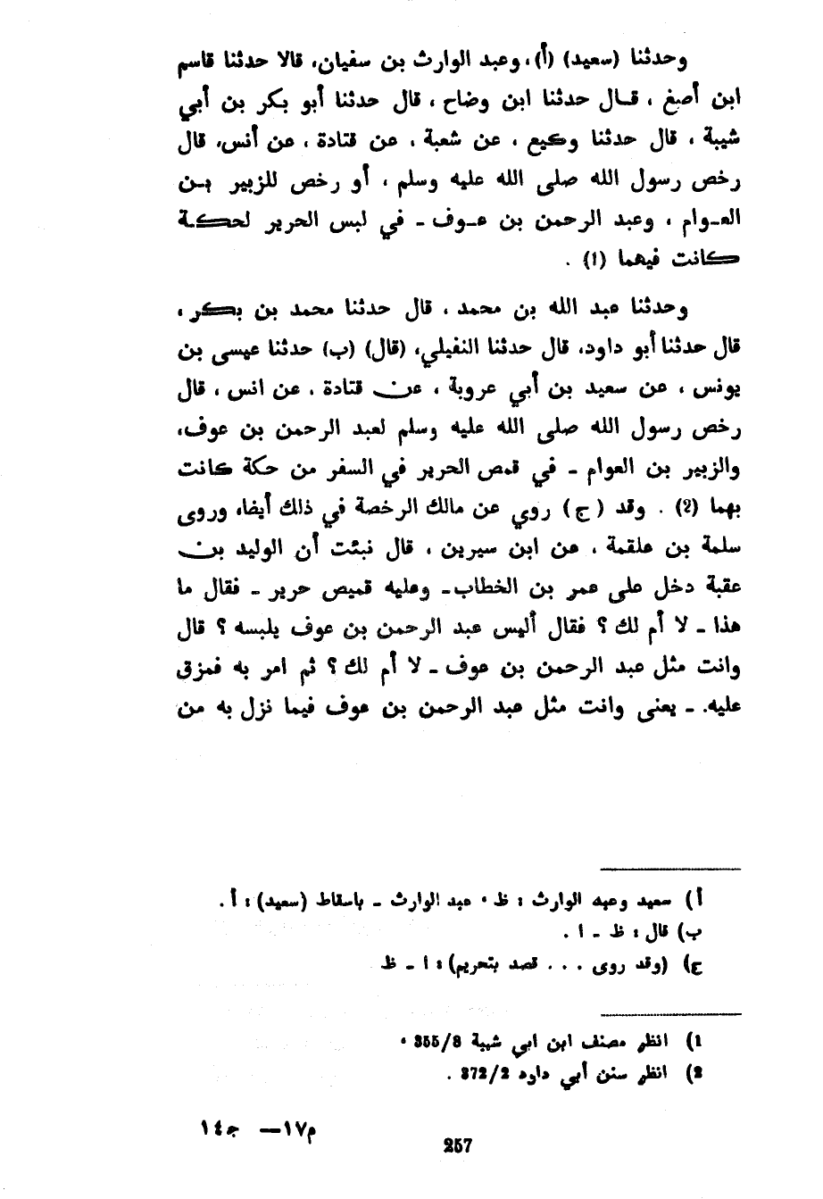 وحدثنا (سعيد) (أ) وَعَبْدُ الْوَارِثِ بْنُ سُفْيَانَ قَالَا حَدَّثَنَا قَاسِمُ بْنُ أَصْبَغَ قَالَ حَدَّثَنَا ابْنُ وَضَّاحٍ قَالَ حَدَّثَنَا أَبُو بَكْرِ بْنُ أَبِي شَيْبَةَ قَالَ حَدَّثَنَا وَكِيعٌ عَنْ شُعْبَةَ عَنْ قَتَادَةَ عَنْ أَنَسٍ قَالَ رَخَّصَ رَسُولُ اللَّهِ صَلَّى اللَّهُ عَلَيْهِ وَسَلَّمَ أَوْ رَخَّصَ لِلزُّبَيْرِ بْنِ الْعَوَّامِ وَعَبْدِ الرَّحْمَنِ بْنِ عَوْفٍ فِي لُبْسِ الْحَرِيرِ لِحَكَّةٍ كَانَتْ فِيهِمَا وَحَدَّثَنَا عَبْدُ اللَّهِ بْنُ مُحَمَّدٍ قَالَ حَدَّثَنَا مُحَمَّدُ بْنُ بَكْرٍ قَالَ حَدَّثَنَا أَبُو دَاوُدَ قَالَ حَدَّثَنَا النُّفَيْلِيُّ (قَالَ) (ب) حَدَّثَنَا عِيسَى بْنُ يُونُسَ عَنْ سَعِيدِ بْنِ أَبِي عَرُوبَةَ عَنْ قَتَادَةَ عَنْ أَنَسٍ قَالَ رَخَّصَ رَسُولُ اللَّهِ صَلَّى اللَّهُ عَلَيْهِ وَسَلَّمَ لِعَبْدِ الرَّحْمَنِ بْنِ عَوْفٍ وَالزُّبَيْرِ بْنِ الْعَوَّامِ فِي قُمُصِ الْحَرِيرِ فِي السَّفَرِ مِنْ حَكَّةٍ كَانَتْ بِهِمَا وَقَدْ رُوِيَ عَنْ مَالِكٍ الرُّخْصَةُ فِي ذَلِكَ أَيْضًا وَرَوَى سَلَمَةُ بْنُ عَلْقَمَةَ عَنِ ابْنِ سِيرِينَ قَالَ نُبِّئْتُ أَنَّ الْوَلِيدَ بْنَ عُقْبَةَ دَخَلَ عَلَى عُمَرَ بْنِ الْخَطَّابِ وَعَلَيْهِ قَمِيصُ حَرِيرٍ فَقَالَ مَا هَذَا لَا أُمَّ لَكَ فَقَالَ أَلَيْسَ عَبْدُ الرَّحْمَنِ بْنُ عَوْفٍ يَلْبَسُهُ قَالَ وَأَنْتَ مِثْلُ عَبْدِ الرَّحْمَنِ بْنِ عَوْفٍ لَا أُمَّ لَكَ ثُمَّ أَمَرَ بِهِ فَمُزِّقَ عَلَيْهِ يَعْنِي وَأَنْتَ مِثْلُ عَبْدِ الرَّحْمَنِ بْنِ عَوْفٍ فِيمَا نَزَلَ بِهِ مِنْ