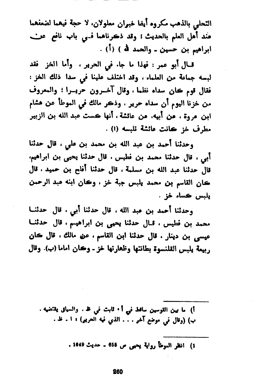 التَّحَلِّيَ بِالذَّهَبِ مَكْرُوهٌ أَيْضًا خَبَرَانِ مَعْلُولَانِ لَا حُجَّةَ فِيهِمَا لِضَعْفِهِمَا عِنْدَ أَهْلِ الْعِلْمِ بِالْحَدِيثِ وَقَدْ ذَكَرْنَاهُمَا فِي بَابِ نَافِعٍ عَنْ إِبْرَاهِيمَ بْنِ حُسَيْنٍ وَالْحَمْدُ لِلَّهِ) قَالَ أَبُو عُمَرَ فَهَذَا مَا جَاءَ فِي الْحَرِيرِ وَأَمَّا الْخَزُّ فَقَدْ لَبِسَهُ جَمَاعَةٌ مِنَ الْعُلَمَاءِ وَقَدِ اخْتُلِفَ عَلَيْنَا فِي سَدَا ذَلِكَ الْخَزِّ فَقَالَ قَوْمٌ كَانَ سَدَاهُ نَظْمًا وَقَالَ آخَرُونَ حَرِيرًا وَالْمَعْرُوفُ مِنْ خَزِّنَا الْيَوْمَ أَنَّ سَدَاهُ حَرِيرٌ وَذَكَرَ مَالِكٌ فِي الْمُوَطَّأِ عَنْ هِشَامِ بْنِ عُرْوَةَ عَنْ أَبِيهِ عَنْ عَائِشَةَ أَنَّهَا كَسَتْ عَبْدَ اللَّهِ بْنَ الزُّبَيْرِ مُطْرَفَ خَزٍّ كَانَتْ عَائِشَةُ تَلْبَسُهُ وَحَدَّثَنَا أَحْمَدُ بْنُ عَبْدِ اللَّهِ بْنِ مُحَمَّدٍ بْنِ عَلِيٍّ قَالَ حَدَّثَنَا أَبِي قَالَ حَدَّثَنَا مُحَمَّدُ بْنُ فُطَيْسٍ قَالَ حَدَّثَنَا يَحْيَى بْنُ إِبْرَاهِيمَ قَالَ حَدَّثَنَا عَبْدُ اللَّهِ بْنُ مَسْلَمَةَ قَالَ حَدَّثَنَا أَفْلَحُ بْنُ حُمَيْدٍ قَالَ كَانَ الْقَاسِمُ بْنُ مُحَمَّدٍ يَلْبَسُ جُبَّةَ خَزٍّ وَكَانَ ابْنُهُ عَبْدُ الرَّحْمَنِ يَلْبَسُ كِسَاءَ خَزٍّ وَحَدَّثَنَا أَحْمَدُ بْنُ عَبْدِ اللَّهِ قَالَ حَدَّثَنَا أَبِي قَالَ حَدَّثَنَا مُحَمَّدُ بْنُ فُطَيْسٍ قَالَ حَدَّثَنَا يَحْيَى بْنُ إِبْرَاهِيمَ قَالَ حَدَّثَنَا عِيسَى بْنُ دِينَارٍ قَالَ حَدَّثَنَا ابْنُ الْقَاسِمِ عَنْ مَالِكٍ قَالَ كَانَ رَبِيعَةُ يَلْبَسُ الْقَلَنْسُوَةَ بِطَانَتُهَا وَظِهَارِتُهُا خَزٌّ وَكَانَ إِمَامًا وَقَالَ