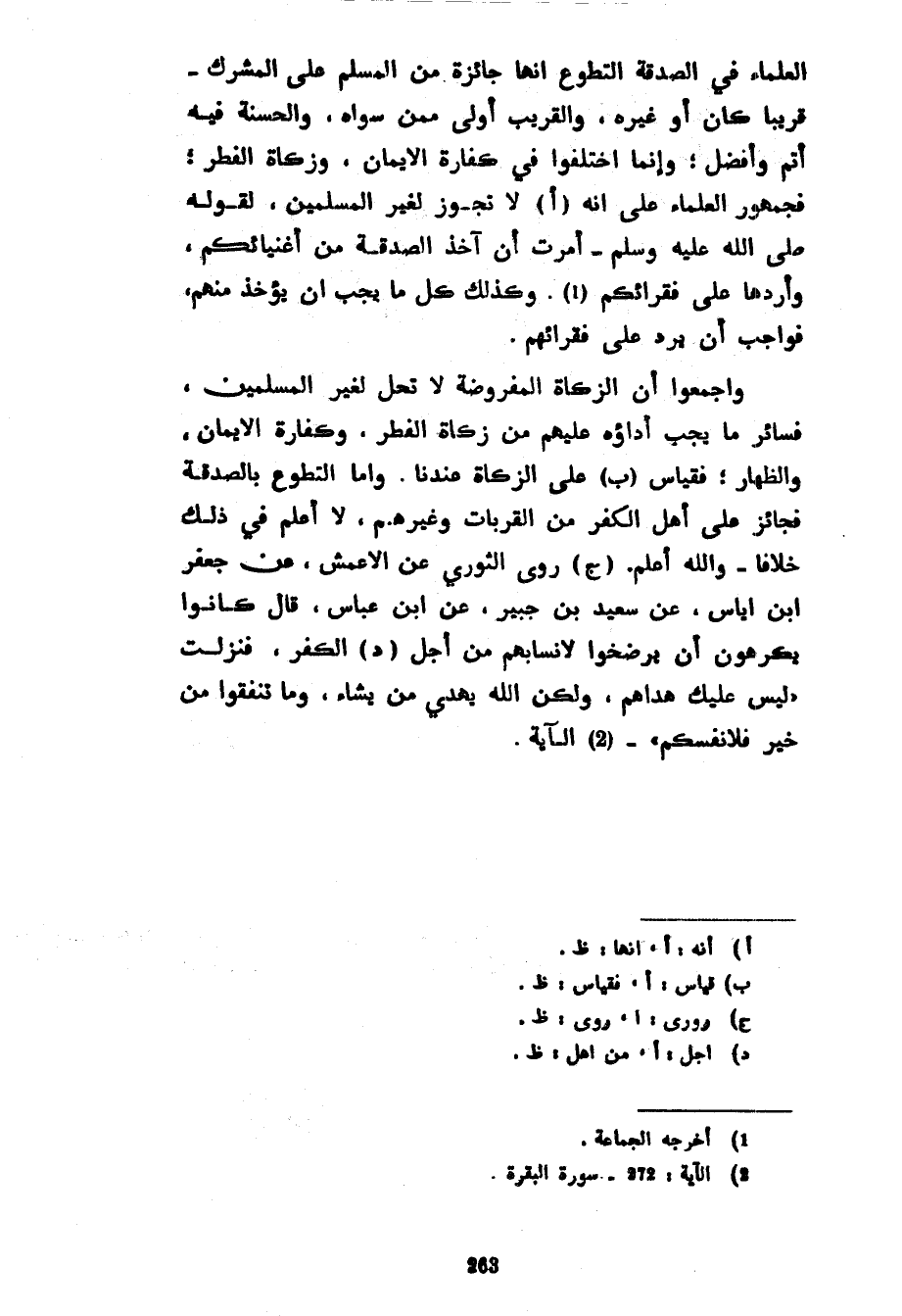 الْعُلَمَاءُ فِي الصَّدَقَةِ التَّطَوُّعِ أَنَّهَا جَائِزَةٌ مِنَ الْمُسْلِمِ عَلَى الْمُشْرِكِ قَرِيبًا كَانَ أَوْ غَيْرَهُ والقريب ألوى مِمَّنْ سِوَاهُ وَالْحَسَنَةُ فِيهِ أَتَمُّ وَأَفْضَلُ وَإِنَّمَا اخْتَلَفُوا فِي كَفَّارَةِ الْأَيْمَانِ وَزَكَاةِ الْفِطْرِ فَجُمْهُورُ الْعُلَمَاءِ عَلَى أَنَّهُ لَا تَجُوزُ لِغَيْرِ الْمُسْلِمِينَ لِقَوْلِهِ صَلَّى اللَّهُ عَلَيْهِ وَسَلَّمَ أُمِرْتُ أَنْ آخُذَ الصَّدَقَةَ مِنْ أَغْنِيَائِكُمْ وَأَرُدَّهَا عَلَى فُقَرَائِكُمْ وَكَذَلِكَ كَلَّ مَا يَجِبُ أَنْ يُؤْخَذَ مِنْهُمْ فَوَاجِبٌ أَنْ يَرُدَّ عَلَى فُقَرَائِهِمْ وَأَجْمَعُوا أَنَّ الزَّكَاةَ الْمَفْرُوضَةَ لَا تَحِلُّ لِغَيْرِ الْمُسْلِمِينَ فَسَائِرُ مَا يَجِبُ أَدَاؤُهُ عَلَيْهِمْ مِنْ زَكَاةِ الْفِطْرِ وَكَفَّارَةِ الْأَيْمَانِ وَالظِّهَارِ فَقِيَاسٌ عَلَى الزَّكَاةِ عِنْدَنَا وَأَمَّا التَّطَوُّعُ بِالصَّدَقَةِ فَجَائِزٌ عَلَى أَهْلِ الْكُفْرِ مِنَ الْقُرُبَاتِ وَغَيْرِهِمْ لَا أَعْلَمُ فِي ذَلِكَ خِلَافًا وَاللَّهُ أَعْلَمُ رَوَى الثَّوْرِيُّ عَنِ الْأَعْمَشِ عَنْ جَعْفَرِ بْنِ إِيَاسٍ عَنْ سَعِيدِ بْنِ جُبَيْرٍ عَنِ ابْنِ عَبَّاسٍ قَالَ كَانُوا يَكْرَهُونَ أَنْ يَرْضَخُوا لِأَنْسَابِهِمْ مِنْ أَجْلِ الْكُفْرِ فَنَزَلَتْ لَيْسَ عَلَيْكَ هُدَاهُمْ وَلَكِنَّ اللَّهَ يَهْدِي مَنْ يَشَاءُ وَمَا تُنْفِقُوا مِنْ خَيْرٍ فَلِأَنْفُسِكُمْ الْآيَةَ