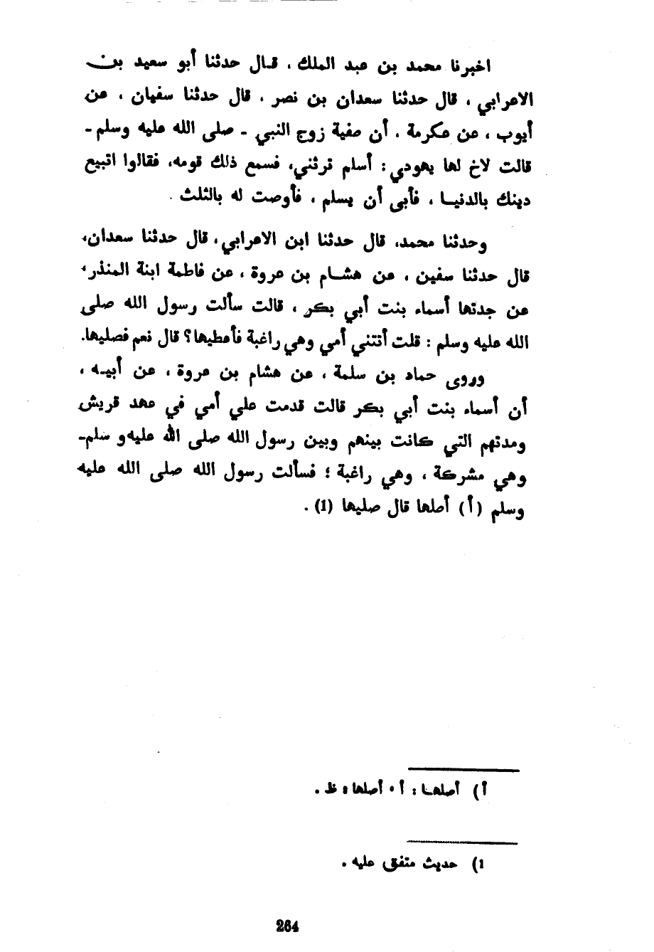 أَخْبَرَنَا مُحَمَّدُ بْنُ عَبْدِ الْمَلِكِ قَالَ حَدَّثَنَا أَبُو سَعِيدِ بْنُ الْأَعْرَابِيِّ قَالَ حَدَّثَنَا سَعْدَانُ بْنُ نَصْرٍ قَالَ حَدَّثَنَا سُفْيَانُ عَنْ أَيُّوبَ عَنْ عِكْرِمَةَ أَنَّ صَفِيَّةَ زَوْجَ النَّبِيِّ صَلَّى اللَّهُ عَلَيْهِ وَسَلَّمَ قَالَتْ لِأَخٍ لَهَا يَهُودِيٍّ أَسْلَمَ تَرِثُنِي فَسَمِعَ ذَلِكَ قَوْمُهُ فَقَالُوا أَتَبِيعُ دِينَكَ بِالدُّنْيَا فَأَبَى أَنْ يُسْلِمَ فَأَوْصَتْ لَهُ بِالثُّلُثِ وَحَدَّثَنَا مُحَمَّدٌ قَالَ حَدَّثَنَا ابْنُ الْأَعْرَابِيِّ قَالَ حَدَّثَنَا سَعْدَانُ قال حدثنا عَنْ هِشَامِ بْنِ عُرْوَةَ عَنْ فَاطِمَةَ ابْنَةِ الْمُنْذِرِ عَنْ جَدَّتِهَا أَسْمَاءَ بِنْتِ أَبِي بَكْرٍ قَالَتْ سَأَلْتُ رَسُولَ اللَّهِ صَلَّى اللَّهُ عَلَيْهِ وَسَلَّمَ قُلْتُ أَتَتْنِي أُمِّي وَهِيَ رَاغِبَةٌ فَأُعْطِيهَا قَالَ نَعَمْ فَصِلِيهَا وَرَوَى حَمَّادُ بْنُ سَلَمَةَ عَنْ هِشَامِ بْنِ عُرْوَةَ عَنْ أَبِيهِ أَنَّ أَسْمَاءَ بِنْتَ أَبِي بَكْرٍ قَالَ قَدَمَتْ عَلَيَّ أُمِّي فِي عَهْدِ قُرَيْشٍ وَمُدَّتِهِمُ الَّتِي كَانَتْ بَيْنَهُمْ وَبَيَّنَ رَسُولُ اللَّهِ صَلَّى اللَّهُ عَلَيْهِ وَسَلَّمَ وَهِيَ مُشْرِكَةٌ وَهِيَ رَاغِبَةٌ فَسَأَلْتُ رَسُولَ اللَّهِ صَلَّى اللَّهُ عَلَيْهِ وَسَلَّمَ أَصِلُهَا قَالَ صليها