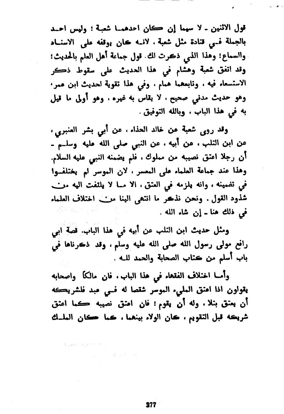 قَوْلُ الِاثْنَيْنِ لَا سِيَّمَا إِنْ كَانَ أَحَدُهُمَا شُعْبَةَ وَلَيْسَ أَحَدٌ بِالْجُمْلَةِ فِي قَتَادَةَ مِثْلَ شُعْبَةَ لِأَنَّهُ كَانَ يُوقِفُهُ عَلَى الْإِسْنَادِ وَالسَّمَاعِ وهذا الذي ذكرت لك قول جماعةأهل الْعِلْمِ بِالْحَدِيثِ وَقَدِ اتَّفَقَ شُعْبَةُ وَهِشَامٌ فِي هَذَا الْحَدِيثِ عَلَى سُقُوطِ ذِكْرِ الِاسْتِسْعَاءِ فِيهِ وَتَابَعَهُمَا هَمَّامٌ وَفِي هَذَا تَقْوِيَةٌ لِحَدِيثِ ابْنِ عُمَرَ وَهُوَ حَدِيثٌ مَدَنِيٌّ صَحِيحٌ لَا يُقَاسُ بِهِ غَيْرُهُ وَهُوَ أَوْلَى مَا قِيلَ بِهِ فِي هَذَا الْبَابِ وَبِاللَّهِ التَّوْفِيقُ وَقَدْ رَوَى شعبة عن خالد الحذاء عن أبي بشر العنبري عَنِ ابْنِ التِّلِبِّ عَنْ أَبِيهِ عَنِ النَّبِيِّ صَلَّى اللَّهُ عَلَيْهِ وَسَلَّمَ أَنَّ رَجُلًا أَعْتَقَ نَصِيبَهُ مِنْ مَمْلُوكٍ فَلَمْ يَضْمَنْهُ النَّبِيُّ عَلَيْهِ السَّلَامُ وَهَذَا عِنْدَ جَمَاعَةِ الْعُلَمَاءِ عَلَى الْمُعْسِرِ لِأَنَّ الْمُوسِرَ لَمْ يَخْتَلِفُوا فِي تَضْمِينِهِ وَأَنَّهُ يَلْزَمُهُ فِي الْعِتْقِ إِلَّا مَا لَا يُلْتَفَتُ إِلَيْهِ مِنْ شُذُوذِ الْقَوْلِ وَنَحْنُ نَذْكُرُ مَا انْتَهَى إِلَيْنَا مِنَ اخْتِلَافِ الْعُلَمَاءِ فِي ذَلِكَ هُنَا إِنْ شَاءَ اللَّهُ وَمِثْلُ حَدِيثِ ابْنِ التِّلِبِّ عَنْ أَبِيهِ فِي هَذَا الْبَابِ قِصَّةُ أَبِي رَافِعٍ مَوْلَى رَسُولِ اللَّهِ صَلَّى اللَّهُ عَلَيْهِ وَسَلَّمَ وَقَدْ ذَكَرْنَاهَا فِي بَابِ أَسْلَمَ مِنْ كِتَابِ الصَّحَابَةِ وَالْحَمْدُ لِلَّهِ وَأَمَّا اخْتِلَافُ الْفُقَهَاءِ فِي هَذَا الْبَابِ فَإِنَّ مَالِكًا وَأَصْحَابَهُ يَقُولُونَ إِذَا أَعْتَقَ الْمَلِيءُ الْمُوسِرُ شِقْصًا لَهُ فِي عَبْدٍ فَلِشَرِيكِهِ أَنْ يُعْتِقَ بِتَلَا وَلَهُ أَنْ يُقَوِّمَ فَإِنْ أَعْتَقَ نَصِيبَهُ كَمَا أَعْتَقَ شَرِيكُهُ قَبْلَ التَّقْوِيمِ كَانَ الْوَلَاءُ بَيْنَهُمَا كَمَا كان الملك