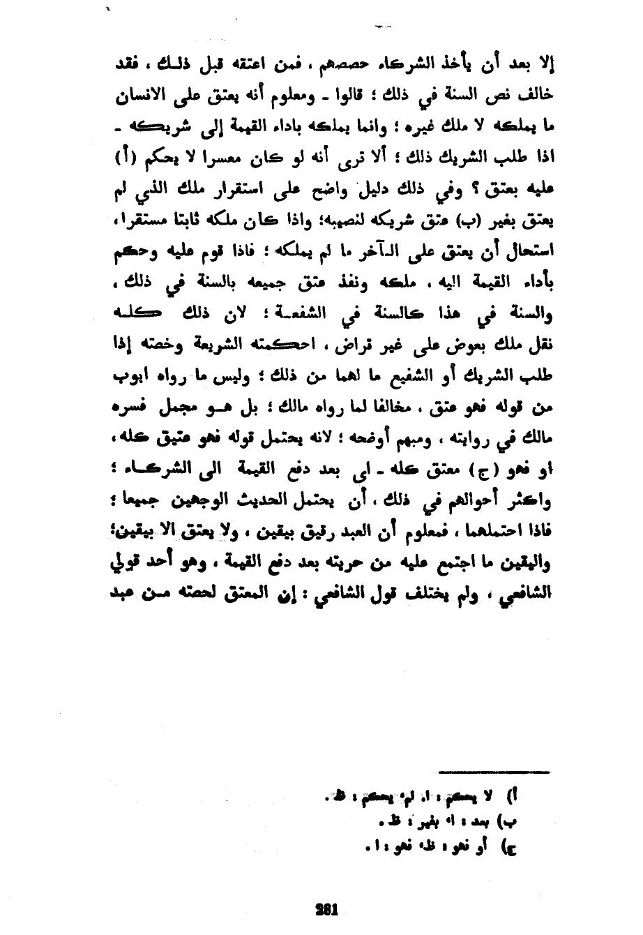إِلَّا بَعْدَ أَنْ يَأْخُذَ الشُّرَكَاءُ حِصَصَهُمْ فَمَنْ أَعْتَقَهُ قَبْلَ ذَلِكَ فَقَدْ خَالَفَ نَصَّ السُّنَّةِ فِي ذَلِكَ قَالُوا وَمَعْلُومٌ أَنَّهُ يُعْتِقُ عَلَى الْإِنْسَانِ مَا يَمْلِكُهُ لَا مِلْكَ غَيْرِهِ وَإِنَّمَا يَمْلِكُهُ بِأَدَاءِ الْقِيمَةِ إِلَى شَرِيكِهِ إِذَا طَلَبَ الشَّرِيكُ ذَلِكَ أَلَا تَرَى أَنَّهُ لَوْ كَانَ مُعْسِرًا لَا يَحْكُمُ عَلَيْهِ بِعِتْقٍ وَفِي ذَلِكَ دَلِيلٌ وَاضِحٌ عَلَى اسْتِقْرَارِ مِلْكِ الَّذِي لَمْ يُعْتِقُ بِغَيْرِ عِتْقِ شَرِيكِهِ لِنَصِيبِهِ وَإِذَا كَانَ ملكه ثابتا مُسْتَقِرًّا اسْتَحَالَ أَنْ يُعْتِقَ عَلَى الْآخَرِ مَا لم يملكه فإا قَوَّمَ عَلَيْهِ وَحَكَمَ بِأَدَاءِ الْقِيمَةِ إِلَيْهِ مَلَكَهُ وَنَفَذَ عِتْقُ جَمِيعِهِ بِالسُّنَّةِ فِي ذَلِكَ وَالسُّنَّةِ فِي هَذَا كَالسُّنَّةِ فِي الشُّفْعَةِ لِأَنَّ ذَلِكَ كله نقل ملك بعوض على غير تَرَاضٍ أَحْكَمَتْهُ الشَّرِيعَةُ وَخَصَّتْهُ إِذَا طَلَبَ الشَّرِيكُ أَوِ الشَّفِيعُ مَا لَهُمَا مِنْ ذَلِكَ وَلَيْسَ مَا رَوَاهُ أَيُّوبُ مِنْ قَوْلِهِ فَهُوَ عِتْقٌ مُخَالِفًا لِمَا رَوَاهُ مَالِكٌ بَلْ هُوَ مُجْمَلٌ فَسَّرَهُ مَالِكٌ فِي رِوَايَتِهِ وَمُبْهَمٌ أُوَضِّحُهُ لِأَنَّهُ يَحْتَمِلُ قَوْلَهُ فَهُوَ عَتِيقٌ كُلُّهُ أَوْ فَهُوَ مُعْتَقٌ كُلُّهُ أَيْ بَعْدَ دَفْعِ الْقِيمَةِ إِلَى الشُّرَكَاءِ وَأَكْثَرُ أَحْوَالِهِمْ فِي ذَلِكَ أَنْ يَحْتَمِلَهُ الْحَدِيثُ الْوَجْهَيْنِ جَمِيعًا فَإِذَا احْتَمَلَهُمَا فَمَعْلُومٌ أَنَّ الْعَبْدَ رَقِيقٌ بِيَقِينٍ وَلَا يُعْتِقُ إِلَّا بِيَقِينٍ وَالْيَقِينُ مَا اجْتَمَعَ عَلَيْهِ مِنْ حُرِّيَّتِهِ بَعْدَ دَفْعِ الْقِيمَةِ وَهُوَ أَحَدُ قَوْلَيِ الشَّافِعِيُّ وَلَمْ يَخْتَلِفْ قَوْلُ الشَّافِعِيِّ إِنَّ الْمُعْتِقَ لِحِصَّتِهِ مِنْ عبد