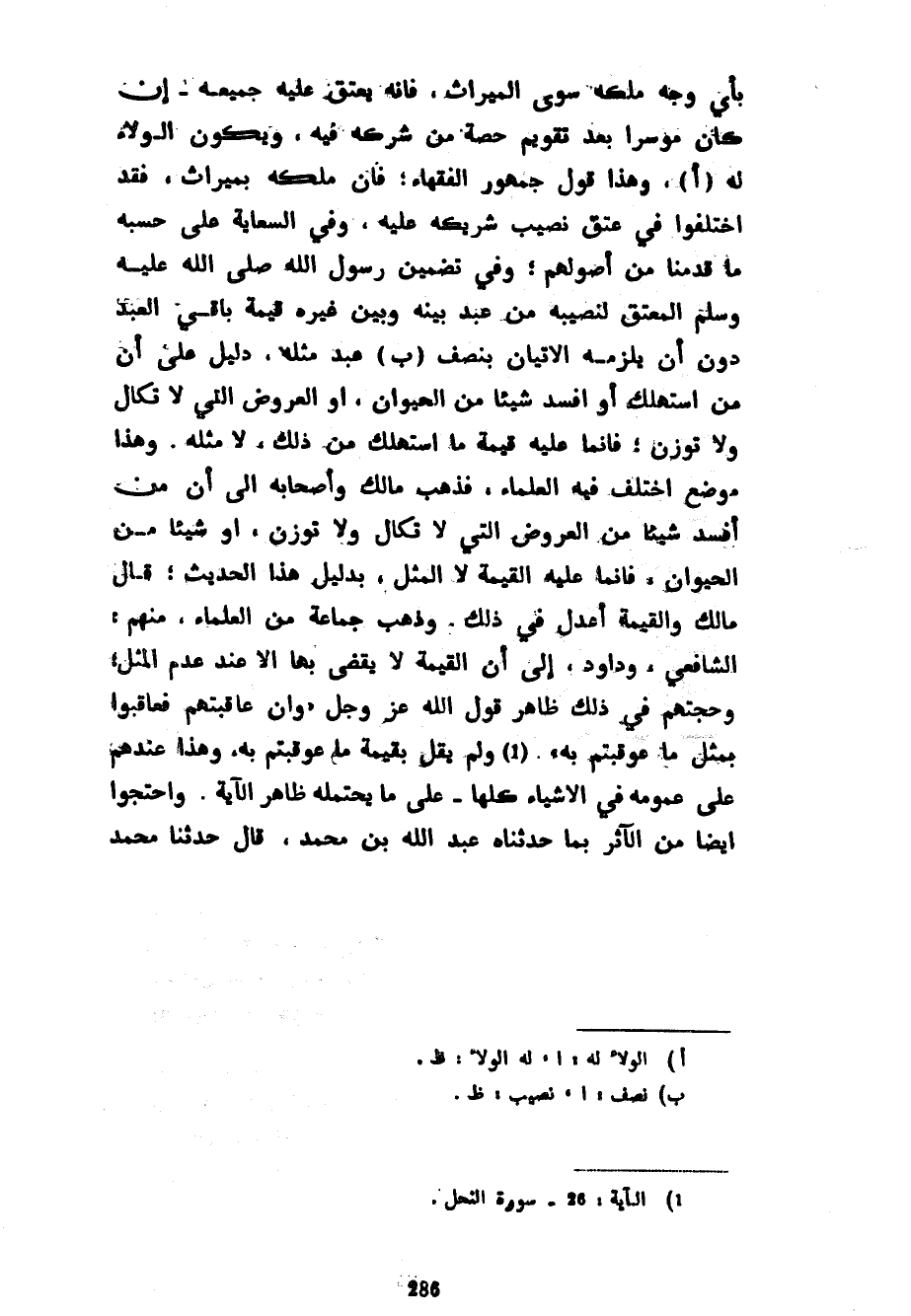 بِأَيِّ وَجْهٍ مَلَكَهُ سِوَى الْمِيرَاثِ فَإِنَّهُ يُعْتِقُ عَلَيْهِ جَمِيعُهُ إِنْ كَانَ مُوسِرًا بَعْدَ تَقْوِيمِ حِصَّةٍ مِنْ شِرْكِهِ فِيهِ وَيَكُونُ الْوَلَاءُ لَهُ وَهَذَا قَوْلُ جُمْهُورِ الْفُقَهَاءِ فَإِنْ مَلَكَهُ بِمِيرَاثٍ فَقَدِ اخْتَلَفُوا فِي عِتْقِ نَصِيبِ شَرِيكِهِ عَلَيْهِ وَفِي السِّعَايَةِ عَلَى حَسَبِهِ مَا قَدَّمْنَا مِنْ أُصُولِهِمْ وَفِي تَضْمِينِ رَسُولِ اللَّهِ صَلَّى اللَّهُ عَلَيْهِ وَسَلَّمَ الْمُعْتِقَ لِنَصِيبِهِ مِنْ عَبْدٍ بَيْنَهُ وَبَيْنَ غَيْرِهِ قِيمَةَ بَاقِي الْعَبْدِ دُونَ أَنْ يلزمه الإتيان بِنِصْفِ عَبْدٍ مِثْلِهِ دَلِيلٌ عَلَى أَنَّ مَنِ اسْتَهْلَكَ أَوْ أَفْسَدَ شَيْئًا مِنَ الْحَيَوَانِ أَوِ الْعُرُوضِ الَّتِي لَا تُكَالُ وَلَا تُوزَنُ فَإِنَّمَا عَلَيْهِ قِيمَةُ مَا اسْتَهْلَكَ مِنْ ذَلِكَ لَا مِثْلُهُ وَهَذَا مَوْضِعٌ اخْتَلَفَ فِيهِ الْعُلَمَاءُ فَذَهَبَ مَالِكٌ وَأَصْحَابُهُ إِلَى أَنَّ مَنْ أَفْسَدَ شَيْئًا مِنَ الْعُرُوضِ الَّتِي لَا تُكَالُ وَلَا تُوزَنُ أَوْ شَيْئًا مِنَ الْحَيَوَانِ فَإِنَّمَا عَلَيْهِ الْقِيمَةُ لَا الْمِثْلُ بِدَلِيلِ هَذَا الْحَدِيثِ قَالَ مَالِكٌ وَالْقِيمَةُ أَعْدَلُ فِي ذَلِكَ وَذَهَبَ جَمَاعَةٌ مِنَ الْعُلَمَاءِ مِنْهُمُ الشَّافِعِيُّ وَدَاوُدُ إِلَى أَنَّ الْقِيمَةَ لَا يُقْضَى بِهَا إِلَّا عِنْدَ عَدَمِ الْمِثْلِ وَحُجَّتُهُمْ فِي ذَلِكَ ظَاهِرُ قَوْلِ اللَّهِ عَزَّ وَجَلَّ وَإِنْ عَاقَبْتُمْ فَعَاقِبُوا بِمِثْلِ مَا عُوقِبْتُمْ بِهِ وَلَمْ يَقُلْ بِقِيمَةِ مَا عُوقِبْتُمْ بِهِ وَهَذَا عِنْدَهُمْ عَلَى عُمُومِهِ فِي الْأَشْيَاءِ كُلِّهَا عَلَى مَا يَحْتَمِلُهُ ظَاهِرُ الْآيَةِ وَاحْتَجُّوا أَيْضًا مِنَ الْآثَارِ بِمَا حَدَّثَنَاهُ عَبْدُ اللَّهِ بْنُ مُحَمَّدٍ قَالَ حَدَّثَنَا محمد