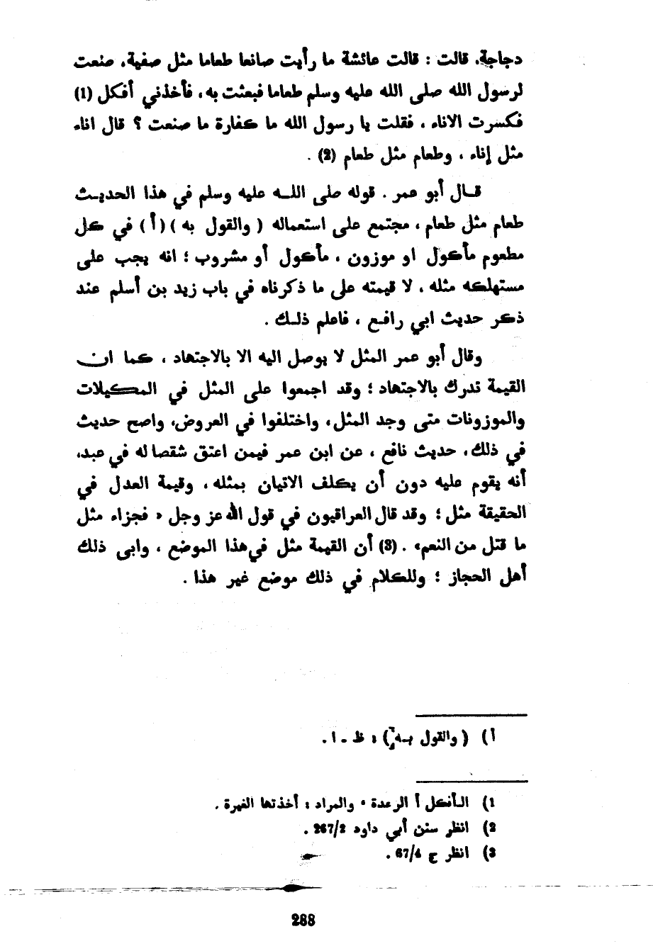 دَجَاجَةَ قَالَتْ قَالَتْ عَائِشَةُ مَا رَأَيْتُ صَانِعًا طَعَامًا مِثْلَ صَفِيَّةَ صَنَعَتْ لِرَسُولِ اللَّهِ صَلَّى اللَّهُ عَلَيْهِ وَسَلَّمَ طَعَامًا فَبَعَثَتْ بِهِ فَأَخَذَنِي أَفْكَلُ فَكَسَرْتُ الْإِنَاءَ فَقُلْتُ يَا رَسُولَ اللَّهِ مَا كَفَّارَةُ مَا صَنَعْتُ قَالَ إِنَاءٌ مِثْلُ إِنَاءٍ وَطَعَامٌ مِثْلُ طَعَامٍ قَالَ أَبُو عُمَرَ قَوْلُهُ صَلَّى اللَّهُ عَلَيْهِ وَسَلَّمَ فِي هَذَا الْحَدِيثِ طَعَامٌ مِثْلُ طَعَامٍ مُجْتَمَعٌ عَلَى اسْتِعْمَالِهِ (والقول به) (أ) فِي كُلِّ مَطْعُومٍ مَأْكُولٍ أَوْ مَوْزُونٍ مَأْكُولٍ أَوْ مَشْرُوبٍ إِنَّهُ يَجِبُ عَلَى مُسْتَهْلِكِهِ مِثْلُهُ لَا قِيمَتُهُ عَلَى مَا ذَكَرْنَاهُ فِي بَابِ زَيْدِ بْنِ أَسْلَمَ عِنْدَ ذِكْرِ حَدِيثِ أَبِي رَافِعٍ فَاعْلَمْ ذَلِكَ وَقَالَ أَبُو عُمَرَ الْمِثْلُ لَا يُوصَلُ إِلَيْهِ إِلَّا بِالِاجْتِهَادِ كَمَا أَنَّ الْقِيمَةَ تُدْرَكُ بِالِاجْتِهَادِ وَقَدْ أَجْمَعُوا عَلَى الْمِثْلِ فِي الْمَكِيلَاتِ وَالْمَوْزُونَاتِ مَتَّى وُجِدَ الْمِثْلُ وَاخْتَلَفُوا فِي الْعُرُوضِ وَأَصَحُّ حَدِيثٍ فِي ذَلِكَ حَدِيثُ نَافِعٍ عَنِ ابْنِ عُمَرَ فِيمَنْ أَعْتَقَ شِقْصًا لَهُ فِي عَبْدٍ أَنَّهُ يُقَوَّمُ عَلَيْهِ دُونَ أن يكلف الإيتان بِمِثْلِهِ وَقِيمَةُ الْعَدْلِ فِي الْحَقِيقَةِ مِثْلٌ وَقَدْ قَالَ الْعِرَاقِيُّونَ فِي قَوْلِ اللَّهِ عَزَّ وَجَلَّ فَجَزَاءٌ مِثْلُ مَا قَتَلَ مِنَ النَّعَمِ أَنَّ الْقِيمَةَ مِثْلٌ فِي هَذَا الْمَوْضِعِ وَأَبَى ذَلِكَ أَهْلُ الْحِجَازِ وَلِلْكَلَامِ فِي ذَلِكَ مَوْضِعٌ غَيْرُ هذا