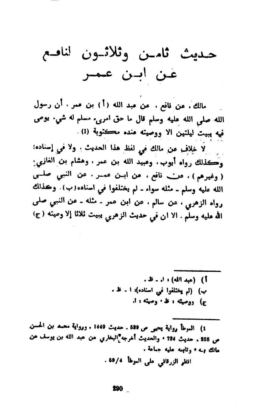 حَدِيثٌ ثَامِنٌ وَثَلَاثُونَ لِنَافِعٍ عَنِ ابْنِ عُمَرَ مَالِكٌ عَنْ نَافِعٍ عَنْ عَبْدِ اللَّهِ بْنِ عُمَرَ أَنَّ رَسُولَ اللَّهِ صَلَّى اللَّهُ عَلَيْهِ وَسَلَّمَ قَالَ مَا حَقُّ امْرِئٍ مُسْلِمٍ لَهُ شَيْءٌ يُوصِي فِيهِ يَبِيتُ لَيْلَتَيْنِ إِلَّا وَوَصِيَّتُهُ عِنْدَهُ مَكْتُوبَةٌ لَا خِلَافَ عَنْ مَالِكٍ فِي لَفْظِ هَذَا الْحَدِيثِ وَلَا فِي إِسْنَادِهِ وَكَذَلِكَ رَوَاهُ أَيُّوبُ وَعُبَيْدُ اللَّهِ بْنُ عُمَرَ وَهِشَامُ بْنُ الْغَازِي (وَغَيْرُهُمْ) عَنْ نَافِعٍ عَنِ ابْنِ عُمَرَ عَنِ النَّبِيِّ صَلَّى اللَّهُ عَلَيْهِ وَسَلَّمَ مِثْلَهُ سَوَاءً لَمْ يَخْتَلِفُوا فِي إِسْنَادِهِ وَكَذَلِكَ رَوَاهُ الزُّهْرِيُّ عَنْ سَالِمٍ عَنِ ابْنِ عُمَرَ مِثْلَهُ عَنِ النَّبِيِّ صَلَّى اللَّهُ عَلَيْهِ وَسَلَّمَ إِلَّا أَنَّ فِي حَدِيثِ الزُّهْرِيِّ يَبِيتُ ثَلَاثًا إلا وصيته