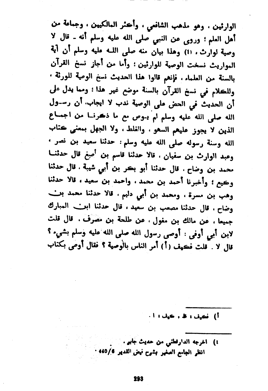 الْوَارِثِينَ وَهُوَ مَذْهَبُ الشَّافِعِيِّ وَأَكْثَرُ الْمَالِكِيِّينَ وَجَمَاعَةٍ مِنْ أَهْلِ الْعِلْمِ وَرُوِيَ عَنِ النَّبِيِّ صَلَّى اللَّهُ عَلَيْهِ وَسَلَّمَ أَنَّهُ قَالَ لَا وَصِيَّةَ لِوَارِثٍ وَهَذَا بَيَانٌ مِنْهُ صَلَّى اللَّهُ عَلَيْهِ وَسَلَّمَ أَنَّ آيَةَ الْمَوَارِيثِ نَسَخَتِ الْوَصِيَّةَ لِلْوَارِثِينَ وَأَمَّا مَنْ أَجَازَ نَسْخَ الْقُرْآنِ بِالسُّنَّةِ مِنَ الْعُلَمَاءِ فَإِنَّهُمْ قَالُوا هَذَا الْحَدِيثُ نَسَخَ الْوَصِيَّةَ لِلْوَرَثَةِ وَلِلْكَلَامِ فِي نَسْخِ الْقُرْآنِ بِالسُّنَّةِ مَوْضِعٌ غَيْرُ هَذَا وَمِمَّا يَدُلُّ عَلَى أَنَّ الْحَدِيثَ فِي الْحَضِّ عَلَى الْوَصِيَّةِ نَدْبٌ لَا إِيجَابٌ أن رسول الله صلى الله عليه وسلم لَمْ يُوصِ مَعَ مَا ذَكَرْنَا مِنْ إِجْمَاعِ الَّذِينَ لَا يَجُوزُ عَلَيْهِمُ السَّهْوُ وَالْغَلَطُ وَلَا الْجَهْلُ بِمَعْنَى كِتَابِ اللَّهِ وَسُنَّةِ رَسُولِهِ صَلَّى اللَّهُ عَلَيْهِ وَسَلَّمَ حَدَّثَنَا سَعِيدُ بْنُ نَصْرٍ وَعَبْدُ الْوَارِثِ بْنُ سُفْيَانَ قَالَا حَدَّثَنَا قَاسِمُ بْنُ أَصْبَغَ قَالَ حَدَّثَنَا مُحَمَّدُ بْنُ وَضَّاحٍ قَالَ حَدَّثَنَا أَبُو بَكْرِ بْنُ أَبِي شَيْبَةَ قَالَ حَدَّثَنَا وَكِيعٌ وَأَخْبَرَنَا أَحْمَدُ بْنُ مُحَمَّدٍ وَأَحْمَدُ بْنُ سَعِيدٍ قَالَا حَدَّثَنَا وَهْبُ بْنُ مَسَرَّةَ وَمُحَمَّدُ بْنُ أَبِي دُلَيْمٍ قَالَا حَدَّثَنَا مُحَمَّدُ بْنُ وَضَّاحٍ قَالَ حَدَّثَنَا مُصْعَبُ بْنُ سَعِيدٍ قَالَ حَدَّثَنَا ابْنُ الْمُبَارَكِ جَمِيعًا عَنْ مَالِكِ بْنِ مِغْوَلٍ عَنْ طَلْحَةَ بْنِ مُصَرِّفٍ قَالَ قُلْتُ لِابْنِ أَبِي أَوْفَى أَوْصَى رَسُولُ اللَّهِ صَلَّى اللَّهُ عَلَيْهِ وَسَلَّمَ بِشَيْءٍ قَالَا لَا قُلْتُ فَكَيْفَ أَمَرَ النَّاسَ بِالْوَصِيَّةِ فَقَالَ أوصى بكتاب