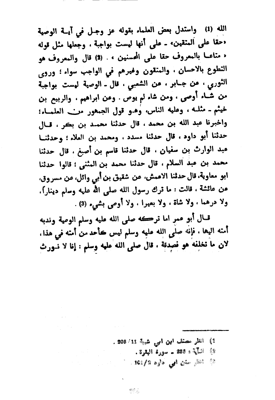 اللَّهِ وَاسْتَدَلَّ بَعْضُ الْعُلَمَاءِ بِقَوْلِهِ عَزَّ وَجَلَّ فِي آيَةِ الْوَصِيَّةِ حَقًّا عَلَى الْمُتَّقِينَ عَلَى أَنَّهَا لَيْسَتْ بِوَاجِبَةٍ وَجَعَلَهَا مِثْلَ قَوْلِهِ مَتَاعًا بِالْمَعْرُوفِ حَقًّا عَلَى الْمُحْسِنِينَ قَالَ وَالْمَعْرُوفُ هُوَ التَّطَوُّعُ بِالْإِحْسَانِ وَالْمُتَّقُونَ وَغَيْرُهُمْ فِي الْوَاجِبِ سَوَاءٌ وَرَوَى الثَّوْرِيُّ عَنْ جَابِرٍ عَنِ الشَّعْبِيِّ قَالَ الْوَصِيَّةُ لَيْسَتْ بِوَاجِبَةٍ مَنْ شَاءَ أَوْصَى وَمَنْ شَاءَ لَمْ يُوصِ وَعَنْ إِبْرَاهِيمَ وَالرَّبِيعِ بْنِ خيثم مِثْلُهُ وَعَلَيْهِ النَّاسُ وَهُوَ قَوْلُ الْجُمْهُورِ مِنَ الْعُلَمَاءِ وَأَخْبَرَنَا عَبْدُ اللَّهِ بْنُ مُحَمَّدٍ قَالَ حَدَّثَنَا مُحَمَّدُ بْنُ بَكْرٍ قَالَ حَدَّثَنَا أَبُو دَاوُدَ قَالَ حَدَّثَنَا مُسَدَّدٌ وَمُحَمَّدُ بْنُ الْعَلَاءِ وَحَدَّثَنَا عَبْدُ الْوَارِثِ بْنُ سُفْيَانَ قَالَ حَدَّثَنَا قَاسِمُ بْنُ أَصْبَغَ قَالَ حَدَّثَنَا مُحَمَّدُ بْنُ عَبْدِ السَّلَامِ قَالَ حَدَّثَنَا مُحَمَّدُ بْنُ الْمُثَنَّى قَالُوا حَدَّثَنَا أَبُو مُعَاوِيَةَ قَالَ حَدَّثَنَا الْأَعْمَشُ عَنْ شَقِيقِ بْنِ أَبِي وَائِلٍ عَنْ مَسْرُوقٍ عَنْ عَائِشَةَ قَالَتْ مَا تَرَكَ رَسُولُ اللَّهِ صَلَّى اللَّهُ عَلَيْهِ وَسَلَّمَ دِينَارًا وَلَا دِرْهَمًا وَلَا شَاةً وَلَا بَعِيرًا وَلَا أَوْصَى بِشَيْءٍ قَالَ أَبُو عُمَرَ أَمَّا تَرْكُهُ صَلَّى اللَّهُ عَلَيْهِ وَسَلَّمَ الْوَصِيَّةَ وَنَدْبُهُ أَمَتَّهُ إِلَيْهَا فَإِنَّهُ صَلَّى اللَّهُ عَلَيْهِ وَسَلَّمَ لَيْسَ كَأَحَدٍ مِنْ أُمَّتِهِ فِي هَذَا لِأَنَّ ما تخلفه هُوَ فَصَدَقَةٌ قَالَ صَلَّى اللَّهُ عَلَيْهِ وَسَلَّمَ إِنَّا لَا نُورَثُ
