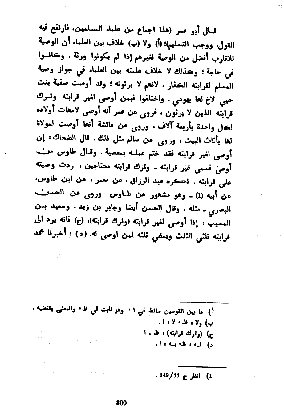 قَالَ أَبُو عُمَرَ (هَذَا إِجْمَاعٌ مِنْ عُلَمَاءِ المسلمين فارتفع فيه القول ووجب التسليم) (أ) وَلَا خِلَافَ بَيْنَ الْعُلَمَاءِ أَنَّ الْوَصِيَّةَ لِلْأَقَارِبِ أَفْضَلُ مِنَ الْوَصِيَّةِ لِغَيْرِهِمْ إِذَا لَمْ يَكُونُوا وَرَثَةً وَكَانُوا فِي حَاجَةٍ وَكَذَلِكَ لَا خِلَافَ عَلِمَتْهُ بَيْنَ الْعُلَمَاءِ فِي جَوَازِ وَصِيَّةِ الْمُسْلِمِ لِقَرَابَتِهِ الْكُفَّارِ لِأَنَّهُمْ لَا يَرِثُونَهُ وَقَدْ أَوْصَتْ صَفِيَّةُ بِنْتُ حُيَّيٍ لِأَخٍ لَهَا يَهُودِيٍّ وَاخْتَلَفُوا فِيمَنْ أَوْصَى لِغَيْرِ قَرَابَتِهِ وَتَرَكَ قَرَابَتَهُ الَّذِينَ لَا يَرْثُونَ فَرُوِيَ عَنْ عُمَرَ أَنَّهُ أَوْصَى لِأُمَّهَاتِ أَوْلَادِهِ لِكُلِّ وَاحِدَةٍ بِأَرْبَعَةِ آلَافٍ وَرُوِيَ عَنْ عَائِشَةَ أَنَّهَا أَوْصَتْ لِمَوْلَاةٍ لَهَا بِأَثَاثِ الْبَيْتِ وَرُوِيَ عَنْ سَالِمٍ مِثْلُ ذَلِكَ قَالَ الضَّحَّاكُ إِنْ أَوْصَى لِغَيْرِ قَرَابَتِهِ فَقَدْ خَتَمَ عَمَلَهُ بِمَعْصِيَةٍ وَقَالَ طَاوُسٌ مَنْ أَوْصَى فَسَمَّى غَيْرَ قَرَابَتِهِ وَتَرَكَ قَرَابَتَهُ مُحْتَاجِينَ رُدَّتْ وَصِيَّتُهُ عَلَى قَرَابَتِهِ ذَكَرَهُ عَبْدُ الرَّزَّاقِ عَنْ مَعْمَرٍ عَنِ ابْنِ طَاوُسٍ عَنْ أَبِيهِ وَهُوَ مَشْهُورٌ عَنْ طَاوُسٍ وَرُوِيَ عَنِ الْحَسَنِ الْبَصْرِيِّ مِثْلَهُ وَقَالَ الْحَسَنُ أَيْضًا وَجَابِرُ بْنُ زَيْدٍ وَسَعِيدُ بْنُ الْمُسَيَّبِ إِذَا أَوْصَى لِغَيْرِ قَرَابَتِهِ (وَتَرَكَ قرابته) (ج) فَإِنَّهُ يَرُدُّ إِلَى قَرَابَتِهِ ثُلُثَيِ الثُّلُثِ وَيَمْضِي ثلثه لمن أوصى له أخبرنا محمد