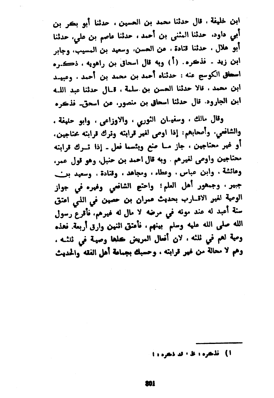 ابن خَلِيفَةَ قَالَ حَدَّثَنَا مُحَمَّدُ بْنُ الْحُسَيْنِ حَدَّثَنَا أَبُو بَكْرِ بْنُ أَبِي دَاوُدَ حَدَّثَنَا الْمُثَنَّى بْنُ أَحْمَدَ حَدَّثَنَا عَاصِمُ بْنُ عَلِيٍّ حَدَّثَنَا أَبُو هِلَالٍ حَدَّثَنَا قَتَادَةُ عَنِ الْحَسَنِ وَسَعِيدِ بْنِ الْمُسَيَّبِ وَجَابِرِ بْنِ زَيْدٍ فَذَكَرَهُ وَبِهِ قَالَ إِسْحَاقُ بْنُ رَاهَوَيْهِ ذَكَرَهُ إِسْحَاقُ الْكَوْسَجُ عَنْهُ حَدَّثَنَاهُ أَحْمَدُ بْنُ مُحَمَّدِ بْنِ أَحْمَدَ وَعُبَيْدُ بْنُ مُحَمَّدٍ قَالَا حَدَّثَنَا الْحَسَنُ بْنُ سَلَمَةَ قَالَ حَدَّثَنَا عَبْدُ اللَّهِ بْنُ الْجَارُودِ قَالَ حَدَّثَنَا إِسْحَاقُ بْنُ مَنْصُورٍ عن إسحق فَذَكَرَهُ وَقَالَ مَالِكٌ وَسُفْيَانُ الثَّوْرِيُّ وَالْأَوْزَاعِيُّ وَأَبُو حَنِيفَةَ وَالشَّافِعِيُّ وَأَصْحَابُهُمْ إِذَا أَوْصَى لِغَيْرِ قَرَابَتِهِ وَتَرَكَ قَرَابَتَهُ مُحْتَاجِينَ أَوْ غَيْرَ مُحْتَاجِينَ جَازَ مَا صَنَعَ وَبِئْسَمَا فَعَلَ إِذَا تَرَكَ قَرَابَتَهُ مُحْتَاجِينَ وَأَوْصَى لِغَيْرِهِمْ وَبِهِ قَالَ أَحْمَدُ بْنُ حَنْبَلٍ وَهُوَ قَوْلُ عُمَرَ وَعَائِشَةَ وَابْنِ عَبَّاسٍ وَعَطَاءٍ وَمُجَاهِدٍ وَقَتَادَةَ وَسَعِيدِ بْنِ جُبَيْرٍ وَجُمْهُورُ أَهْلِ الْعِلْمِ وَاحْتَجَّ الشَّافِعِيُّ وَغَيْرُهُ فِي جَوَازِ الْوَصِيَّةِ لِغَيْرِ الْأَقَارِبِ بِحَدِيثِ عِمْرَانَ بْنِ حُصَيْنٍ فِي الَّذِي أَعْتَقَ سِتَّةَ أَعْبُدُ لَهُ عِنْدَ مَوْتِهِ فِي مَرَضِهِ لَا مَالَ لَهُ غَيْرُهُمْ فَأَقْرَعُ رَسُولُ اللَّهِ صَلَّى اللَّهُ عَلَيْهِ وَسَلَّمَ بَيْنَهُمْ فَأَعْتَقَ اثْنَيْنِ وَأَرَقَّ أَرْبَعَةً فَهَذِهِ وَصِيَّةٌ لَهُمْ فِي ثُلُثِهِ لِأَنَّ أَفْعَالَ الْمَرِيضِ كُلَّهَا وَصِيَّةٌ فِي ثُلُثِهِ وَهُمْ لَا مَحَالَةَ مِنْ غَيْرِ قَرَابَتِهِ وَحَسْبُكَ بِجَمَاعَةِ أَهْلِ الْفِقْهِ وَالْحَدِيثِ