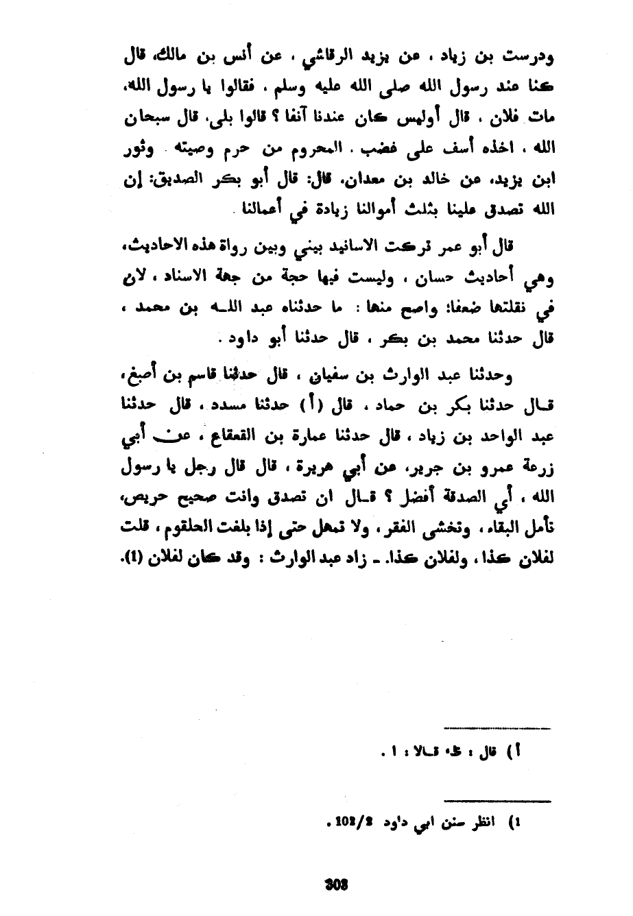 وَدُرُسْتُ بْنُ زِيَادٍ عَنْ يَزِيدَ الرَّقَاشِيِّ عَنْ أَنْسِ بْنِ مَالِكٍ قَالَ كُنَّا عِنْدَ رَسُولِ اللَّهِ صَلَّى اللَّهُ عَلَيْهِ وَسَلَّمَ فَقَالُوا يَا رَسُولَ اللَّهِ مَاتَ فُلَانٌ قَالَ أَوْ لَيْسَ كَانَ عِنْدَنَا آنِفًا قَالُوا بَلَى قَالَ سُبْحَانَ اللَّهِ أَخَذَهُ أَسَفٌ عَلَى غَضَبٍ الْمَحْرُومُ مِنْ حُرِمَ وَصِيَّتَهُ وَثَوْرُ بْنُ يَزِيدَ عَنْ خَالِدِ بْنِ مَعْدَانَ قَالَ قَالَ أَبُو بَكْرٍ الصِّدِّيقُ إِنَّ اللَّهَ تَصَدَّقَ عَلَيْنَا بِثُلُثِ أَمْوَالِنَا زِيَادَةً فِي أَعْمَالِنَا قَالَ أَبُو عُمَرَ تَرَكْتُ الْأَسَانِيدَ بَيْنِي وَبَيْنَ رُوَاةِ هَذِهِ الْأَحَادِيثِ وَهِيَ أَحَادِيثُ حِسَانٌ وَلَيْسَتْ فِيهَا حُجَّةً مِنْ جِهَةِ الْإِسْنَادِ لأن في نقلتها ضعفا واضح مِنْهَا مَا حَدَّثَنَاهُ عَبْدُ اللَّهِ بْنُ مُحَمَّدٍ قَالَ حَدَّثَنَا مُحَمَّدُ بْنُ بَكْرٍ قَالَ حَدَّثَنَا أَبُو دَاوُدَ وَحَدَّثَنَا عَبْدُ الْوَارِثِ بْنُ سُفْيَانَ قَالَ حَدَّثَنَا قَاسِمُ بْنُ أَصْبَغَ قَالَ حَدَّثَنَا بَكْرُ بْنُ حَمَّادٍ قَالَ حَدَّثَنَا مُسَدَّدٌ قَالَ حَدَّثَنَا عَبْدُ الْوَاحِدِ بْنُ زِيَادٍ قَالَ حَدَّثَنَا عِمَارَةُ بْنُ الْقَعْقَاعِ عَنْ أَبِي زُرْعَةَ عَمْرِو بْنِ جَرِيرٍ عَنْ أَبِي هُرَيْرَةَ قَالَ قَالَ رَجُلٌ يَا رَسُولَ اللَّهِ أَيُّ الصَّدَقَةِ أَفْضَلُ قَالَ أَنْ تَصَدَّقَ وَأَنْتَ صَحِيحٌ حَرِيصٌ تَأْمُلُ الْبَقَاءَ وَتَخْشَى الْفَقْرَ وَلَا تُمْهِلُ حَتَّى إِذَا بَلَغَتِ الْحُلْقُومَ قَلْتَ لِفُلَانٍ كَذَا وَلِفُلَانٍ كَذَا زَادَ عَبْدُ الْوَارِثِ وَقَدْ كَانَ لِفُلَانٍ