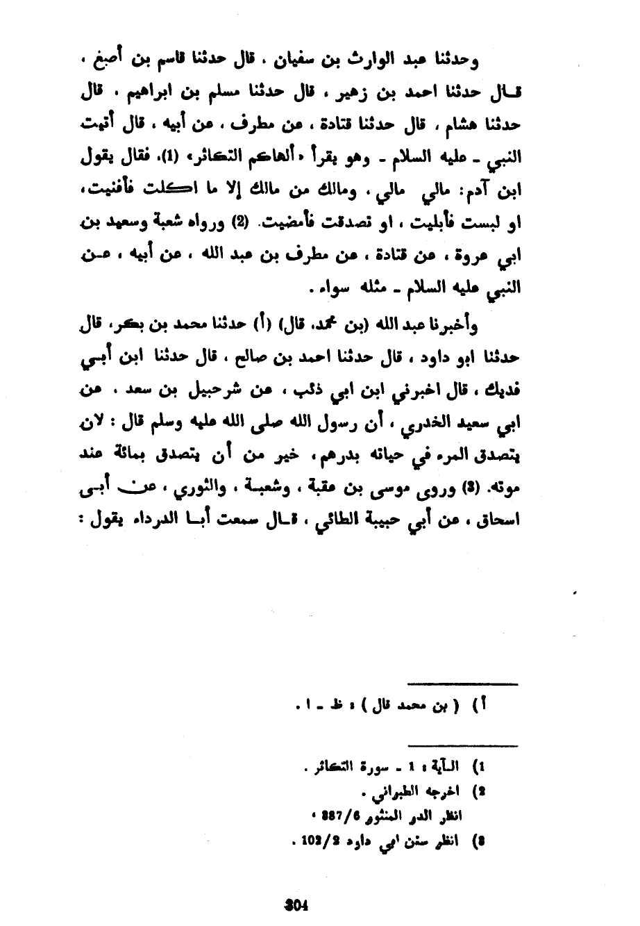 وَحَدَّثَنَا عَبْدُ الْوَارِثِ بْنُ سُفْيَانَ قَالَ حَدَّثَنَا قَاسِمُ بْنُ أَصْبَغَ قَالَ حَدَّثَنَا أَحْمَدُ بْنُ زُهَيْرٍ قَالَ حَدَّثَنَا مُسْلِمُ بْنُ إِبْرَاهِيمَ قَالَ حَدَّثَنَا هِشَامٌ قَالَ حَدَّثَنَا قَتَادَةُ عَنْ مُطَرِّفٍ عَنْ أَبِيهِ قَالَ أَتَيْتُ النَّبِيَّ عَلَيْهِ السَّلَامُ وَهُوَ يَقْرَأُ أَلْهَاكُمُ التَّكَاثُرُ فَقَالَ يَقُولُ ابْنُ آدَمَ مَالِي مَالِي وَمَا لَكِ مِنْ مَالِكَ إِلَّا مَا أَكَلْتَ فَأَفْنَيْتَ أَوْ لَبِسْتَ فَأَبْلَيْتَ أَوْ تَصَدَّقْتَ فَأَمْضَيْتَ وَرَوَاهُ شُعْبَةُ وَسَعِيدُ بْنُ أَبِي عُرْوَةَ عَنْ قَتَادَةَ عَنْ مُطَرِّفِ بْنِ عَبْدِ اللَّهِ عَنْ أَبِيهِ عَنِ النَّبِيِّ عَلَيْهِ السَّلَامُ مِثْلَهُ سَوَاءً وَأَخْبَرَنَا عَبْدُ اللَّهِ (بْنُ مُحَمَّدٍ قَالَ) (أ) حَدَّثَنَا مُحَمَّدُ بْنُ بَكْرٍ قَالَ حَدَّثَنَا أَبُو دَاوُدَ قَالَ حَدَّثَنَا أَحْمَدُ بْنُ صَالِحٍ قَالَ حَدَّثَنَا ابْنُ أَبِي فُدَيْكٍ قَالَ أَخْبَرَنِي ابْنُ أَبِي ذِئْبٍ عَنْ شُرَحْبِيلَ بْنِ سَعْدٍ عَنْ أَبِي سَعِيدٍ الْخُدْرِيِّ أَنَّ رَسُولَ اللَّهِ صَلَّى اللَّهُ عَلَيْهِ وَسَلَّمَ قَالَ لَأَنْ يَتَصَدَّقَ الْمَرْءُ فِي حَيَاتِهِ بِدِرْهَمٍ خَيْرٌ مِنْ أَنْ يَتَصَدَّقَ بِمِائَةٍ عِنْدِ مَوْتِهِ وَرَوَى مُوسَى بْنُ عُقْبَةَ وَشُعْبَةُ وَالثَّوْرِيُّ عَنْ أَبِي إِسْحَاقَ عَنْ أَبِي حَبِيبَةَ الطَّائِيِّ قَالَ سَمِعْتُ أَبَا الدَّرْدَاءِ يَقُولُ