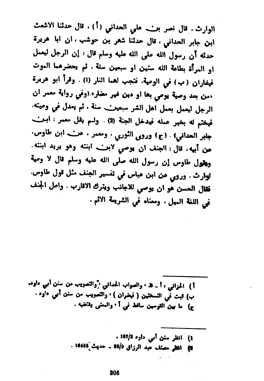 الْوَارِثِ قَالَ نَصْرُ بْنُ عَلِيٍّ الْحَدَّانِيُّ قَالَ حَدَّثَنَا الْأَشْعَثُ بْنُ جَابِرٍ الْحَدَّانِيُّ قَالَ حَدَّثَنَا شَهْرُ بْنُ حَوْشَبٍ أَنَّ أَبَا هُرَيْرَةَ حَدَّثَهُ أَنَّ رَسُولَ اللَّهِ صَلَّى اللَّهُ عَلَيْهِ وسلم قَالَ إِنَّ الرَّجُلَ لَيَعْمَلُ أَوِ الْمَرْأَةَ بِطَاعَةِ اللَّهِ سِتِّينَ أَوْ سَبْعِينَ سَنَةً ثُمَّ يَحْضُرُهُمَا الْمَوْتُ فَيُضَارَّانِ فِي الْوَصِيَّةِ فَتَجِبُ لَهُمَا النَّارُ وَقَرَأَ أَبُو هُرَيْرَةَ مِنْ بَعْدِ وَصِيَّةٍ يُوصَى بِهَا أَوْ دَيْنٍ غَيْرَ مُضَارٍّ (وَفِي رِوَايَةِ مَعْمَرٍ أَنَّ الرَّجُلَ لَيَعْمَلُ بِعَمَلِ أَهْلِ الشَّرِّ سَبْعِينَ سَنَةً ثُمَّ يَعْدِلُ فِي وَصِيَّتِهِ فَيُخْتَمُ لَهُ بِخَيْرِ عَمَلِهِ فَيَدْخُلُ الْجَنَّةَ (2) وَلَمْ يَقُلْ مَعْمَرٌ ابْنُ جَابِرٍ الْحَدَّانِيُّ) وَرَوَى الثَّوْرِيُّ وَمَعْمَرٌ عَنِ ابْنِ طَاوُسٍ عَنْ أَبِيهِ قَالَ الْجَنَفُ أَنْ يُوصِيَ لِابْنِ ابْنَتِهِ وَهُوَ يُرِيدُ ابْنَتَهُ وَيَقُولُ طَاوُسٌ إِنَّ رَسُولَ اللَّهِ صَلَّى اللَّهُ عَلَيْهِ وَسَلَّمَ قَالَ لَا وَصِيَّةَ لِوَارِثٍ وَرُوِيَ عَنِ ابْنِ عَبَّاسٍ فِي تَفْسِيرِ الْجَنَفِ مِثْلَ قَوْلِ طَاوُسٍ فَقَالَ الْحَسَنُ هُوَ أَنْ يُوصِيَ لِلْأَجَانِبِ وَيَتْرُكَ الْأَقَارِبَ وَأَصْلُ الْجَنَفِ فِي اللُّغَةِ الْمَيْلُ وَمَعْنَاهُ فِي الشَّرِيعَةِ الْإِثْمُ