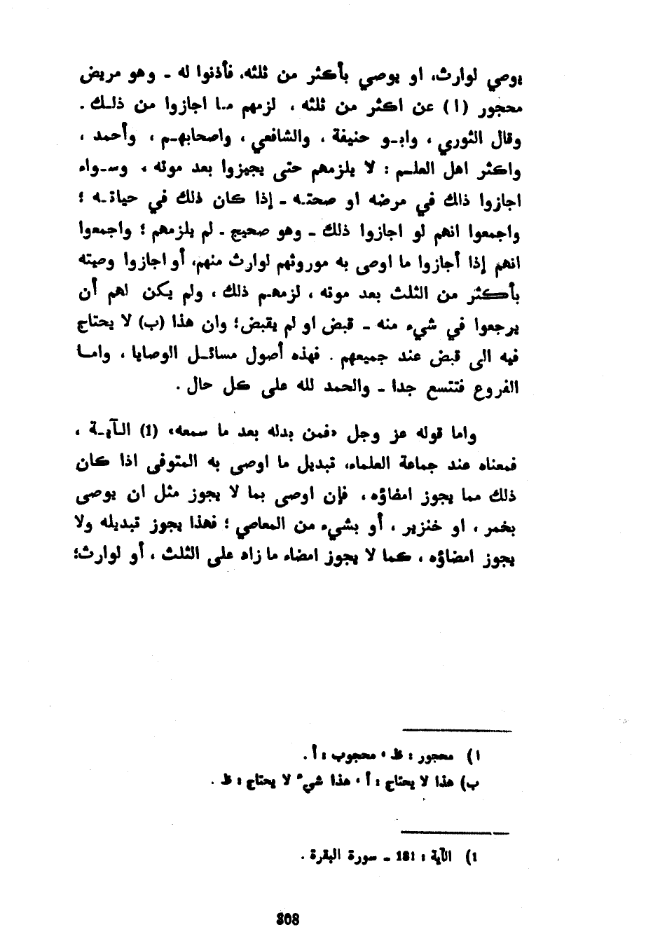 يُوصِيَ لِوَارِثٍ أَوْ يُوصِيَ بِأَكْثَرِ مِنْ ثُلُثِهِ فَأَذِنُوا لَهُ وَهُوَ مَرِيضٌ مَحْجُورٌ عَنْ أَكْثَرِ مِنْ ثُلُثِهِ لَزِمَهُمْ مَا أَجَازُوا مِنْ ذَلِكَ وَقَالَ الثَّوْرِيُّ وَأَبُو حَنِيفَةَ وَالشَّافِعِيُّ وَأَصْحَابُهُمْ وَأَحْمَدُ وَأَكْثَرُ أَهْلِ الْعِلْمِ لَا يَلْزَمُهُمْ حَتَّى يُجِيزُوا بَعْدَ مَوْتِهِ وَسَوَاءٌ أَجَازُوا ذَلِكَ فِي مَرَضِهِ أَوْ صِحَّتِهِ إِذَا كَانَ ذَلِكَ فِي حَيَاتِهِ وَأَجْمَعُوا أَنَّهُمْ لَوْ أَجَازُوا ذَلِكَ وَهُوَ صَحِيحٌ لَمْ يَلْزَمْهُمْ وَأَجْمَعُوا أَنَّهُمْ إِذَا أَجَازُوا مَا أوصى به موروثهم لِوَارِثٍ مِنْهُمْ أَوْ أَجَازُوا وَصِيَّتَهُ بِأَكْثَرِ مِنَ الثُّلُثِ بَعْدِ مَوْتِهِ لَزِمَهُمْ ذَلِكَ وَلَمْ يَكُنْ لَهُمْ أَنْ يَرْجِعُوا فِي شَيْءٍ مِنْهُ قُبِضَ أَوْ لَمْ يُقْبَضْ وَإِنَّ هَذَا لَا يُحْتَاجُ فِيهِ إِلَى قَبْضٍ عِنْدَ جَمِيعِهِمْ فَهَذِهِ أُصُولُ مَسَائِلِ الْوَصَايَا وَأَمَّا الْفُرُوعُ فَتَتَّسِعُ جِدًّا وَالْحَمْدُ لِلَّهِ عَلَى كُلِّ حَالٍ وَأَمَّا قَوْلُهُ عَزَّ وجل فمن بدله بعد ما سَمِعَهُ الْآيَةَ فَمَعْنَاهُ عِنْدَ جَمَاعَةِ الْعُلَمَاءِ تَبْدِيلُ مَا أَوْصَى بِهِ الْمُتَوَفَّى إِذَا كَانَ ذَلِكَ مِمَّا يَجُوزُ إِمْضَاؤُهُ فَإِنْ أَوْصَى بِمَا لَا يَجُوزُ مِثْلُ أَنْ يُوصِيَ بِخَمْرٍ أَوْ خِنْزِيرٍ أَوْ بِشَيْءٍ مِنَ الْمَعَاصِي فَهَذَا يَجُوزُ تَبْدِيلُهُ وَلَا يَجُوزُ إِمْضَاؤُهُ كَمَا لَا يَجُوزُ إِمْضَاءُ مَا زَادَ عَلَى الثُّلُثِ أَوْ لِوَارِثٍ