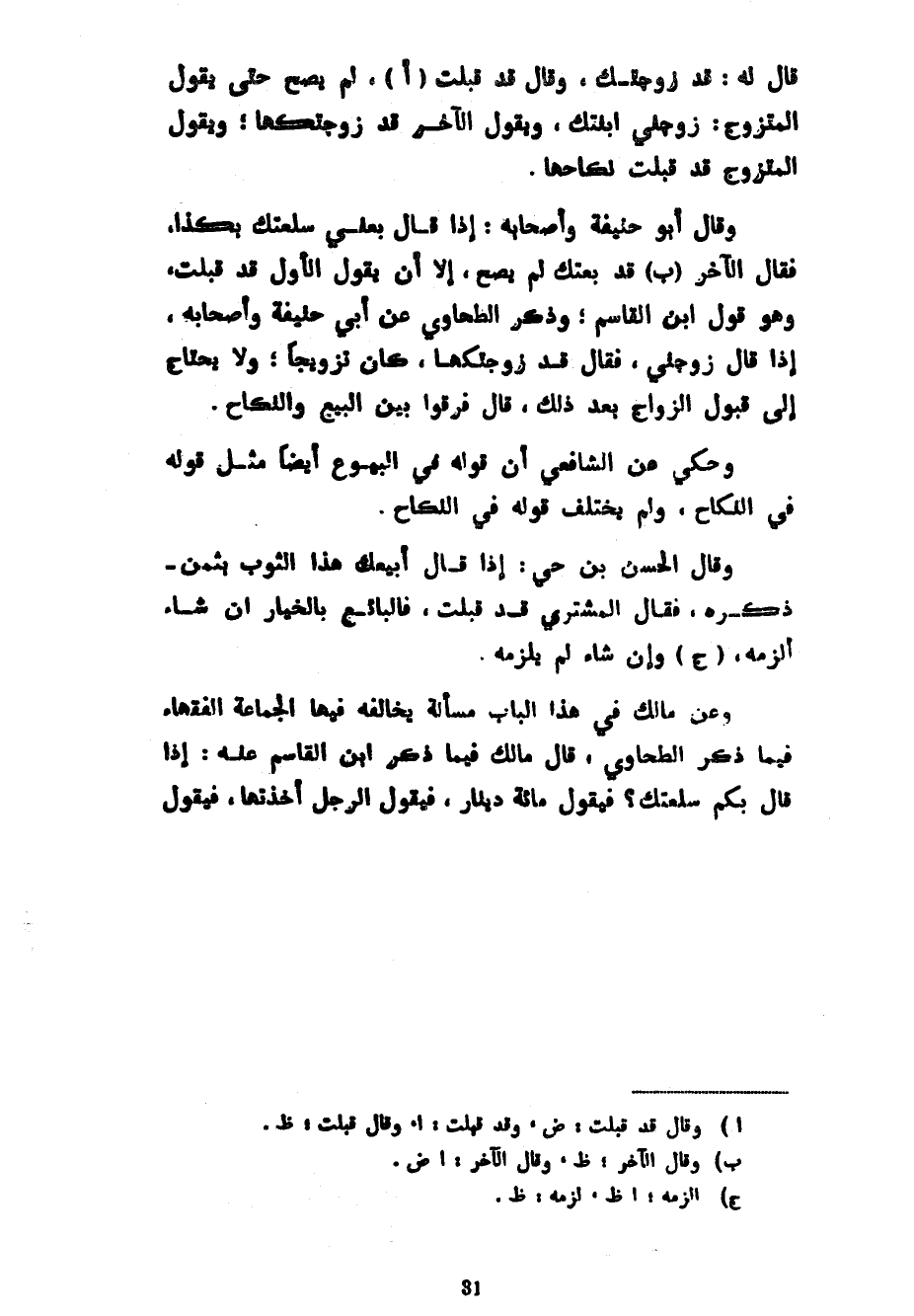 قَالَ لَهُ قَدْ زَوَّجْتُكَ وَقَالَ قَدْ قَبِلْتُ لَمْ يَصِحَّ حَتَّى يَقُولَ الْمُتَزَوِّجُ زَوِّجْنِي ابْنَتَكَ وَيَقُولَ الْآخَرُ قَدْ زَوَّجْتُكَهَا وَيَقُولَ الْمُتَزَوِّجُ قَدْ قَبِلْتُ نِكَاحَهَا وَقَالَ أَبُو حَنِيفَةَ وَأَصْحَابُهُ إِذَا قَالَ بِعْنِي سِلْعَتَكَ بِكَذَا فَقَالَ الْآخَرُ قَدْ بِعْتُكَ لَمْ يَصِحَّ إِلَّا أَنْ يَقُولَ الْأَوَّلُ قَدْ قَبِلْتُ وَهُوَ قَوْلُ ابْنِ الْقَاسِمِ وَذَكَرَ الطَّحَاوِيُّ عَنْ أَبِي حَنِيفَةَ وَأَصْحَابِهِ إِذَا قَالَ زَوِّجْنِي فَقَالَ قَدْ زَوَّجْتُكَهَا كَانَ تَزْوِيجًا وَلَا يَحْتَاجُ إِلَى قَبُولِ الزَّوَاجِ بَعْدَ ذَلِكَ قَالَ فَرِّقُوا بَيْنَ الْبَيْعِ وَالنِّكَاحِ وَحُكِيَ عَنِ الشَّافِعِيِّ أَنَّ قَوْلَهُ فِي الْبُيُوعِ أَيْضًا مِثْلُ قَوْلِهِ فِي النِّكَاحِ وَلَمْ يَخْتَلِفْ قَوْلُهُ فِي النِّكَاحِ وَقَالَ الْحَسَنُ بْنُ حَيٍّ إِذَا قَالَ أَبِيعُكَ هَذَا الثَّوْبَ بِثَمَنٍ ذَكَرَهُ فَقَالَ الْمُشْتَرِي قَدْ قَبِلْتُ فَالْبَائِعُ بِالْخِيَارِ إِنْ شَاءَ أَلْزَمَهُ وَإِنْ شَاءَ لَمْ يُلْزِمْهُ وَعَنْ مَالِكٍ فِي هَذَا الْبَابِ مَسْأَلَةٌ يُخَالِفُهُ فِيهَا الْجَمَاعَةُ الْفُقَهَاءُ فِيمَا ذَكَرَ الطَّحَاوِيُّ قَالَ مَالِكٌ فِيمَا ذَكَرَ ابْنُ الْقَاسِمِ عَنْهُ إِذَا قَالَ بِكَمْ سِلْعَتُكَ فَيَقُولُ مِائَةُ دِينَارٍ فَيَقُولُ الرَّجُلُ أَخَذْتُهَا فَيَقُولُ