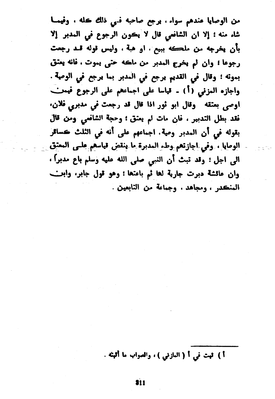 مِنَ الْوَصَايَا عِنْدَهُمْ سَوَاءٌ يَرْجِعُ صَاحِبُهُ فِي ذَلِكَ كُلِّهِ وَفِيمَا شَاءَ مِنْهُ إِلَّا أَنَّ الشَّافِعِيَّ قَالَ لَا يَكُونُ الرُّجُوعُ فِي الْمُدَبَّرِ إِلَّا بِأَنْ يُخْرِجَهُ مِنْ مِلْكِهِ بِبَيْعٍ أَوْ هِبَةٍ وَلَيْسَ قَوْلُهُ قَدْ رَجَعْتُ رُجُوعًا وَإِنْ لَمْ يُخْرِجِ الْمُدَبَّرُ مِنْ مِلْكِهِ حَتَّى يَمُوتَ فَإِنَّهُ يَعْتِقُ بِمَوْتِهِ وَقَالَ فِي الْقَدِيمِ يَرْجِعُ فِي الْمُدَبَّرِ بِمَا يَرْجِعُ فِي الْوَصِيَّةِ وَأَجَازَهُ الْمُزَنِيُّ قِيَاسًا عَلَى إِجْمَاعِهِمْ عَلَى الرُّجُوعِ فِيمَنْ أَوْصَى بِعِتْقِهِ وَقَالَ أَبُو ثَوْرٍ إِذَا قَالَ قَدْ رَجَعْتُ فِي مُدَبَّرِي فُلَانٍ فَقَدْ بَطَلَ التدبير فَإِنْ مَاتَ لَمْ يَعْتِقْ وَحُجَّةُ الشَّافِعِيِّ وَمَنْ قَالَ بِقَوْلِهِ فِي أَنَّ الْمُدَبَّرَ وَصِيَّةً إِجْمَاعُهُمْ عَلَى أَنَّهُ فِي الثُّلُثِ كَسَائِرِ الْوَصَايَا وَفِي إِجَازَتِهِمْ وَطْءَ الْمُدَبَّرَةِ مَا يَنْقُضُ قِيَاسَهَمْ عَلَى الْمُعْتَقِ إِلَى أَجَلٍ وَقَدْ ثَبَتَ أَنَّ النَّبِيَّ صَلَّى اللَّهُ عَلَيْهِ وَسَلَّمَ بَاعَ مُدَبَّرًا وَأَنَّ عَائِشَةَ دَبَّرَتْ جَارِيَةً لَهَا ثُمْ بَاعَتْهَا وَهُوَ قَوْلُ جَابِرٍ وَابْنِ الْمُنْكَدِرِ وَمُجَاهِدٍ وَجَمَاعَةٍ مِنَ التابعين