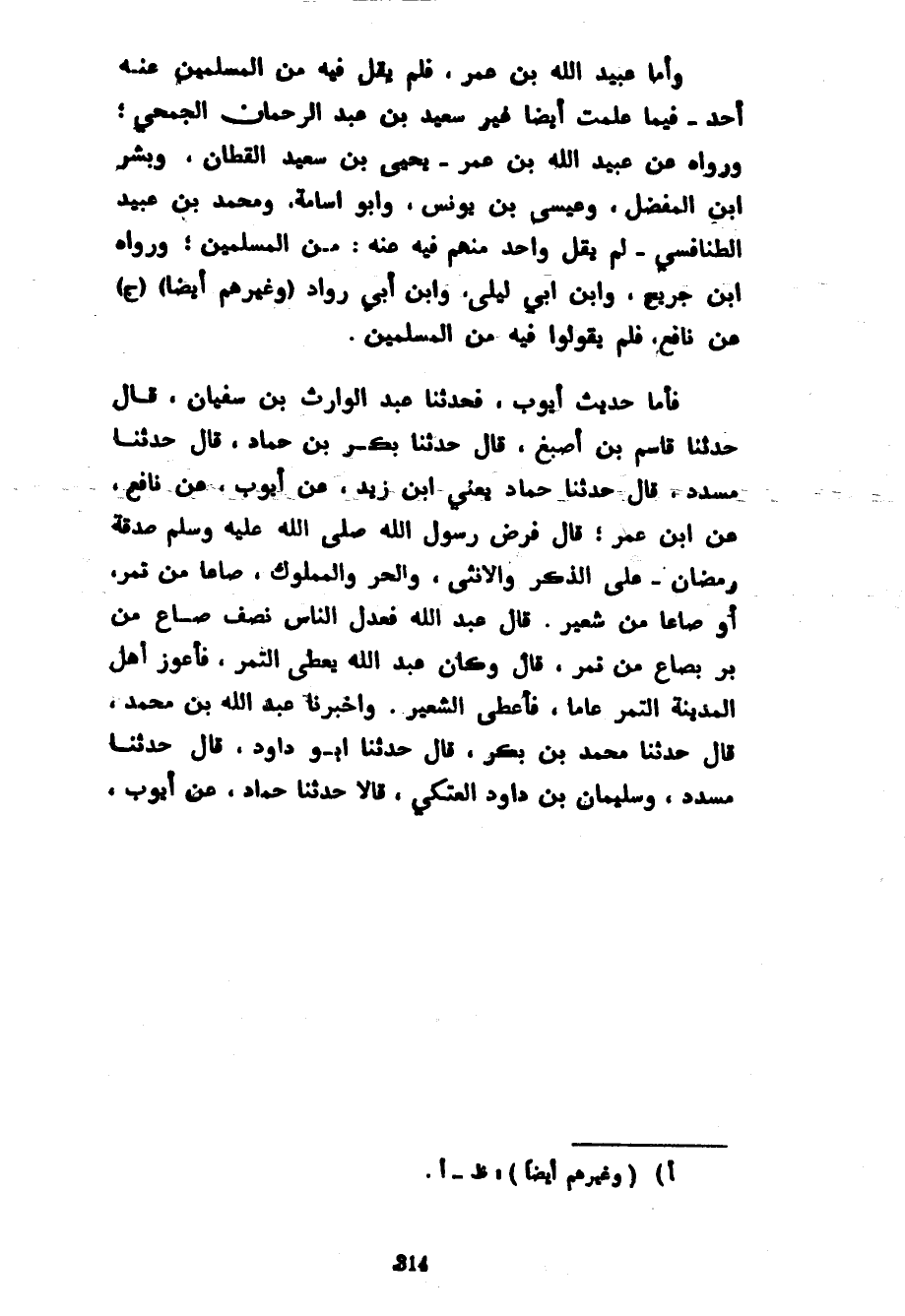 وَأَمَّا عُبَيْدُ اللَّهِ بْنُ عُمَرَ فَلَمْ يَقُلْ فِيهِ مِنَ الْمُسْلِمِينَ عَنْهُ أَحَدٌ فِيمَا عَلِمْتُ أيضا غير سعيد بن عبد الرحمان الْجُمَحِيِّ وَرَوَاهُ عَنْ عُبَيْدِ اللَّهِ بْنِ عُمَرَ يَحْيَى بْنُ سَعِيدٍ الْقَطَّانُ وَبِشْرُ بْنُ الْمُفَضَّلِ وَعِيسَى بْنُ يُونُسَ وَأَبُو أُسَامَةَ وَمُحَمَّدُ بْنُ عُبَيْدٍ الطَّنَافِسِيُّ لَمْ يَقُلْ وَاحِدٌ مِنْهُمْ فِيهِ عَنْهُ مِنَ الْمُسْلِمِينَ وَرَوَاهُ ابْنُ جُرَيْجٍ وَابْنُ أَبِي لَيْلَى وَابْنُ أَبِي رَوَّادٍ (وَغَيْرُهُمْ أَيْضًا) (ج) عَنْ نَافِعٍ فَلَمْ يَقُولُوا فِيهِ مِنَ الْمُسْلِمِينَ فَأَمَّا حَدِيثُ أَيُّوبَ فَحَدَّثَنَا عَبْدُ الْوَارِثِ بْنُ سُفْيَانَ قَالَ حَدَّثَنَا قَاسِمُ بْنُ أَصْبَغَ قَالَ حَدَّثَنَا بَكْرُ بْنُ حَمَّادٍ قَالَ حَدَّثَنَا مُسَدَّدٌ قَالَ حَدَّثَنَا حَمَّادُ يَعْنِي ابْنَ زَيْدٍ عَنْ أَيُّوبَ عَنْ نَافِعٍ عَنِ ابْنِ عُمَرَ قَالَ فَرَضَ رَسُولُ اللَّهِ صَلَّى اللَّهُ عَلَيْهِ وَسَلَّمَ صَدَقَةَ رَمَضَانَ عَلَى الذَّكَرِ وَالْأُنْثَى وَالْحُرِّ وَالْمَمْلُوكِ صَاعًا مِنْ تَمْرٍ أَوْ صَاعًا مِنْ شَعِيرٍ قَالَ عَبْدُ اللَّهِ فَعَدَلَ النَّاسُ نِصْفَ صَاعٍ مَنْ بُرٍّ بِصَاعٍ مَنْ تَمْرٍ قَالَ وَكَانَ عَبْدُ اللَّهِ يُعْطِي التَّمْرَ فَأَعْوَزَ أَهْلَ الْمَدِينَةِ التَّمْرُ عَامًا فَأَعْطَى الشَّعِيرَ وَأَخْبَرَنَا عَبْدُ اللَّهِ بْنُ مُحَمَّدٍ قَالَ حَدَّثَنَا مُحَمَّدُ بْنُ بَكْرٍ قَالَ حَدَّثَنَا أَبُو دَاوُدَ قَالَ حدثنا مسدد وَسُلَيْمَانُ بْنُ دَاوُدَ الْعَتَكِيُّ قَالَا حَدَّثَنَا حَمَّادٌ عَنْ أَيُّوبَ