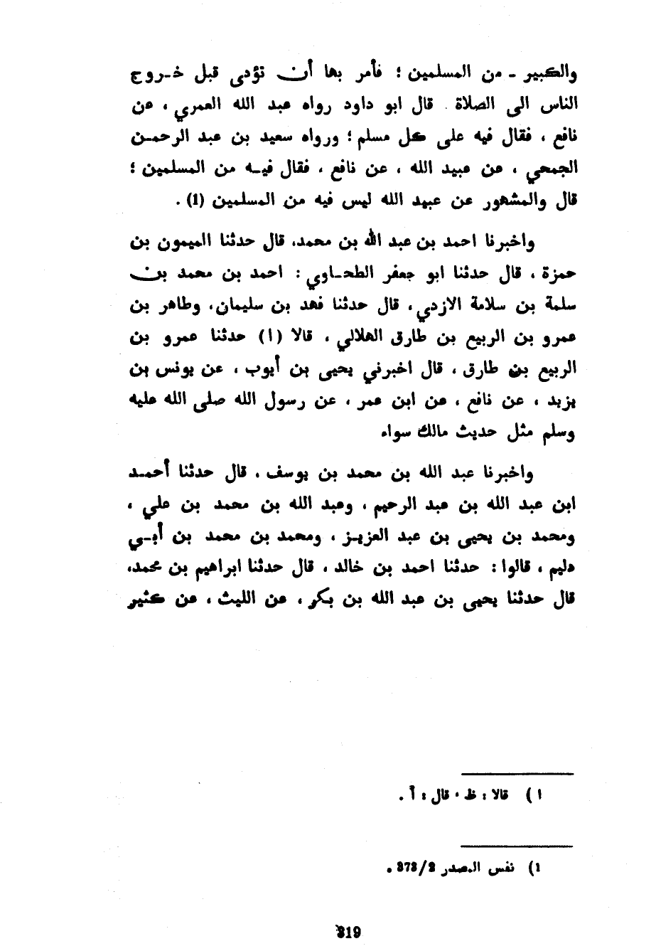 وَالْكَبِيرِ مِنَ الْمُسْلِمِينَ فَأَمَرَ بِهَا أَنْ تُؤَدَّى قَبْلَ خُرُوجِ النَّاسِ إِلَى الصَّلَاةِ قَالَ أَبُو دَاوُدَ رَوَاهُ عَبْدُ اللَّهِ الْعُمَرِيُّ عَنْ نَافِعٍ فَقَالَ فِيهِ عَلَى كُلِّ مُسْلِمٍ وَرَوَاهُ سَعِيدُ بن عبد الرحمن الجمحي عن عبيد الله عَنْ نَافِعٍ فَقَالَ فِيهِ مِنَ الْمُسْلِمِينَ قَالَ وَالْمَشْهُورُ عَنْ عُبَيْدِ اللَّهِ لَيْسَ فِيهِ مِنَ الْمُسْلِمِينَ وَأَخْبَرَنَا أَحْمَدُ بْنُ عَبْدِ اللَّهِ بْنِ مُحَمَّدِ قَالَ حَدَّثَنَا الْمَيْمُونُ بْنُ حَمْزَةَ قَالَ حَدَّثَنَا أَبُو جَعْفَرٍ الطَّحَاوِيُّ أَحْمَدُ بْنُ مُحَمَّدِ بْنِ سَلَمَةَ بْنِ سَلَامَةَ الْأَزْدِيُّ قَالَ حَدَّثَنَا فَهْدُ بْنُ سُلَيْمَانَ وَطَاهِرُ بْنُ عَمْرِو بْنِ الرَّبِيعِ بْنِ طَارِقٍ الْهِلَالِيُّ قَالَا حَدَّثَنَا عَمْرُو بْنُ الرَّبِيعِ بْنِ طَارِقٍ قَالَ أَخْبَرَنِي يَحْيَى بْنُ أَيُّوبَ عَنْ يُونُسَ بْنِ يَزِيدَ عَنْ نَافِعٍ عَنِ ابْنِ عُمَرَ عَنْ رَسُولِ اللَّهِ صَلَّى اللَّهُ عَلَيْهِ وَسَلَّمَ مِثْلَ حَدِيثِ مَالِكٍ سَوَاءً وَأَخْبَرَنَا عَبْدُ اللَّهِ بْنُ مُحَمَّدِ بْنِ يُوسُفَ قَالَ حَدَّثَنَا أَحْمَدُ بْنُ عَبْدِ اللَّهِ بْنِ عَبْدِ الرَّحِيمِ وَعَبْدُ اللَّهِ بْنُ مُحَمَّدِ بْنِ عَلِيٍّ وَمُحَمَّدُ بْنُ يَحْيَى بْنِ عَبْدِ الْعَزِيزِ وَمُحَمَّدُ بْنُ مُحَمَّدِ بْنِ أَبِي دُلَيْمٍ قَالُوا حَدَّثَنَا أَحْمَدُ بْنُ خَالِدٍ قَالَ حَدَّثَنَا إِبْرَاهِيمُ بْنُ مُحَمَّدٍ قَالَ حَدَّثَنَا يَحْيَى بْنُ عَبْدِ اللَّهِ بْنِ بَكْرٍ عَنِ اللَّيْثِ عَنْ كثير