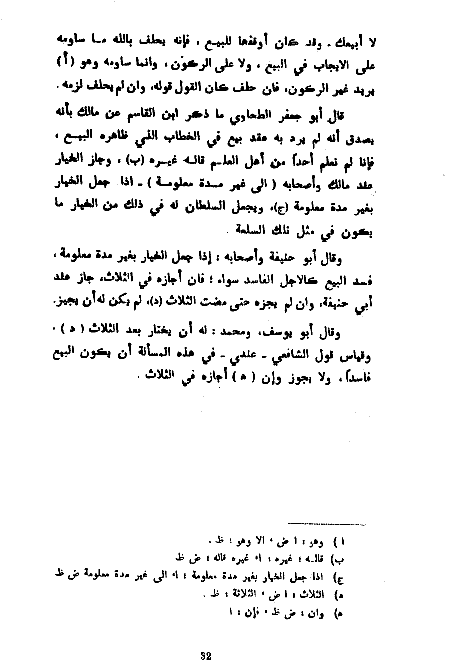 لَا أَبِيعُكَ وَقَدْ كَانَ أَوْقَفَهَا لِلْبَيْعِ فَإِنَّهُ يَحْلِفُ بِاللَّهِ مَا سَاوَمَهُ عَلَى الْإِيجَابِ فِي الْبَيْعِ وَلَا عَلَى الرُّكُونِ وَإِنَّمَا سَاوَمَهُ وَهُوَ يُرِيدُ غَيْرَ الرُّكُونِ فَإِنْ حَلَفَ كَانَ الْقَوْلُ قَوْلَهُ وَإِنْ لَمْ يَحْلِفْ لَزِمَهُ قَالَ أَبُو جَعْفَرٍ الطَّحَاوِيُّ مَا ذَكَرَ ابْنُ الْقَاسِمِ عَنْ مَالِكٍ بِأَنَّهُ يَصْدُقُ أَنَّهُ لَمْ يُرِدْ بِهِ عَقْدَ بَيْعٍ فِي الْخِطَابِ الَّذِي ظَاهِرُهُ الْبَيْعُ فإنا لَمْ نَعْلَمْ أَحَدًا مِنْ أَهْلِ الْعِلْمِ قَالَهُ غَيْرُهُ وَجَازَ الْخِيَارُ عِنْدَ مَالِكٍ وَأَصْحَابِهِ (إِلَى غَيْرِ مُدَّةٍ مَعْلُومَةٍ) إِذَا جَعَلَ الْخِيَارَ بِغَيْرِ مُدَّةٍ مَعْلُومَةٍ وَيَجْعَلُ السُّلْطَانُ لَهُ فِي ذَلِكَ مِنِ الْخِيَارِ مَا يَكُونُ فِي مِثْلِ تِلْكَ السِّلْعَةِ وَقَالَ أَبُو حَنِيفَةَ وَأَصْحَابُهُ إِذَا جُعِلَ الْخِيَارُ بِغَيْرِ مُدَّةٍ مَعْلُومَةٍ فَسَدَ الْبَيْعُ كَالْأَجَلِ الْفَاسِدِ سَوَاءً فَإِنْ أَجَازَهُ فِي الثَّلَاثِ جَازَ عِنْدَ أَبِي حَنِيفَةَ وَإِنْ لَمْ يُجِزْهُ حَتَّى مَضَتِ الثَّلَاثُ لَمْ يَكُنْ لَهُ أَنْ يُجِيزَ وقال أبو يوسف ومحمد له أن يختار بَعْدَ الثَّلَاثِ وَقِيَاسُ قَوْلِ الشَّافِعِيِّ عِنْدِي فِي هَذِهِ الْمَسْأَلَةِ أَنْ يَكُونَ الْبَيْعُ فَاسِدًا وَلَا يجوز وإن (هـ) أجازه في الثلاث