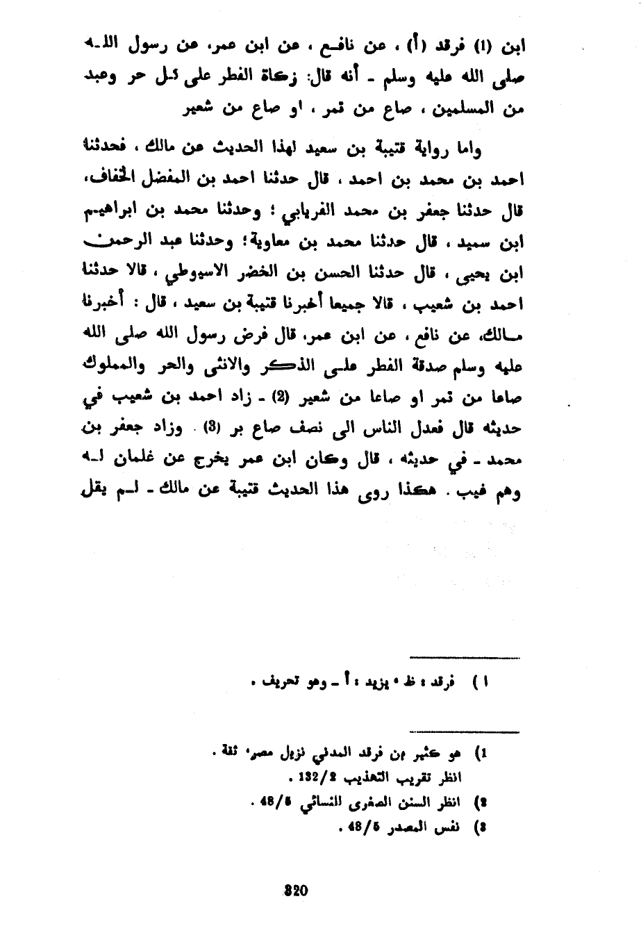 ابن فَرْقَدٍ عَنْ نَافِعٍ عَنِ ابْنِ عُمَرَ عَنْ رَسُولِ اللَّهِ صَلَّى اللَّهُ عَلَيْهِ وَسَلَّمَ أَنَّهُ قَالَ زَكَاةُ الْفِطْرِ عَلَى كُلِّ حُرٍّ وَعَبْدٍ مِنَ الْمُسْلِمِينَ صَاعٌ مِنْ تَمْرٍ أَوْ صَاعٌ مِنْ شَعِيرٍ وَأَمَّا رِوَايَةُ قُتَيْبَةَ بْنِ سَعِيدٍ لِهَذَا الْحَدِيثِ عَنْ مَالِكٍ فَحَدَّثَنَا أَحْمَدُ بْنُ مُحَمَّدِ بْنِ أَحْمَدَ قَالَ حَدَّثَنَا أَحْمَدُ بْنُ الْمُفَضَّلِ الْخَفَّافُ قَالَ حَدَّثَنَا جَعْفَرُ بْنُ مُحَمَّدٍ الْفِرْيَابِيُّ وَحَدَّثَنَا مُحَمَّدُ بْنُ إِبْرَاهِيمَ بْنِ سُمَيْدٍ قَالَ حَدَّثَنَا مُحَمَّدُ بْنُ مُعَاوِيَةَ وَحَدَّثَنَا عَبْدُ الرَّحْمَنِ بْنُ يَحْيَى قَالَ حَدَّثَنَا الْحَسَنُ بْنُ الْخَضِرِ الْأَسْيُوطِيُّ قَالَا حَدَّثَنَا أَحْمَدُ بْنُ شُعَيْبٍ قَالَا جَمِيعًا أَخْبَرَنَا قُتَيْبَةَ بْنُ سَعِيدٍ قَالَ أَخْبَرَنَا مَالِكٌ عَنْ نَافِعٍ عَنِ ابْنِ عُمَرَ قَالَ فَرَضَ رَسُولُ اللَّهِ صَلَّى اللَّهُ عَلَيْهِ وَسَلَّمَ صَدَقَةَ الْفِطْرِ عَلَى الذَّكَرِ وَالْأُنْثَى وَالْحُرِّ وَالْمَمْلُوكِ صَاعًا مِنْ تَمْرٍ أَوْ صَاعًا مِنْ شَعِيرٍ زَادَ أَحْمَدُ بْنُ شُعَيْبٍ فِي حَدِيثِهِ قَالَ فَعَدَلَ النَّاسُ إِلَى نِصْفِ صَاعٍ بُرٍّ وَزَادَ جَعْفَرُ بْنُ مُحَمَّدٍ فِي حَدِيثِهِ قَالَ وَكَانَ ابْنُ عُمَرَ يُخْرِجُ عَنْ غِلْمَانٍ لَهُ وَهُمْ غُيَّبٌ هَكَذَا رَوَى هَذَا الْحَدِيثَ قُتَيْبَةُ عَنْ مَالِكٍ لَمْ يَقُلْ