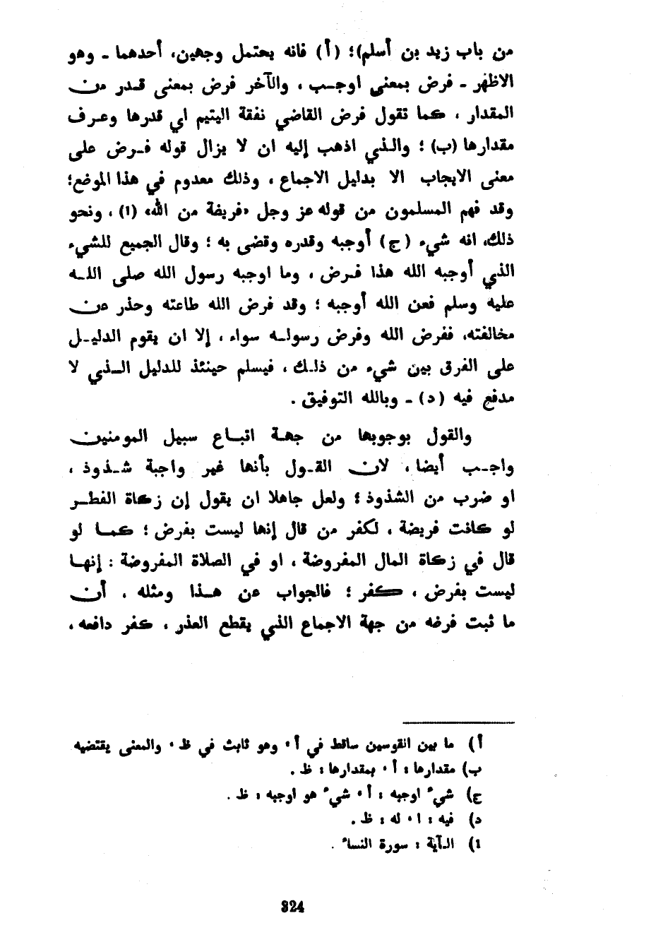 مِنْ بَابِ زَيْدِ بْنِ أَسْلَمَ) فَإِنَّهُ يَحْتَمِلُ وَجْهَيْنِ أَحَدُهُمَا وَهُوَ الْأَظْهَرُ فَرَضَ بِمَعْنَى أَوْجَبَ وَالْآخَرُ فَرَضَ بِمَعْنَى قَدَّرَ مِنَ الْمِقْدَارِ كَمَا تَقُولُ فَرَضَ الْقَاضِي نَفَقَةَ الْيَتِيمِ أَيْ قَدْرَهَا وَعَرَّفَ مِقْدَارَهَا وَالَّذِي أَذْهَبُ إِلَيْهِ أَنْ لَا يَزَالَ قَوْلُهُ فَرَضَ عَلَى مَعْنَى الْإِيجَابِ إِلَّا بِدَلِيلِ الْإِجْمَاعِ وَذَلِكَ مَعْدُومٌ فِي هَذَا الْمَوْضِعِ وَقَدْ فَهِمَ الْمُسْلِمُونَ مِنْ قَوْلِهِ عَزَّ وَجَلَّ فَرِيضَةً مِنَ اللَّهِ وَنَحْوِ ذَلِكَ أَنَّهُ شَيْءٌ أَوْجَبَهُ وَقَدَّرَهُ وَقَضَى بِهِ وَقَالَ الْجَمِيعُ لِلشَّيْءِ الَّذِي أَوْجَبَهُ اللَّهُ هَذَا فَرْضٌ وَمَا أَوْجَبَهُ رَسُولُ اللَّهِ صَلَّى اللَّهُ عَلَيْهِ وَسَلَّمَ فَعَنِ اللَّهِ أَوْجَبَهُ وَقَدْ فَرَضَ اللَّهُ طَاعَتَهُ وَحَذَّرَ عَنْ مُخَالَفَتِهِ فَفَرْضُ اللَّهِ وَفَرْضُ رَسُولِهِ سَوَاءٌ إِلَّا أَنْ يَقُومَ الدَّلِيلُ عَلَى الْفَرْقِ بَيْنَ شَيْءٍ مِنْ ذَلِكَ فَيُسَلَّمُ حِينَئِذٍ لِلدَّلِيلِ الَّذِي لَا مَدْفَعَ فِيهِ وَبِاللَّهِ التَّوْفِيقُ وَالْقَوْلُ بِوُجُوبِهَا مِنْ جِهَةِ اتِّبَاعِ سَبِيلِ الْمُؤْمِنِينَ وَاجِبٌ أَيْضًا لِأَنَّ الْقَوْلَ بِأَنَّهَا غَيْرُ وَاجِبَةٍ شُذُوذٌ أَوْ ضَرْبٌ مِنَ الشُّذُوذِ وَلَعَلَّ جَاهِلًا أَنْ يَقُولَ إِنَّ زَكَاةَ الْفِطْرِ لَوْ كَانَتْ فَرِيضَةً لَكَفَرَ مَنْ قَالَ إِنَّهَا لَيْسَتْ بِفَرْضٍ كَمَا لَوْ قَالَ فِي زَكَاةِ الْمَالِ الْمَفْرُوضَةِ أَوْ فِي الصَّلَاةِ الْمَفْرُوضَةِ إِنَّهَا لَيْسَتْ بِفَرْضِ كُفْرٍ فَالْجَوَابُ عَنْ هَذَا وَمِثْلِهِ أَنَّ مَا ثَبَتَ فَرْضُهُ من جهة الإجماع الذي يقطع العذر كفر دافعه