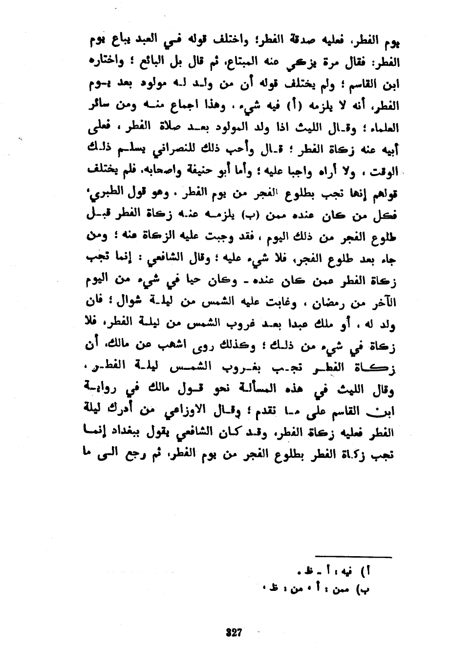 يَوْمَ الْفِطْرِ فَعَلَيْهِ صَدَقَةُ الْفِطْرِ وَاخْتَلَفَ قَوْلُهُ فِي الْعَبْدِ يُبَاعُ يَوْمَ الْفِطْرِ فَقَالَ مَرَّةً يُزَكِّي عَنْهُ الْمُبْتَاعُ ثُمَّ قَالَ بَلِ الْبَائِعُ وَاخْتَارَهُ ابْنُ الْقَاسِمِ وَلَمْ يَخْتَلِفْ قَوْلُهُ أَنَّ مَنْ وُلِدَ لَهُ مَوْلُودٌ بَعْدَ يَوْمِ الْفِطْرِ أَنَّهُ لَا يَلْزَمُهُ فِيهِ شَيْءٌ وَهَذَا إِجْمَاعٌ مِنْهُ وَمِنْ سَائِرِ الْعُلَمَاءِ وَقَالَ اللَّيْثُ إِذَا ولد المولود بعد صلاةالفطر فَعَلَى أَبِيهِ عَنْهُ زَكَاةَ الْفِطْرِ قَالَ وَأُحِبُّ ذلك للنصراني يسلم ذلك الوقت ولا أراه وَاجِبًا عَلَيْهِ وَأَمَّا أَبُو حَنِيفَةَ وَأَصْحَابُهُ فَلَمْ يَخْتَلِفْ قَوْلُهُمْ إِنَّهَا تَجِبُ بِطُلُوعِ الْفَجْرِ مِنْ يَوْمِ الْفِطْرِ وَهُوَ قَوْلُ الطَّبَرِيِّ فَكُلُّ مَنْ كَانَ عِنْدَهُ مِمَّنْ يَلْزَمُهُ عَنْهُ زَكَاةُ الْفِطْرِ قَبْلَ طُلُوعِ الْفَجْرِ مِنْ ذَلِكَ الْيَوْمِ فَقَدْ وَجَبَتْ عَلَيْهِ الزَّكَاةُ عَنْهُ وَمَنْ جَاءَ بَعْدَ طُلُوعِ الْفَجْرِ فَلَا شَيْءَ عَلَيْهِ وَقَالَ الشَّافِعِيُّ إِنَّمَا تَجِبُ زَكَاةُ الْفِطْرِ عَمَّنْ كَانَ عِنْدَهُ وَكَانَ حَيًّا فِي شَيْءٍ مِنَ الْيَوْمِ الْآخِرِ مِنْ رَمَضَانَ وَغَابَتْ عَلَيْهِ الشَّمْسُ مِنْ لَيْلَةِ شَوَّالٍ فَإِنْ وُلِدَ لَهُ أَوْ مَلَكَ عَبْدًا بَعْدَ غُرُوبِ الشَّمْسِ مِنْ لَيْلَةِ الْفِطْرِ فَلَا زَكَاةَ فِي شَيْءٍ مِنْ ذَلِكَ وَكَذَلِكَ رَوَى أَشْهَبُ عَنْ مَالِكٍ أَنَّ زَكَاةَ الْفِطْرِ تَجِبُ بِغُرُوبِ الشَّمْسِ لَيْلَةَ الْفِطْرِ وَقَالَ اللَّيْثُ فِي هَذِهِ الْمَسْأَلَةِ نَحْوَ قَوْلِ مَالِكٍ فِي رِوَايَةِ ابْنِ الْقَاسِمِ عَلَى مَا تَقَدَّمَ وَقَالَ الْأَوْزَاعِيُّ مَنْ أَدْرَكَ لَيْلَةَ الْفِطْرِ فَعَلَيْهِ زَكَاةُ الْفِطْرِ وَقَدْ كَانَ الشَّافِعِيُّ يَقُولُ بِبَغْدَادَ إِنَّمَا تَجِبُ زَكَاةُ الْفِطْرِ بِطُلُوعِ الْفَجْرِ مِنْ يَوْمِ الْفِطْرِ ثُمَّ رَجَعَ إِلَى مَا