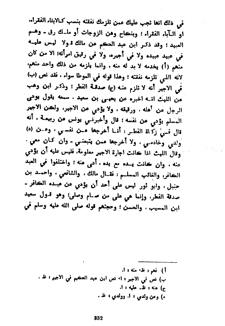 فِي ذَلِكَ أَنَّهَا تَجِبُ عَلَيْكَ عَمَّنْ تَلْزَمُكَ نَفَقَتُهُ بِنَسَبٍ كَالْأَبْنَاءِ الْفُقَرَاءِ أَوِ الْآبَاءِ الْفُقَرَاءِ وَبِنِكَاحٍ وَهُنَّ الزَّوْجَاتُ أَوْ مِلْكِ رَقٍّ وَهُمُ الْعَبِيدُ وَقَدْ ذَكَرَ ابْنُ عَبْدِ الْحَكَمِ عَنْ مَالِكٍ قَوْلًا لَيْسَ عَلَيْهِ فِي عَبِيدِ عَبِيدِهِ وَلَا فِي أَجِيرِهِ وَلَا فِي رَقِيقِ امْرَأَتِهِ إِلَّا مَنْ كَانَ مِنْهُمْ يَخْدِمُهُ لَا بُدَّ لَهُ مِنْهُ وَإِنَّمَا يَلْزَمُهُ مِنْ ذَلِكَ وَاحِدٌ مِنْهُمْ لِأَنَّهُ الَّذِي تَلْزَمُهُ نَفَقَتُهُ وَهَذَا قَوْلُهُ فِي الْمُوَطَّأِ سَوَاءٌ فَقَدْ نَصَّ فِي الْأَجِيرِ أَنَّهُ لَا تَلْزَمُ عَنْهُ صَدَقَةُ الْفِطْرِ وَذَكَرَ ابْنُ وَهْبٍ عَنِ اللَّيْثِ أَنَّهُ أَخْبَرَهُ عَنْ يَحْيَى بْنِ سَعِيدٍ سَمِعَهُ يَقُولُ يُؤَدِّي الرَّجُلُ عَنْ أَهْلِهِ وَرَقِيقِهِ وَلَا يُؤَدِّي عَنِ الْأَجِيرِ وَلَكِنَّ الْأَجِيرَ الْمُسْلِمَ يُؤَدِّي عَنْ نَفْسِهِ قَالَ وَأَخْبَرَنِي يُونُسُ عَنْ رَبِيعَةَ أَنَّهُ قَالَ فِي زَكَاةِ الْفِطْرِ أَنَا أُخْرِجُهَا عَنْ نَفْسِي وَعَنْ وَلَدِي وَخَادِمِي وَلَا أُخْرِجُهَا عَمَّنْ يَتْبَعُنِي وَإِنْ كَانَ مَعِي وَقَالَ اللَّيْثُ إِذَا كَانَتْ إِجَارَةُ الْأَجِيرِ مَعْلُومَةً فَلَيْسَ عَلَيْهِ أَنْ يُؤَدِّيَ عَنْهُ وَإِنْ كَانَتْ يَدَهُ مَعَ يَدَيْهِ أَدَّى عَنْهُ وَاخْتَلَفُوا فِي الْعَبْدِ الْكَافِرِ وَالْغَائِبِ الْمُسْلِمِ فَقَالَ مَالِكٌ وَالشَّافِعِيُّ وَأَحْمَدُ بْنُ حَنْبَلٍ وَأَبُو ثَوْرٍ لَيْسَ عَلَى أَحَدٍ أَنْ يُؤَدِّيَ عَنْ عَبْدِهِ الْكَافِرِ صَدَقَةَ الْفِطْرِ وَإِنَّمَا هِيَ عَلَى مَنْ صَامَ وَصَلَّى وَهُوَ قَوْلُ سَعِيدِ بْنِ الْمُسَيَّبِ وَالْحَسَنِ وَحُجَّتُهُمْ قَوْلُهُ صَلَّى اللَّهُ عَلَيْهِ وَسَلَّمَ فِي