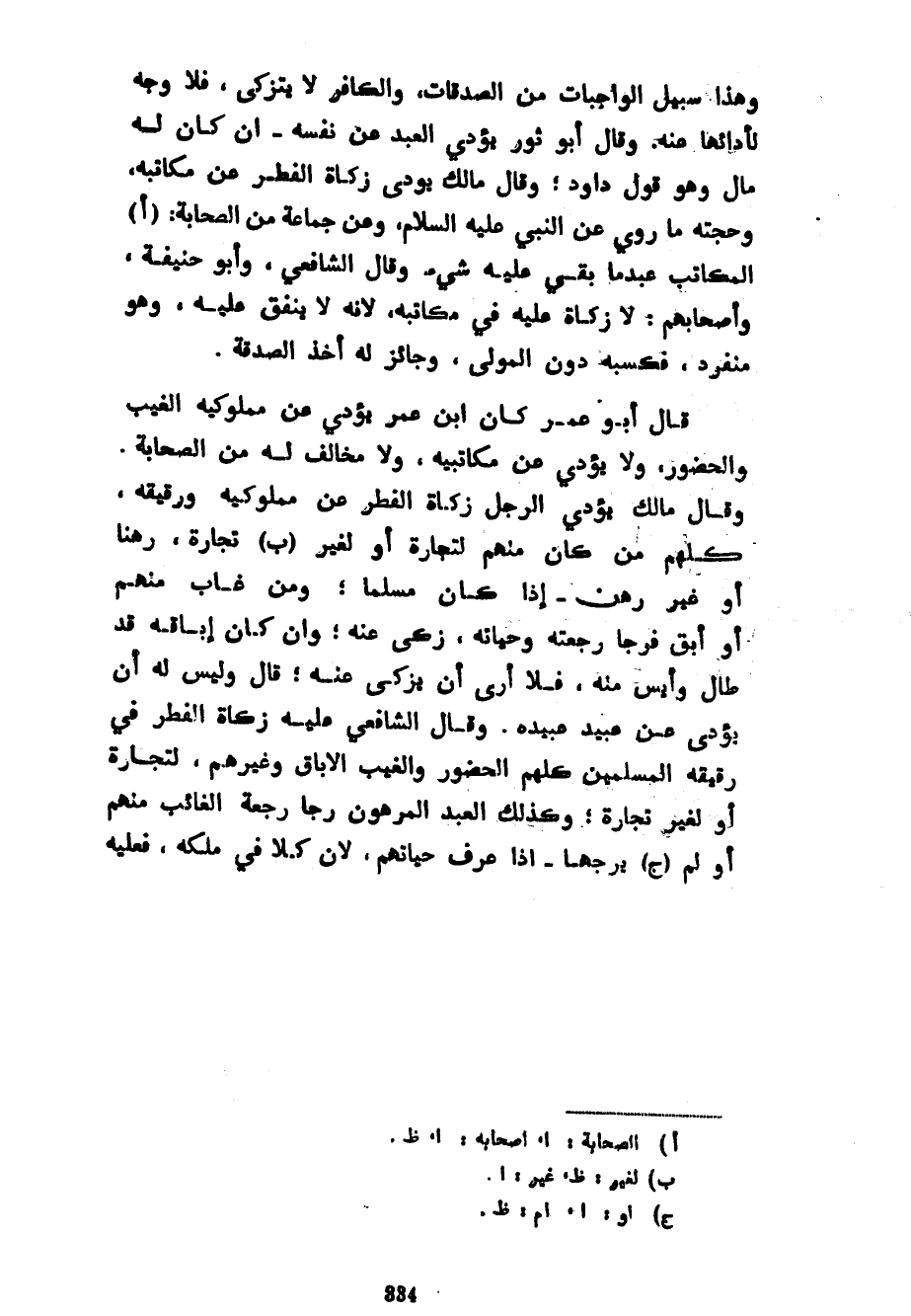 وَهَذَا سَبِيلُ الْوَاجِبَاتِ مِنَ الصَّدَقَاتِ وَالْكَافِرُ لَا يَتَزَكَّى فَلَا وَجْهَ لِأَدَائِهَا عَنْهُ وَقَالَ أَبُو ثَوْرٍ يُؤَدِّي الْعَبْدُ عَنْ نَفْسِهِ إِنْ كَانَ لَهُ مَالَ وَهُوَ قَوْلُ دَاوُدَ وَقَالَ مَالِكٌ يُؤَدِّي زَكَاةَ الْفِطْرِ عَنْ مُكَاتَبِهِ وَحُجَّتُهُ مَا رُوِيَ عَنِ النَّبِيِّ عَلَيْهِ السَّلَامُ وَعَنْ جَمَاعَةٍ مِنَ الصَّحَابَةِ الْمُكَاتَبُ عَبْدٌ مَا بَقِيَ عَلَيْهِ شَيْءٌ وَقَالَ الشَّافِعِيُّ وَأَبُو حَنِيفَةَ وَأَصْحَابُهُمْ لَا زَكَاةَ عَلَيْهِ فِي مُكَاتَبِهِ لِأَنَّهُ لَا يُنْفِقُ عَلَيْهِ وَهُوَ مُنْفَرِدٌ فَكَسْبُهُ دُونَ الْمَوْلَى وَجَائِزٌ لَهُ أَخْذُ الصَّدَقَةَ قَالَ أَبُو عُمَرَ كَانَ ابْنُ عُمَرَ يُؤَدِّي عَنْ مَمْلُوكِيهِ الْغُيَّبِ وَالْحُضُورِ وَلَا يُؤَدِّي عَنْ مُكَاتَبِيهِ وَلَا مُخَالِفَ لَهُ مِنَ الصَّحَابَةِ وَقَالَ مَالِكٌ يُؤَدِّي الرَّجُلُ زَكَاةَ الْفِطْرِ عَنْ مَمْلُوكِيهِ وَرَقِيقِهِ كُلِّهِمْ مَنْ كَانَ مِنْهُمْ لِتِجَارَةٍ أَوْ لِغَيْرِ تِجَارَةٍ رَهْنًا أَوْ غَيْرَ رَهْنٍ إِذَا كَانَ مُسْلِمًا وَمَنْ غَابَ مِنْهُمْ أَوْ أَبَقَ فَرَجَا رَجْعَتَهُ وَحَيَاتَهُ زَكَّى عَنْهُ وَإِنْ كَانَ إِبَاقُهُ قَدْ طَالَ وَأَيِسَ مِنْهُ فَلَا أَرَى أَنْ يُزَكِّيَ عَنْهُ قَالَ وَلَيْسَ لَهُ أَنْ يُؤَدِّيَ عَنْ عَبِيدِ عَبِيدِهِ وَقَالَ الشَّافِعِيُّ عَلَيْهِ زَكَاةُ الْفِطْرِ فِي رَقِيقِهِ الْمُسْلِمِينَ كُلِّهِمُ الْحُضُورِ وَالْغُيَّبِ الْإِبَاقِ وَغَيْرِهِمْ لِتِجَارَةٍ أَوْ لِغَيْرِ تِجَارَةٍ وَكَذَلِكَ الْعَبْدُ الْمَرْهُونُ رَجَا رَجْعَةَ الْغَائِبِ مِنْهُمْ أَوْ لَمْ يَرْجَهَا إِذَا عَرَفَ حَيَاتَهُمْ لِأَنَّ كُلًّا فِي مِلْكِهِ فَعَلَيْهِ