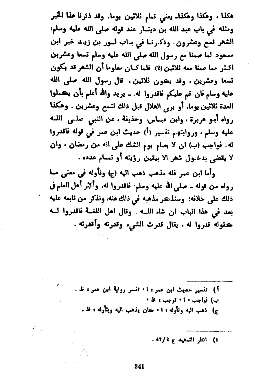هَكَذَا وَهَكَذَا وَهَكَذَا يَعْنِي تَمَامَ ثَلَاثِينَ يَوْمًا وَقَدْ ذَكَرْنَا هَذَا الْخَبَرَ وَمِثْلَهُ فِي بَابِ عَبْدِ اللَّهِ بْنِ دِينَارٍ عِنْدَ قَوْلِهِ صَلَّى اللَّهُ عَلَيْهِ وَسَلَّمَ الشَّهْرُ تِسْعٌ وَعِشْرُونَ وَذَكَرْنَا فِي بَابِ ثَوْرِ بْنِ زَيْدٍ خَبَرَ ابْنِ مَسْعُودٍ لَمَّا صُمْنَا مَعَ رَسُولِ اللَّهِ صَلَّى اللَّهُ عَلَيْهِ وَسَلَّمَ تِسْعًا وَعِشْرِينَ أَكْثَرَ مِمَّا صُمْنَا مَعَهُ ثَلَاثِينَ فَلَمَّا كَانَ مَعْلُومًا أَنَّ الشَّهْرَ قَدْ يَكُونُ تِسْعًا وَعِشْرِينَ وَقَدْ يَكُونُ ثَلَاثِينَ قَالَ رَسُولُ اللَّهِ صَلَّى اللَّهُ عَلَيْهِ وَسَلَّمَ فَإِنْ غُمَّ عَلَيْكُمْ فَاقْدِرُوا لَهُ يُرِيدُ وَاللَّهُ أَعْلَمُ بِأَنْ يُكْمِلُوا الْعِدَّةَ ثَلَاثِينَ يَوْمًا أَوْ يَرَى الْهِلَالَ قَبْلَ ذَلِكَ لِتِسْعٍ وَعِشْرِينَ وَهَكَذَا رَوَاهُ أَبُو هُرَيْرَةَ وَابْنُ عَبَّاسٍ وَحُذَيْفَةُ عَنِ النَّبِيِّ صَلَّى اللَّهُ عَلَيْهِ وَسَلَّمَ وَرِوَايَتُهُمْ تَفْسِيرَ حَدِيثَ ابْنِ عُمَرَ فِي قَوْلِهِ فَاقْدُرُوا لَهُ فَوَاجِبٌ أَنْ لَا يُصَامَ يَوْمُ الشَّكِّ عَلَى أَنَّهُ مِنْ رَمَضَانَ وَأَنْ لَا يُقْضَى بِدُخُولِ شَهْرٍ إِلَّا بِيَقِينِ رُؤْيَتِهِ أَوْ تَمَامِ عَدَدِهِ وَأَمَّا ابْنُ عُمَرَ فَلَهُ مَذْهَبٌ ذَهَبَ إِلَيْهِ وَتَأَوَّلَهُ فِي مَعْنَى مَا رَوَاهُ مِنْ قَوْلِهِ صَلَّى اللَّهُ عَلَيْهِ وَسَلَّمَ فَاقْدِرُوا لَهُ وَأَكْثَرُ أَهْلِ الْعِلْمِ فِي ذَلِكَ عَلَى خِلَافِهِ وَسَنَذْكُرُ مَذْهَبَهُ فِي ذَلِكَ عَنْهُ وَنَذْكُرُ مَنْ تَابَعَهُ عَلَيْهِ بَعْدُ فِي هَذَا الْبَابِ إِنْ شَاءَ اللَّهُ وَقَالَ أَهْلُ اللُّغَةِ فَاقْدِرُوا لَهُ كَقَوْلِهِ قُدِّرُوا لَهُ يُقَالُ قَدَرْتُ الشَّيْءَ وَقَدَّرْتُهُ وأقدرته