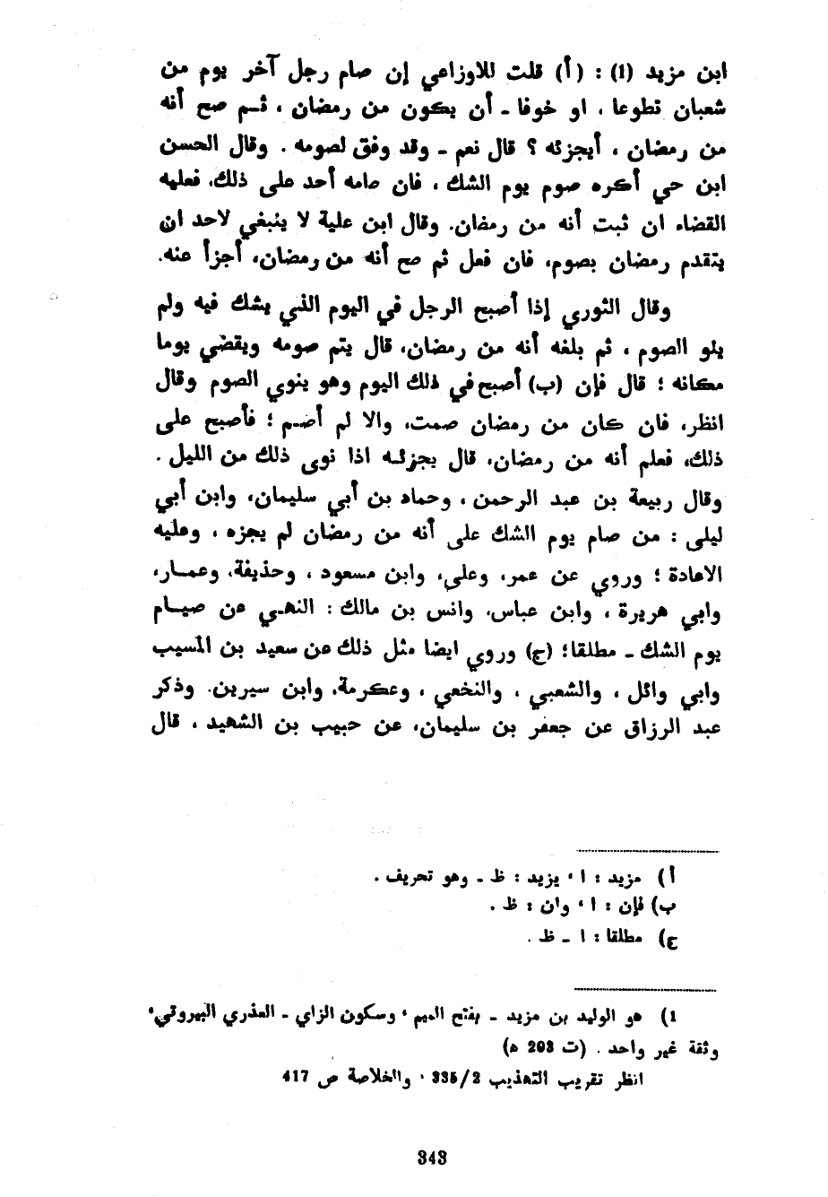 ابن مَزِيدٍ قُلْتُ لِلْأَوْزَاعِيِّ إِنْ صَامَ رَجُلٌ آخِرَ يَوْمٍ مِنْ شَعْبَانَ تَطَوُّعًا أَوْ خَوْفًا أَنْ يَكُونَ مِنْ رَمَضَانَ ثُمَّ صَحَّ أَنَّهُ مِنْ رمضان أجزئه قال نعم وقد وفق لِصَوْمِهِ وَقَالَ الْحَسَنُ بْنُ حَيٍّ أَكْرَهُ صَوْمَ يَوْمِ الشَّكِّ فَإِنْ صَامَهُ أَحَدٌ عَلَى ذَلِكَ فَعَلَيْهِ الْقَضَاءُ إِنْ ثَبَتَ أَنَّهُ مِنْ رَمَضَانَ وَقَالَ ابْنُ عُلَيَّةَ لَا يَنْبَغِي لِأَحَدٍ أَنْ يَتَقَدَّمَ رَمَضَانَ بِصَوْمٍ فَإِنْ فَعَلَ ثُمَّ صَحَّ أَنَّهُ مِنْ رَمَضَانَ أَجْزَأَ عَنْهُ وَقَالَ الثَّوْرِيُّ إِذَا أَصْبَحَ الرَّجُلُ فِي الْيَوْمِ الَّذِي يَشُكُّ فِيهِ وَلَمْ يَنْوِ الصَّوْمَ ثُمَّ بَلَغَهُ أَنَّهُ مِنْ رَمَضَانَ قَالَ يُتِمُّ صَوْمَهُ وَيَقْضِي يَوْمًا مَكَانَهُ قَالَ فَإِنْ أَصْبَحَ فِي ذَلِكَ الْيَوْمِ وَهُوَ يَنْوِي الصَّوْمَ وَقَالَ أَنْظُرُ فَإِنْ كَانَ مِنْ رَمَضَانَ صَمْتُ وَإِلَّا لَمْ أَصُمْ فَأَصْبَحَ على ذلك فعلم أَنَّهُ مِنْ رَمَضَانَ قَالَ يُجْزِئُهُ إِذَا نَوَى ذَلِكَ مِنَ اللَّيْلِ وَقَالَ رَبِيعَةُ بْنُ عَبْدِ الرَّحْمَنِ وَحَمَّادُ بْنُ أَبِي سُلَيْمَانَ وَابْنُ أَبِي لَيْلَى مَنْ صَامَ يَوْمَ الشَّكِّ عَلَى أَنَّهُ مِنْ رَمَضَانَ لَمْ يُجْزِهِ وَعَلَيْهِ الْإِعَادَةُ وَرُوِيَ عَنْ عُمَرَ وَعَلِيٍّ وَابْنِ مَسْعُودٍ وَحُذَيْفَةَ وَعَمَّارٍ وَأَبِي هُرَيْرَةَ وَابْنِ عَبَّاسٍ وَأَنَسِ بْنِ مَالِكٍ النَّهْيُ عَنْ صِيَامِ يَوْمِ الشَّكِّ مُطْلَقًا وَرَوِيُ أَيْضًا مِثْلُ ذَلِكَ عَنْ سَعِيدِ بْنِ الْمُسَيَّبِ وَأَبِي وَائِلٍ وَالشَّعْبِيِّ وَالنَّخَعِيِّ وَعِكْرِمَةَ وَابْنِ سِيرِينَ وَذَكَرَ عَبْدُ الرَّزَّاقِ عَنْ جَعْفَرِ بْنِ سُلَيْمَانَ عَنْ حَبِيبِ بْنِ الشَّهِيدِ قَالَ