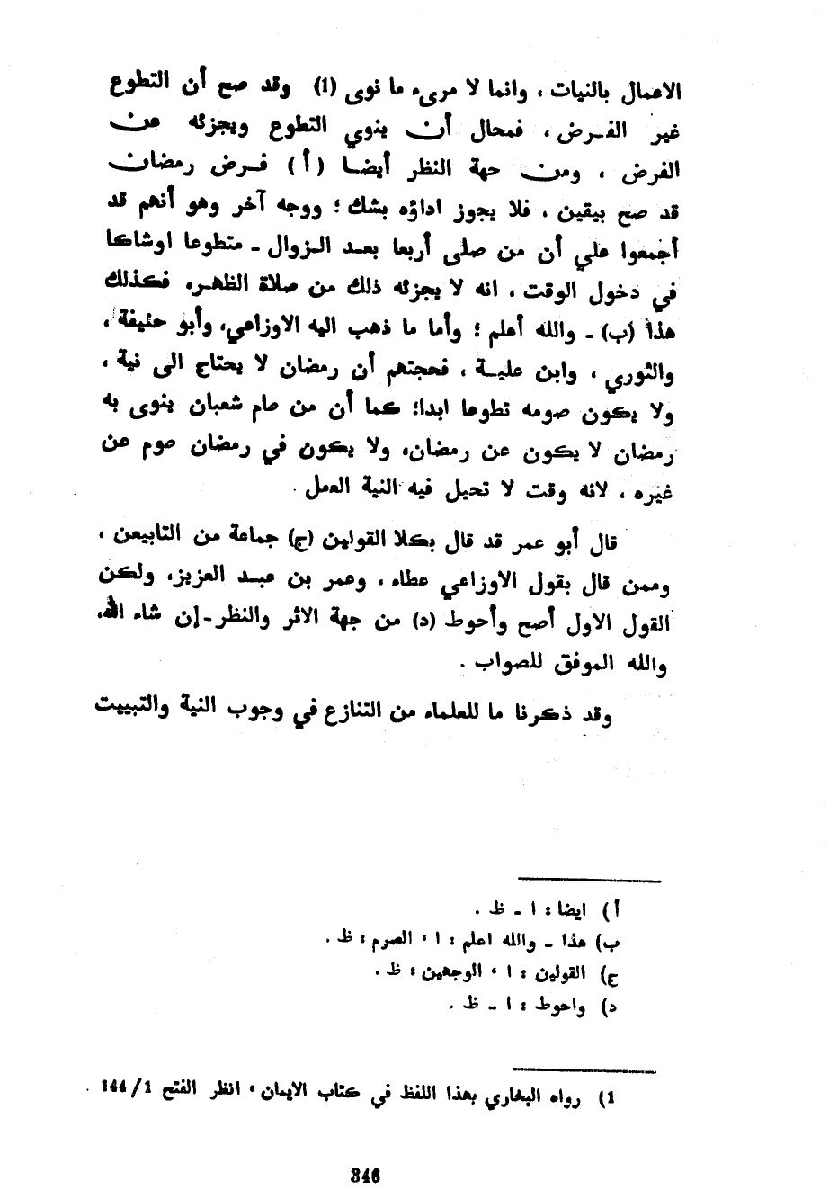 الْأَعْمَالُ بِالنِّيَّاتِ وَإِنَّمَا لِامْرِئٍ مَا نَوَى وَقَدْ صَحَّ أَنَّ التَّطَوُّعَ غَيْرُ الْفَرْضِ فَمُحَالٌ أَنْ يَنْوِيَ التَّطَوُّعَ وَيُجْزِئَهُ عَنِ الْفَرْضِ وَمِنْ جِهَةِ النَّظَرِ أَيْضًا فَرْضُ رَمَضَانَ قَدْ صَحَّ بِيَقِينٍ فَلَا يَجُوزُ أَدَاؤُهُ بِشَكٍّ وَوَجْهٌ آخَرُ وَهُوَ أَنَّهُمْ قَدْ أَجْمَعُوا عَلَى أَنَّ مَنْ صَلَّى أَرْبَعًا بَعْدَ الزَّوَالِ مُتَطَوِّعًا أَوْ شَاكًّا فِي دُخُولِ الْوَقْتِ أَنَّهُ لَا يُجْزِئُهُ ذَلِكَ مِنْ صَلَاةِ الظُّهْرِ فَكَذَلِكَ هَذَا وَاللَّهُ أَعْلَمُ وَأَمَّا مَا ذَهَبَ إِلَيْهِ الْأَوْزَاعِيُّ وَأَبُو حَنِيفَةَ وَالثَّوْرِيُّ وَابْنُ عُلَيَّةَ فَحُجَّتُهُمْ أَنَّ رَمَضَانَ لَا يَحْتَاجُ إِلَى نِيَّةٍ وَلَا يَكُونُ صَوْمُهُ تَطَوُّعًا أَبَدًا كَمَا أَنَّ مَنْ صَامَ شَعْبَانَ يَنْوِي بِهِ رَمَضَانَ لَا يَكُونُ عَنْ رَمَضَانَ وَلَا يَكُونُ فِي رَمَضَانَ صَوْمٌ عَنْ غَيْرِهِ لِأَنَّهُ وَقْتٌ لَا تُحِيلُ فِيهِ النِّيَّةُ الْعَمَلَ قَالَ أَبُو عُمَرَ قَدْ قَالَ بِكِلَا الْقَوْلَيْنِ جَمَاعَةٌ مِنَ التَّابِعِينَ وَمِمَّنْ قَالَ بِقَوْلِ الْأَوْزَاعِيِّ عَطَاءٌ وَعُمَرُ بْنُ عَبْدِ الْعَزِيزِ وَلَكِنَّ الْقَوْلَ الْأَوَّلَ أَصَحُّ وَأَحْوَطُ مِنْ جِهَةِ الْأَثَرِ وَالنَّظَرِ إِنْ شَاءَ اللَّهُ وَاللَّهُ الْمُوَفِّقُ لِلصَّوَابِ وَقَدْ ذَكَرْنَا مَا لِلْعُلَمَاءِ مِنَ التَّنَازُعِ فِي وُجُوبِ النِّيَّةِ وَالتَّبْيِيتِ
