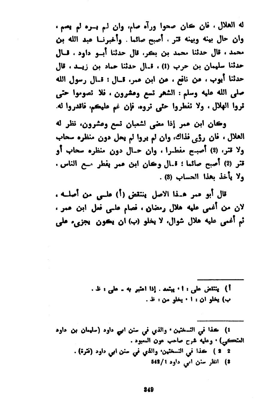 لَهُ الْهِلَالَ فَإِنْ كَانَ صَحْوًا وَرَآهُ صَامَ وَإِنْ لَمْ يَرَهُ لَمْ يَصُمْ وَإِنْ حَالَ بَيْنَهُ وَبَيْنَهُ قَتَرٌ أَصْبَحَ صَائِمًا وَأَخْبَرَنَا عَبْدُ اللَّهِ بْنُ مُحَمَّدٍ قَالَ حَدَّثَنَا مُحَمَّدُ بْنُ بَكْرٍ قَالَ حَدَّثَنَا أَبُو دَاوُدَ قَالَ حَدَّثَنَا سُلَيْمَانُ بْنُ حَرْبٍ قَالَ حَدَّثَنَا حَمَّادُ بْنُ زَيْدٍ قَالَ حَدَّثَنَا أَيُّوبَ عَنْ نَافِعٍ عَنِ ابْنِ عُمَرَ قَالَ قَالَ رَسُولُ اللَّهِ صَلَّى اللَّهُ عَلَيْهِ وَسَلَّمَ الشَّهْرُ تِسْعٌ وَعِشْرُونَ فَلَا تَصُومُوا حَتَّى تَرَوُا الْهِلَالَ وَلَا تُفْطِرُوا حَتَّى تَرَوْهُ فَإِنْ غُمَّ عَلَيْكُمْ فَاقْدِرُوا لَهُ وَكَانَ ابْنُ عُمَرَ إِذَا مَضَى لِشَعْبَانَ تِسْعٌ وَعِشْرُونَ نظر له الهلال فإن رؤي فَذَاكَ وَإِنْ لَمْ يَرَوْا لَمْ يَحُلْ دُونَ مَنْظَرِهِ سَحَابٌ وَلَا قَتَرٌ أَصْبَحَ مُفْطِرًا وَإِنْ حَالَ دُونَ مَنْظَرِهِ سَحَابٌ أَوْ قَتَرٌ أَصْبَحَ صَائِمًا قَالَ وَكَانَ ابْنُ عُمَرَ يُفْطِرُ مَعَ النَّاسِ وَلَا يَأْخُذُ بِهَذَا الْحِسَابِ قَالَ أَبُو عُمَرَ هَذَا الْأَصْلُ يَنْتَقِضُ عَلَى مَنْ أَصَّلُهُ لِأَنَّ مَنْ أُغْمِيَ عَلَيْهِ هِلَالُ رَمَضَانَ فَصَامَ عَلَى فِعْلِ ابْنِ عُمَرَ ثُمَّ أُغْمِيَ عَلَيْهِ هِلَالُ شَوَّالٍ لَا يَخْلُو أَنْ يَكُونَ يُجْزِئُ على