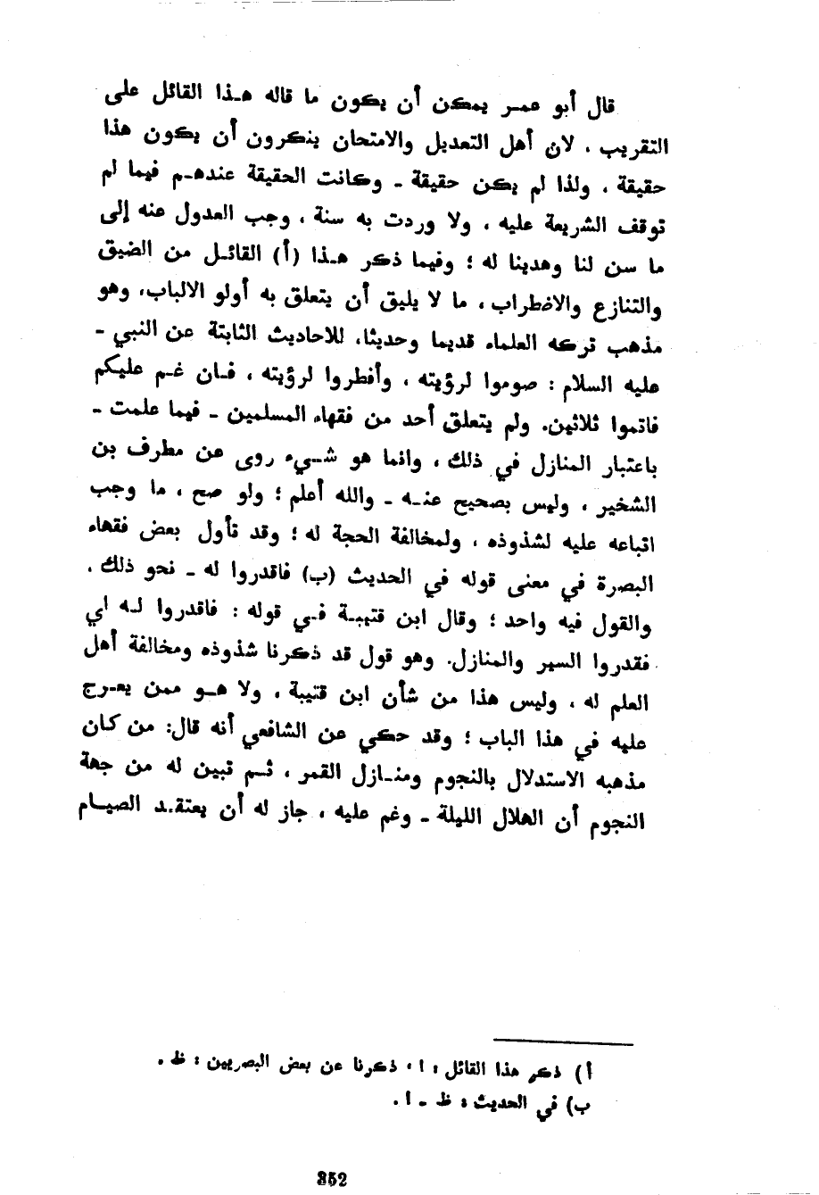 قَالَ أَبُو عُمَرَ يُمْكِنُ أَنْ يَكُونَ مَا قَالَهُ هَذَا الْقَائِلُ عَلَى التَّقْرِيبِ لِأَنَّ أَهْلَ التَّعْدِيلِ وَالِامْتِحَانِ يُنْكِرُونَ أَنْ يَكُونَ هَذَا حَقِيقَةً وَلِذَا لَمْ يَكُنْ حَقِيقَةً وَكَانَتِ الْحَقِيقَةُ عِنْدَهُمْ فِيمَا لَمْ تُوقَفِ الشَّرِيعَةُ عَلَيْهِ وَلَا وَرَدَتْ بِهِ سُنَّةٌ وَجَبَ الْعُدُولُ عَنْهُ إِلَى مَا سُنَّ لَنَا وَهُدِينَا لَهُ وَفِيمَا ذَكَرَ هَذَا الْقَائِلُ مِنَ الضِّيقِ وَالتَّنَازُعِ وَالِاضْطِرَابِ مَا لَا يَلِيقُ أَنْ يَتَعَلَّقَ بِهِ أُولُو الْأَلْبَابِ وَهُوَ مَذْهَبٌ تَرَكَهُ الْعُلَمَاءُ قَدِيمًا وَحَدِيثًا لِلْأَحَادِيثِ الثَّابِتَةِ عَنِ النَّبِيِّ عَلَيْهِ السَّلَامُ صُومُوا لِرُؤْيَتِهِ وَأَفْطِرُوا لِرُؤْيَتِهِ فَإِنْ غُمَّ عَلَيْكُمْ فَأَتِمُّوا ثَلَاثِينَ وَلَمْ يَتَعَلَّقْ أَحَدٌ مِنْ فُقَهَاءِ الْمُسْلِمِينَ فِيمَا عَلِمْتُ بِاعْتِبَارِ الْمَنَازِلِ فِي ذَلِكَ وَإِنَّمَا هُوَ شَيْءٌ رُوِيَ عَنْ مُطَرِّفِ بْنِ الشِّخِّيرِ وَلَيْسَ بِصَحِيحٍ عَنْهُ وَاللَّهُ أَعْلَمُ وَلَوْ صَحَّ مَا وَجَبَ اتِّبَاعُهُ عَلَيْهِ لِشُذُوذِهِ وَلِمُخَالِفَةِ الْحُجَّةِ لَهُ وَقَدْ تَأَوَّلَ بَعْضُ فُقَهَاءِ الْبَصْرَةِ فِي مَعْنَى قَوْلِهِ فِي الْحَدِيثِ فَاقْدِرُوا لَهُ نَحْوَ ذَلِكَ وَالْقَوْلُ فِيهِ وَاحِدٌ وَقَالَ ابْنُ قُتَيْبَةَ فِي قَوْلِهِ فَاقْدِرُوا لَهُ أَيْ فَقَدِّرُوا السَّيْرَ وَالْمُنَازِلَ وَهُوَ قَوْلٌ قَدْ ذَكَرْنَا شُذُوذَهُ وَمُخَالَفَةَ أَهْلِ الْعِلْمِ لَهُ وَلَيْسَ هَذَا مِنْ شَأْنِ ابْنِ قُتَيْبَةَ وَلَا هُوَ مِمَّنْ يُعَرَّجُ عَلَيْهِ فِي هَذَا الْبَابِ وَقَدْ حُكِيَ عَنِ الشَّافِعِيِّ أَنَّهُ قَالَ مَنْ كَانَ مَذْهَبُهُ الِاسْتِدْلَالَ بِالنُّجُومِ وَمَنَازِلِ الْقَمَرِ ثُمَّ تَبَيَّنَ لَهُ مِنْ جِهَةِ النُّجُومِ أَنَّ الْهِلَالَ اللَّيْلَةَ وَغُمَّ عَلَيْهِ جَازَ لَهُ أَنْ يعتقد الصيام