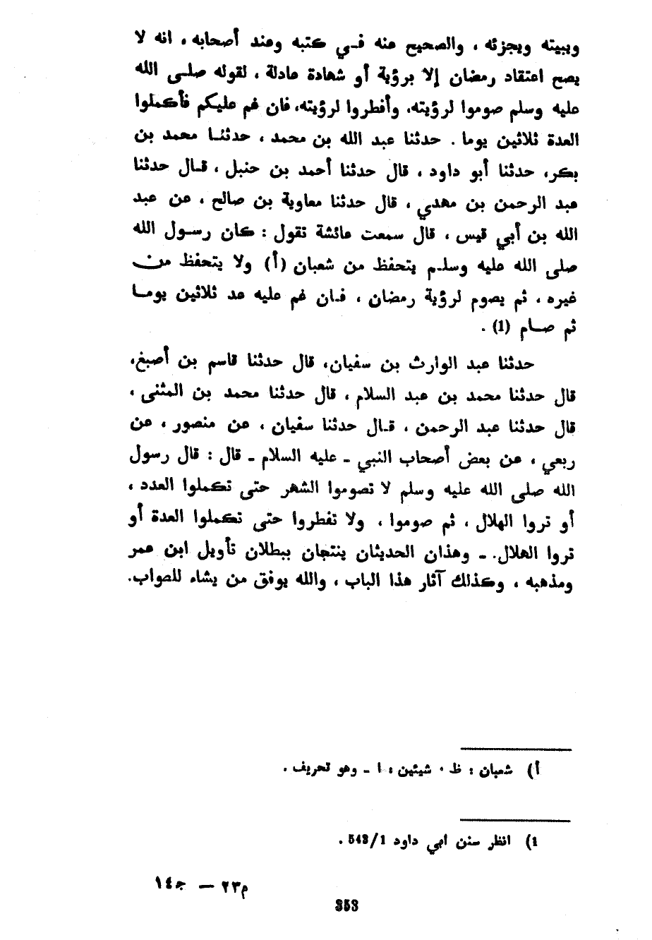 وَيُبَيِّتَهُ وَيُجْزِئَهُ وَالصَّحِيحُ عَنْهُ فِي كُتُبِهِ وَعِنْدَ أَصْحَابِهِ أَنَّهُ لَا يَصِحُّ اعْتِقَادُ رَمَضَانَ إِلَّا بِرُؤْيَةٍ أَوْ شَهَادَةٍ عَادِلَةٍ لِقَوْلِهِ صَلَّى اللَّهُ عَلَيْهِ وَسَلَّمَ صُومُوا لِرُؤْيَتِهِ وَأَفْطِرُوا لِرُؤْيَتِهِ فَإِنْ غُمَّ عَلَيْكُمْ فَأَكْمِلُوا الْعِدَّةَ ثَلَاثِينَ يَوْمًا حَدَّثَنَا عَبْدُ اللَّهِ بْنُ مُحَمَّدٍ حَدَّثَنَا مُحَمَّدُ بْنُ بَكْرٍ حَدَّثَنَا أَبُو دَاوُدَ قَالَ حَدَّثَنَا أَحْمَدُ بْنُ حَنْبَلٍ قَالَ حَدَّثَنَا عَبْدُ الرَّحْمَنِ بْنُ مَهْدِيٍّ قَالَ حَدَّثَنَا مُعَاوِيَةُ بْنُ صَالِحٍ عَنْ عَبْدِ اللَّهِ بْنِ أَبِي قَيْسٍ قَالَ سَمِعْتُ عَائِشَةَ تَقُولُ كَانَ رَسُولُ اللَّهِ صَلَّى اللَّهُ عَلَيْهِ وَسَلَّمَ يَتَحَفَّظُ مِنْ شَعْبَانَ وَلَا يَتَحَفَّظُ مِنْ غَيْرِهِ ثُمَّ يَصُومُ لِرُؤْيَةِ رَمَضَانَ فَإِنْ غم عليه ثَلَاثِينَ يَوْمًا ثُمَّ صَامَ حَدَّثَنَا عَبْدُ الْوَارِثِ بْنُ سُفْيَانَ قَالَ حَدَّثَنَا قَاسِمُ بْنُ أَصْبَغَ قَالَ حَدَّثَنَا مُحَمَّدُ بْنُ عَبْدِ السَّلَامِ قَالَ حَدَّثَنَا مُحَمَّدُ بْنُ الْمُثَنَّى قَالَ حَدَّثَنَا عَبْدُ الرَّحْمَنِ قَالَ حَدَّثَنَا سُفْيَانُ عَنْ مَنْصُورٍ عَنْ رِبْعِيٍّ عَنْ بَعْضِ أَصْحَابِ النَّبِيِّ عَلَيْهِ السَّلَامُ قَالَ قَالَ رَسُولُ اللَّهِ صَلَّى اللَّهُ عَلَيْهِ وَسَلَّمَ لَا تَصُومُوا الشَّهْرَ حَتَّى تُكْمِلُوا الْعَدَدَ أَوْ تَرَوْا الْهِلَالَ ثُمَّ صُومُوا وَلَا تُفْطِرُوا حَتَّى تُكْمِلُوا الْعِدَّةَ أَوْ تَرَوْا الْهِلَالَ وَهَذَانِ الْحَدِيثَانِ يَنْتِجَانِ بِبُطْلَانِ تَأْوِيلِ ابْنِ عُمَرَ وَمَذْهَبِهِ وَكَذَلِكَ آثَارُ هَذَا الْبَابِ وَاللَّهِ يُوَفِّقُ مَنْ يشاء للصواب