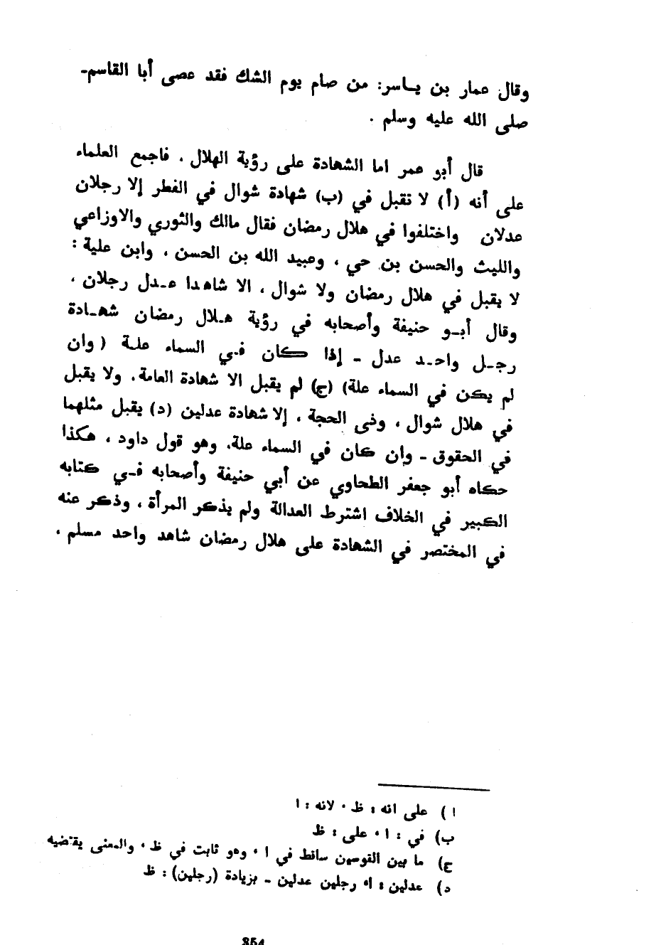 وَقَالَ عَمَّارُ بْنُ يَاسِرٍ مَنْ صَامَ يَوْمَ الشَّكِّ فَقَدْ عَصَى أَبَا الْقَاسِمِ صَلَّى اللَّهُ عَلَيْهِ وَسَلَّمَ قَالَ أَبُو عُمَرَ أَمَّا الشَّهَادَةُ عَلَى رُؤْيَةِ الْهِلَالِ فَأَجْمَعَ الْعُلَمَاءُ عَلَى أَنَّهُ لَا تُقْبَلُ فِي شَهَادَةِ شَوَّالٍ فِي الْفِطْرِ إِلَّا رَجُلَانِ عَدْلَانِ وَاخْتَلَفُوا فِي هِلَالِ رَمَضَانَ فقال مالك والثوري والأوزاعي والليث وَالْحَسَنُ بْنُ حَيٍّ وَعُبَيْدُ اللَّهِ بْنُ الْحَسَنِ وَابْنُ عُلَيَّةَ لَا يُقْبَلُ فِي هِلَالِ رَمَضَانَ وَلَا شَوَّالٍ إِلَّا شَاهِدَا عَدْلٍ رَجُلَانِ وَقَالَ أَبُو حَنِيفَةَ وَأَصْحَابُهُ فِي رُؤْيَةِ هِلَالِ رَمَضَانَ شَهَادَةُ رَجُلٍ وَاحِدٍ عَدْلٍ إِذَا كَانَ فِي السَّمَاءِ عِلَّةٌ (وَإِنْ لَمْ يَكُنْ فِي السَّمَاءِ علة) (ج) لَمْ يَقْبَلْ إِلَّا شَهَادَةَ الْعَامَّةِ وَلَا يَقْبَلُ فِي هِلَالِ شَوَّالٍ وَذِي الْحِجَّةِ إِلَّا شَهَادَةَ عَدْلَيْنِ يُقْبَلُ مِثْلُهُمَا فِي الْحُقُوقِ وَإِنْ كَانَ فِي السَّمَاءِ عِلَّةً وَهُوَ قَوْلُ دَاوُدَ هَكَذَا حَكَاهُ أَبُو جَعْفَرٍ الطَّحَاوِيُّ عَنْ أَبِي حَنِيفَةَ وَأَصْحَابِهِ فِي كِتَابِهِ الْكَبِيرِ فِي الْخِلَافِ اشْتَرَطَ الْعَدَالَةَ وَلَمْ يَذْكُرِ الْمَرْأَةَ وَذُكِرَ عَنْهُ فِي المختصر فِي الشَّهَادَةِ عَلَى هِلَالِ رَمَضَانَ شَاهِدٌ وَاحِدٌ مسلم